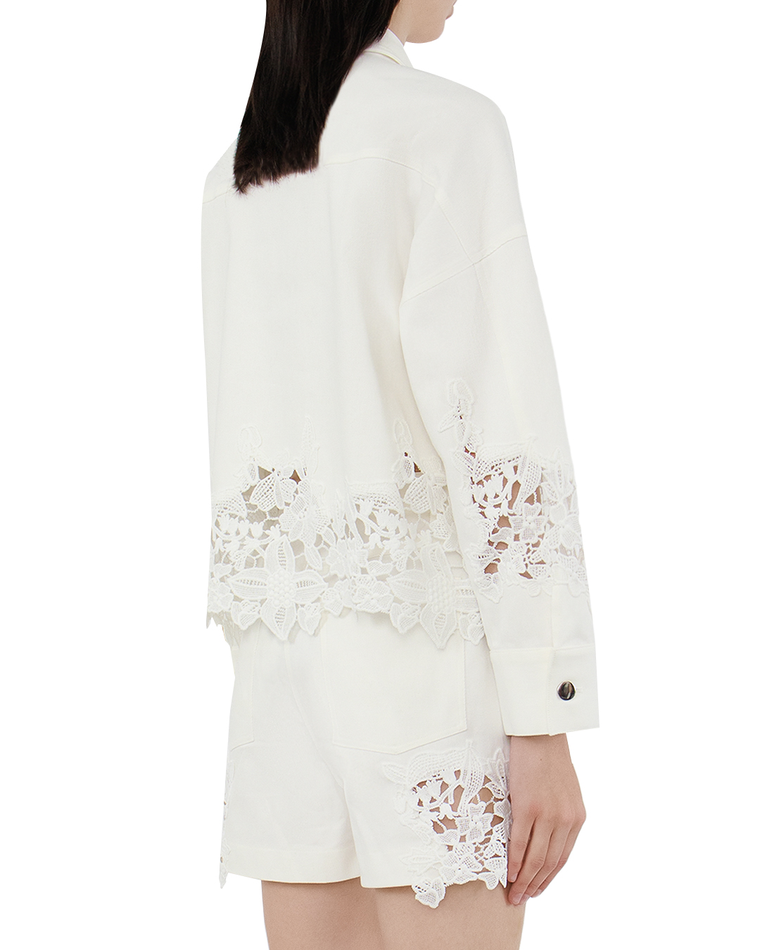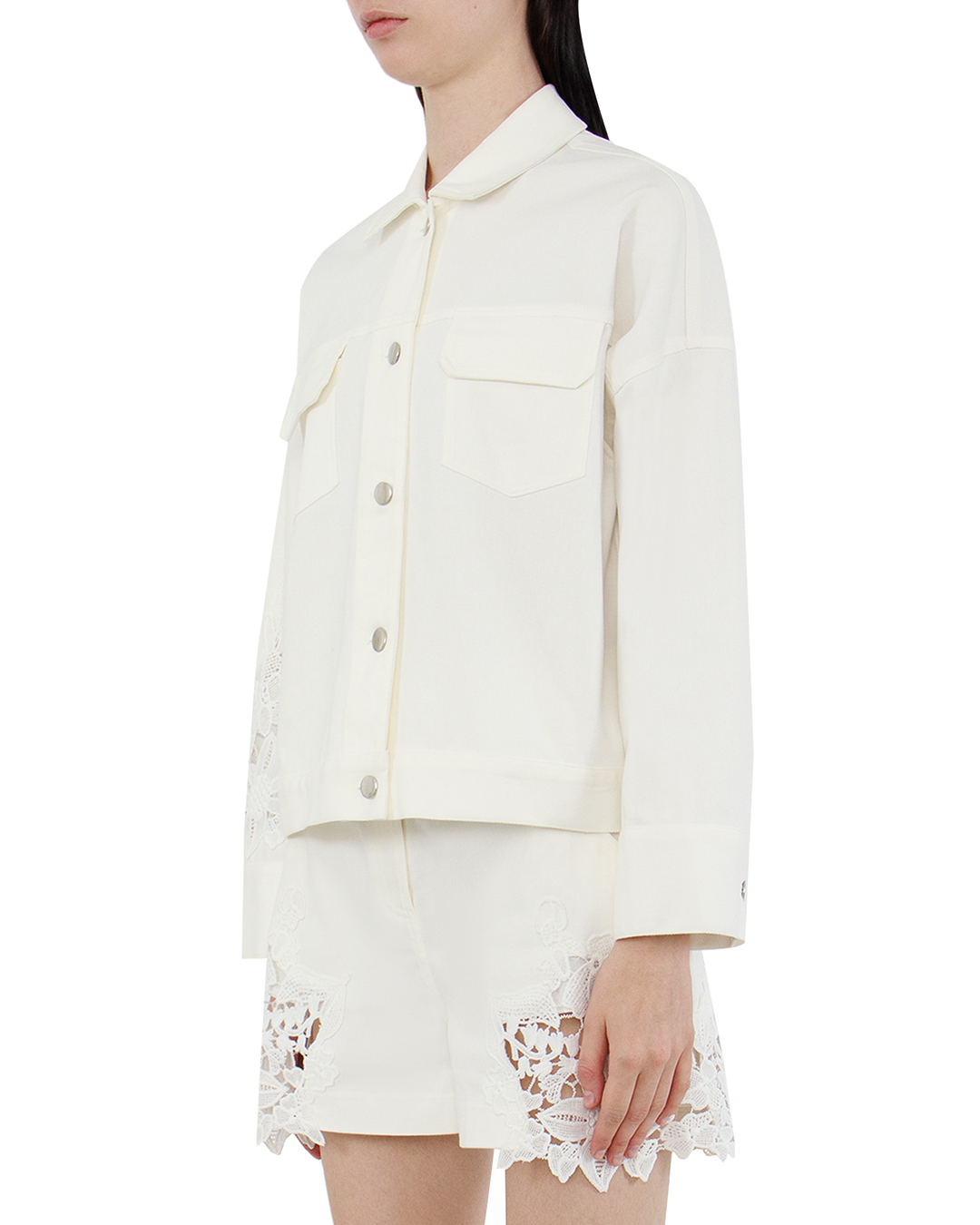 Эта рубашка — воплощение современного стиля с изысканным акцентом. Чистый белый цвет создает базу для утонченной игры текстур и деталей, которые выделяют это изделие. Отложной воротник придает классическую элегантность, а прямой крой обеспечивает современный силуэт, подходящий для различных случаев — от деловых до повседневных. Эффектные металлические кнопки добавляют современную нотку и создают контраст, привнося динамику в общий облик рубашки. Два нагрудных кармана с клапанами не только практичны, но и вносят элемент структуры и графичности. Особое внимание привлекает ажурная вышивка на рукавах. Это деталь добавляет романтичности и подчеркивает индивидуальность, делая рубашку не просто повседневной, а наполненной художественным выражением. Качественная ткань и внимание к деталям делают эту рубашку идеальным элементом гардероба, подчеркивающим ваш изысканный вкус и способность сочетать классику с актуальными трендами.