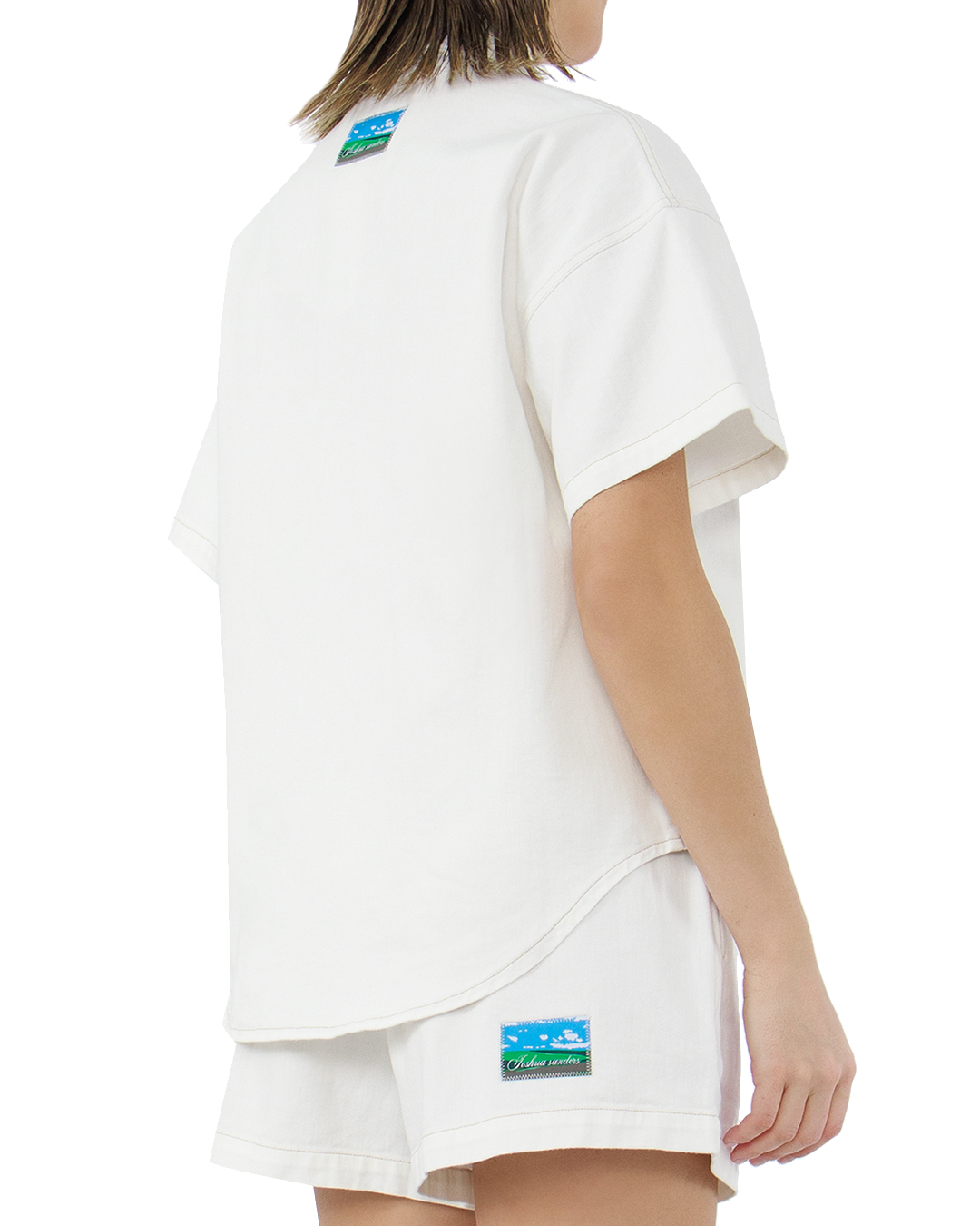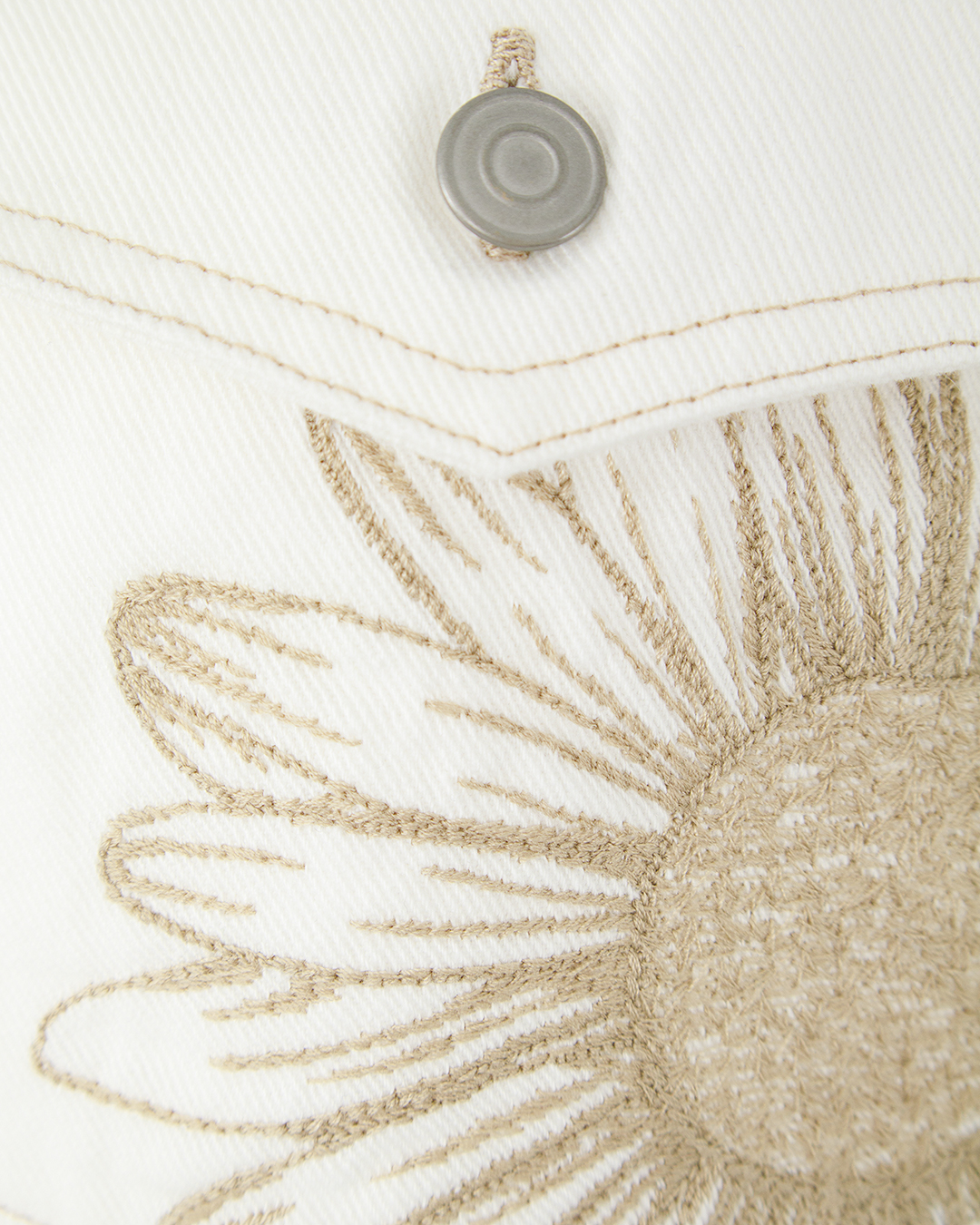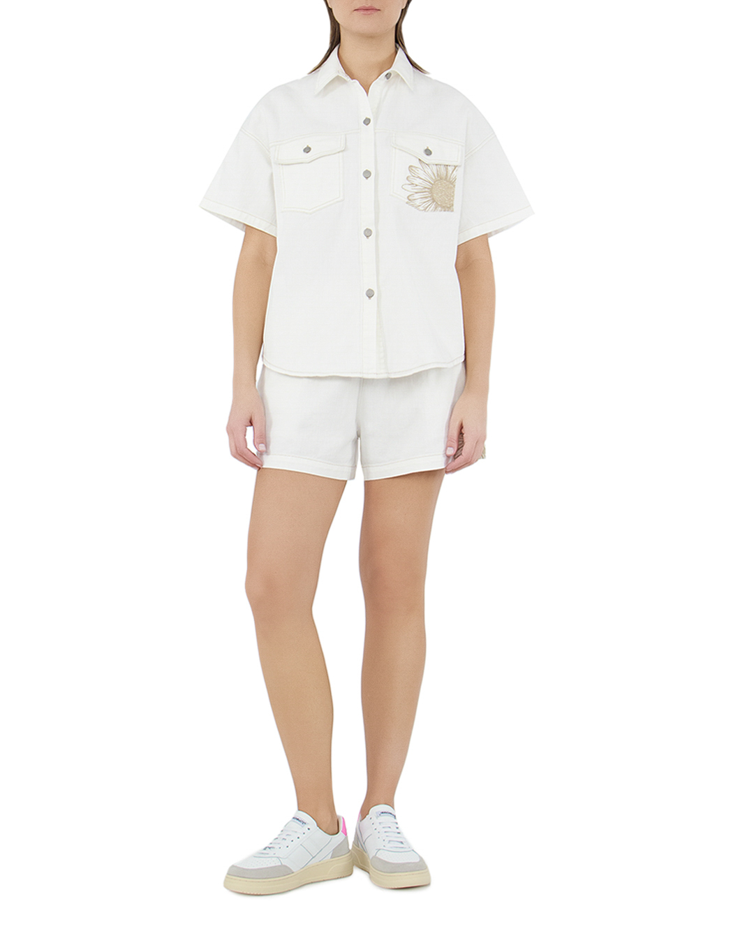 Прямую джинсовую рубашку с разноцветным патчем сзади выполнили из хлопка. Один из двух нагрудных карманов украсили вышивкой в виде цветка. Предлагаем сочетать модель с парными шортами.
