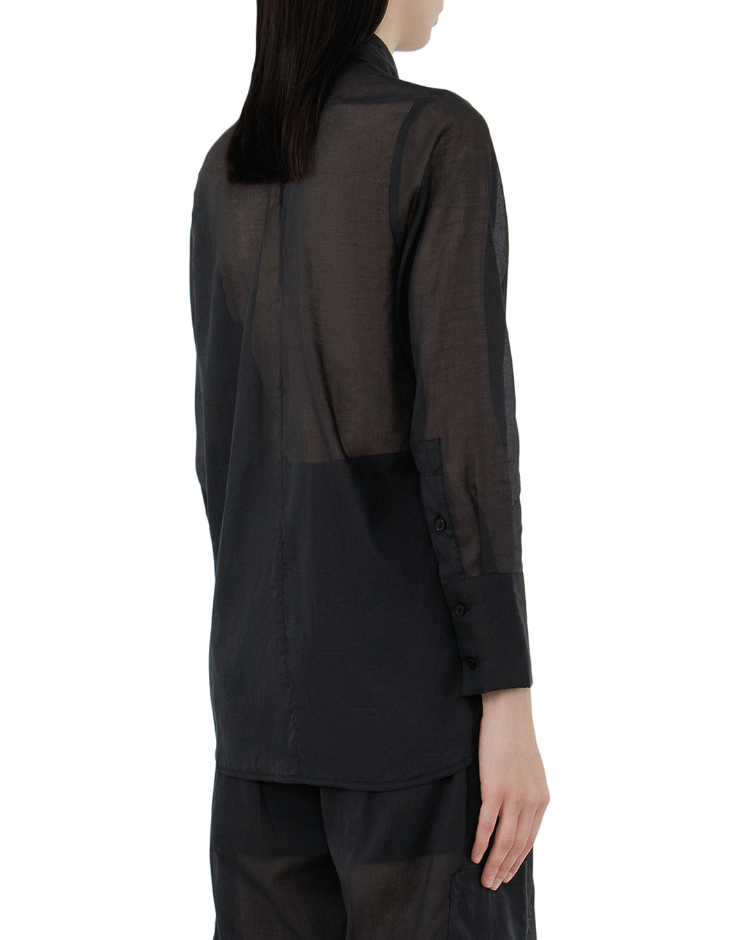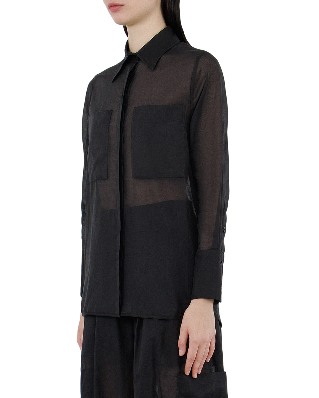 Эта рубашка — воплощение утончённой современности и лёгкости, выполненная из полупрозрачного материала, который создаёт чувственный и одновременно изысканный образ. Сочетание структурированных элементов и воздушной ткани придаёт ей уникальный характер. Классический отложной воротник акцентирует внимание на шее и придаёт образу строгость и утонченность. Длинные рукава с декоративными манжетами создают элегантный силуэт, подходящий как для деловых, так и для вечерних выходов. Особое внимание привлекают крупные нагрудные карманы, добавляющие объёма и функциональности, при этом оставаясь стильным акцентом. Декоративные детали, такие как скрытая застёжка на пуговицы, подчёркивают минималистичный характер рубашки, создавая гармоничное сочетание со смелыми линиями. Эта рубашка станет ключевым элементом гардероба, легко комбинируемая с различными аксессуарами и предметами одежды для создания эффектных и запоминающихся образов.