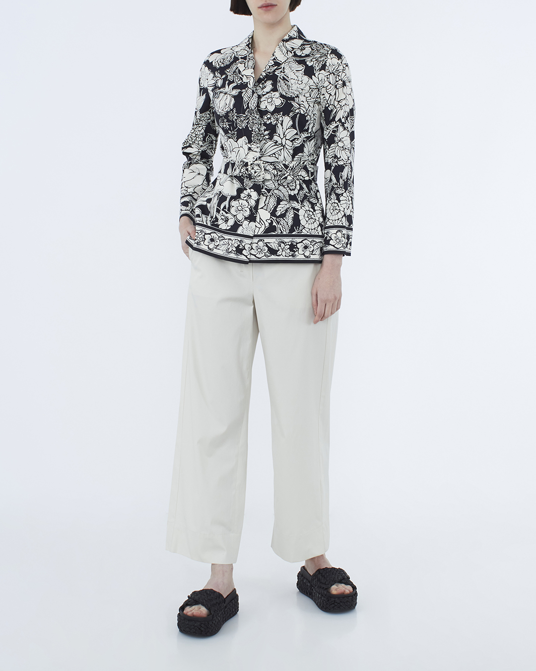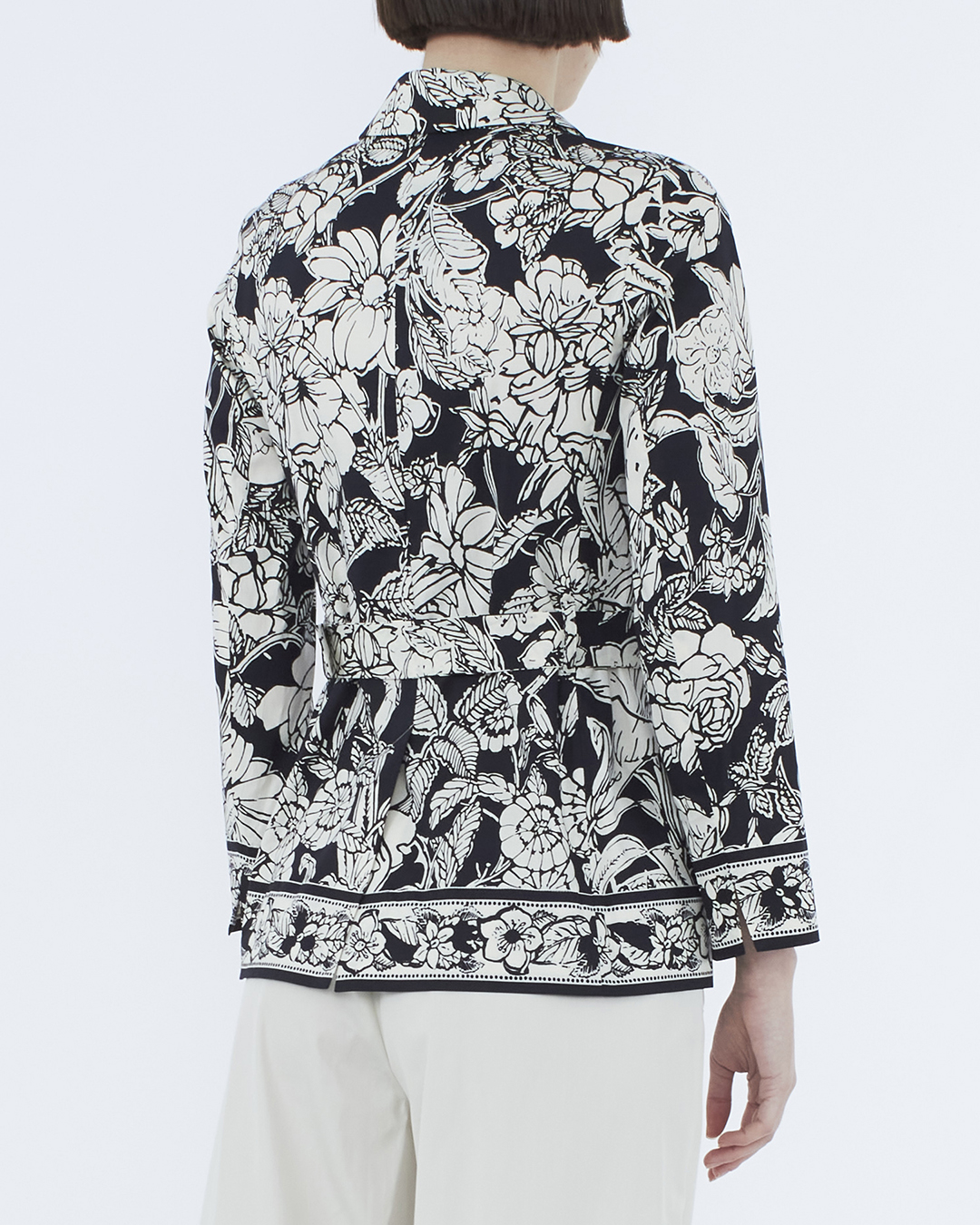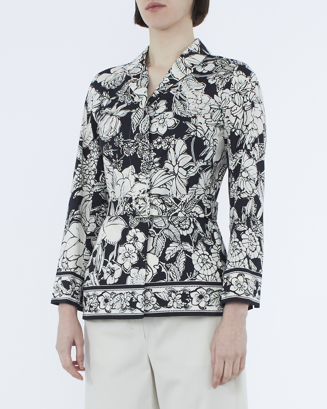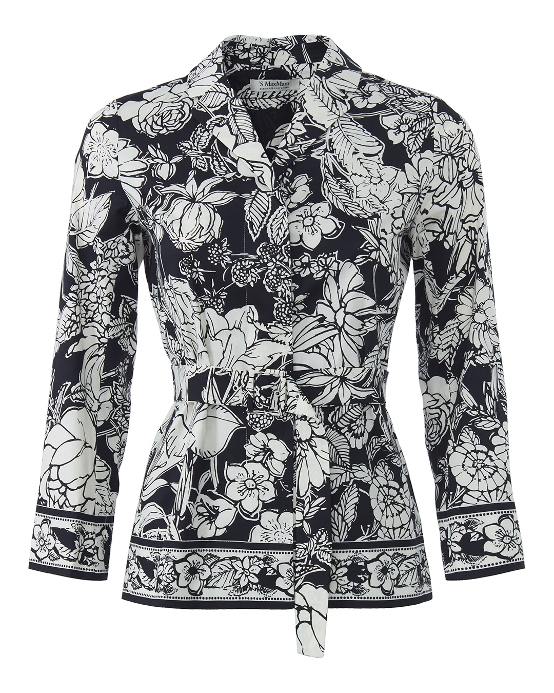 Рубашка Max Mara сшили из хлопка черного цвета с цветочным принтом. Модель приталенного силуэта с поясом из основного материала.