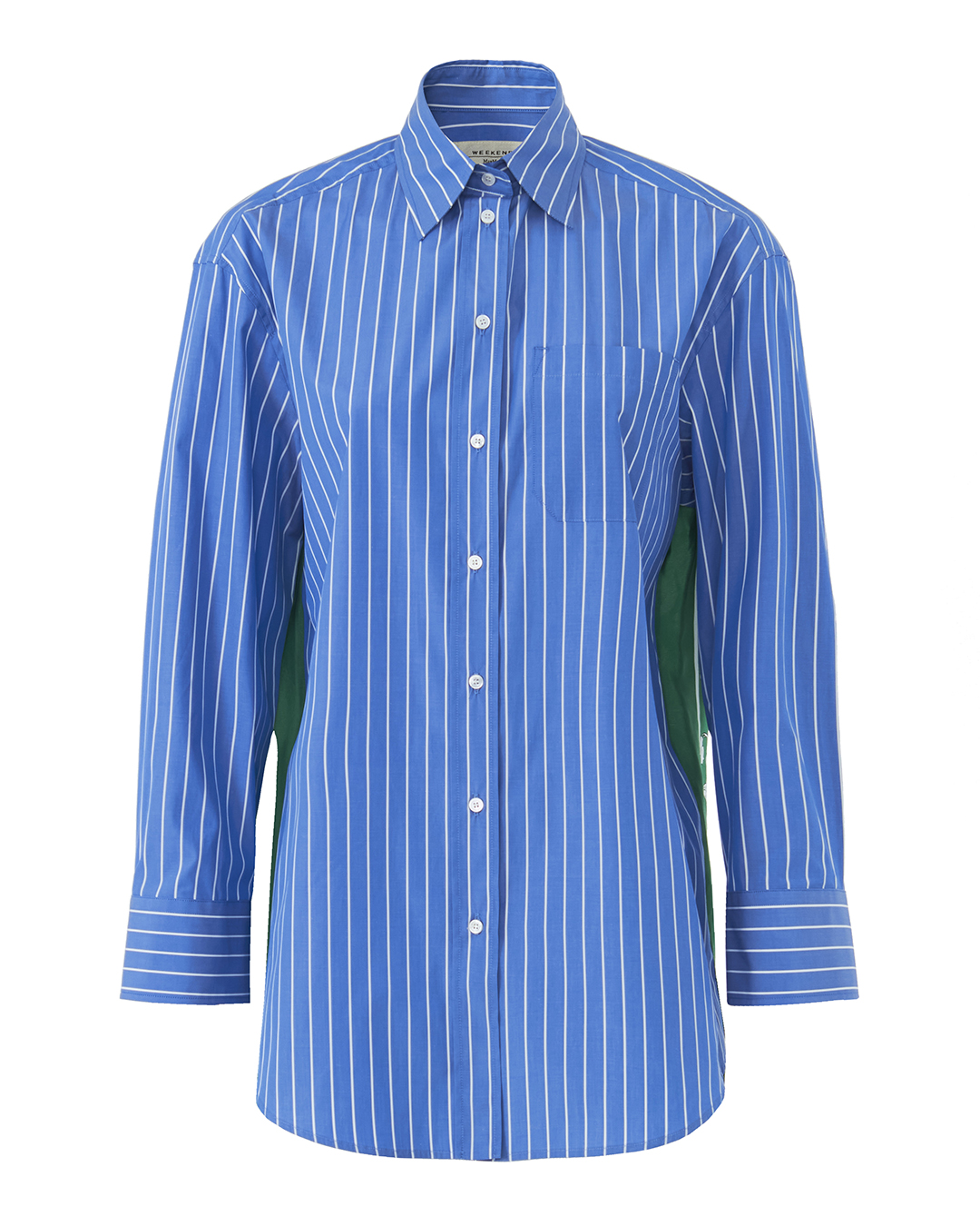 Рубашка Max Mara Weekend сшита из хлопка темно-синего оттенка в полоску. Прямой свободный силуэт с застежкой на пуговицы дополнен спущенной линией плеч и длинными рукавами. Рубашка с накладным карманом и принтом на спине.