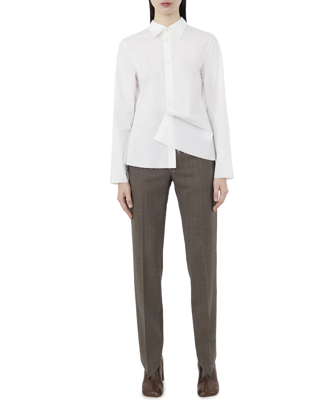 Эта рубашка — образец классического стиля с современными акцентами, воплощающий изящество и сдержанность. Созданная из первоклассного хлопка, она обеспечивает невесомое ощущение комфорта и свободы движения. Белый цвет придаёт изделию свежесть и универсальность, позволяя легко комбинировать его с любым гардеробом. Воротник остроконечной формы добавляет изысканности и строгости, подчеркивая линию шеи. Пуговицы с жемчужным отливом красиво контрастируют с тканью, создавая утонченные акценты. Это элемент, который придаёт рубашке нотку роскоши и внимания к мелким деталям. Главным акцентом этой модели становится необработанный край, который добавляет стильного дерзновения и лёгкой небрежности, сохраняя баланс между строгостью и креативностью. Простой прямой крой подчеркивает природную линию фигуры, позволяя рубашке оставаться вне времени и модных тенденций. Она станет идеальным выбором как для делового стиля, так и для более расслабленных образов, подчеркивая вашу индивидуальность и вкусовые предпочтения.
