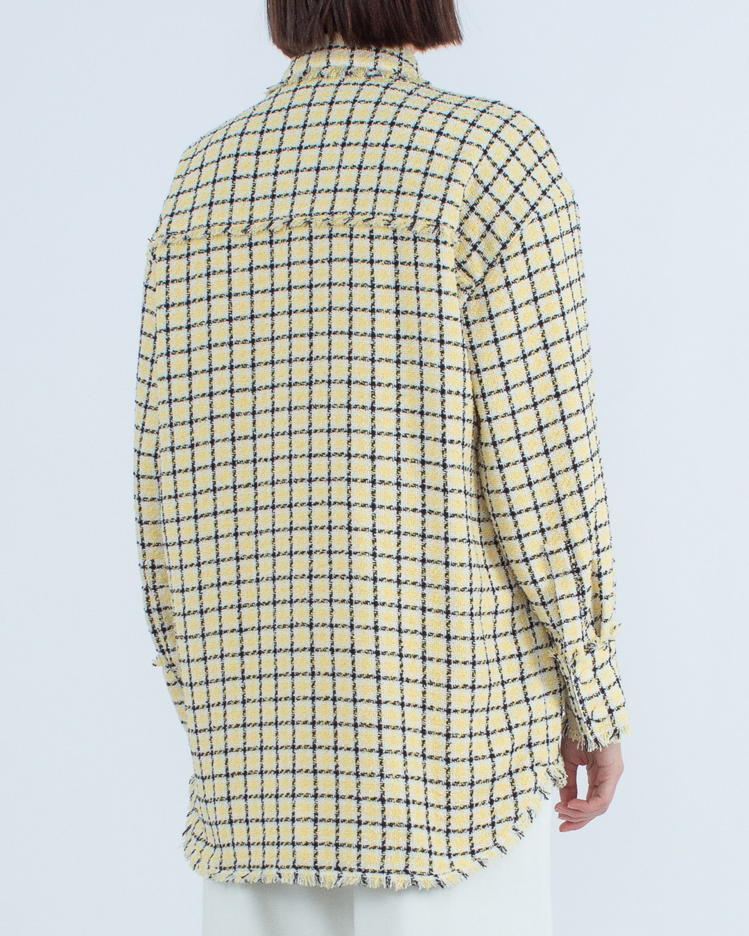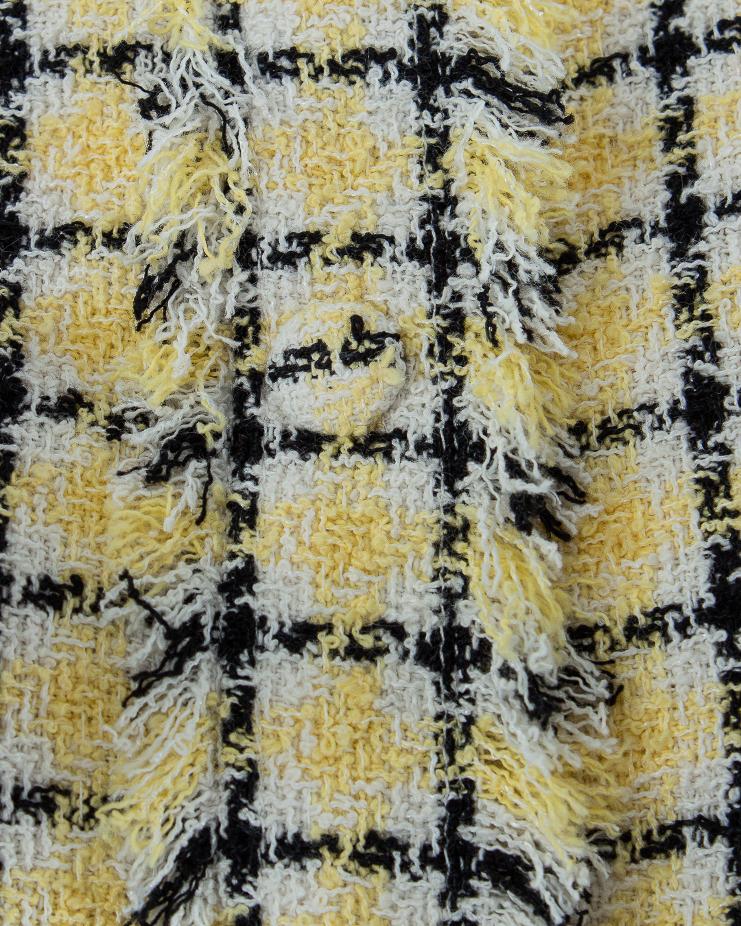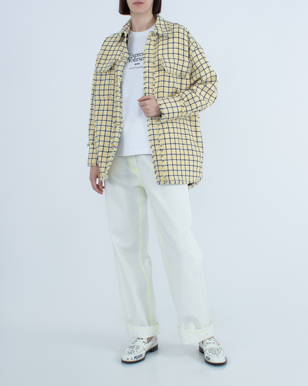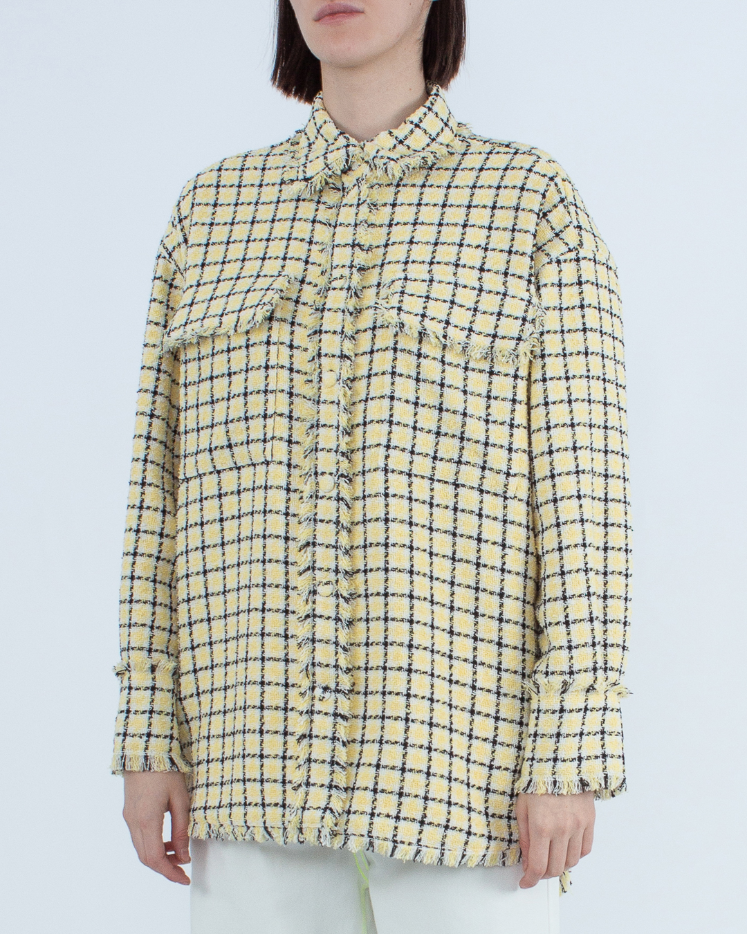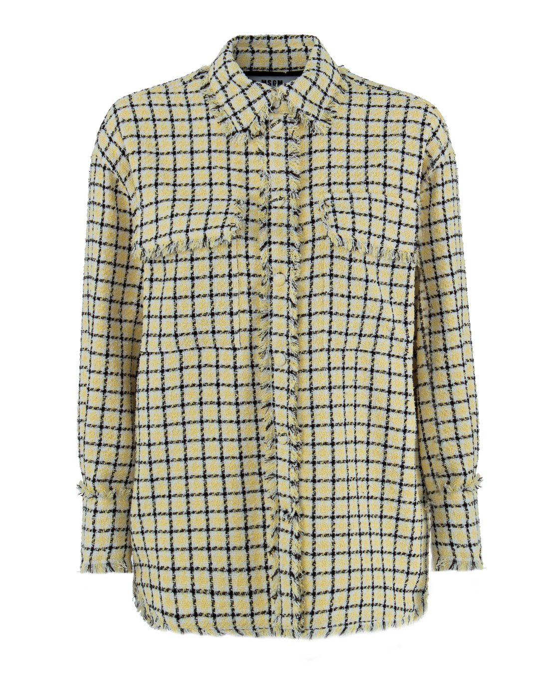 Рубашка MSGM из хлопкового букле желтого оттенка в клетку. Модель прямого свободного силуэта с застежкой на планку и пуговицы. Изделие дополнено накладными карманами, отложным воротником и спущенной линией плеч с длинными рукавами. Рубашка с отделкой бахромой.