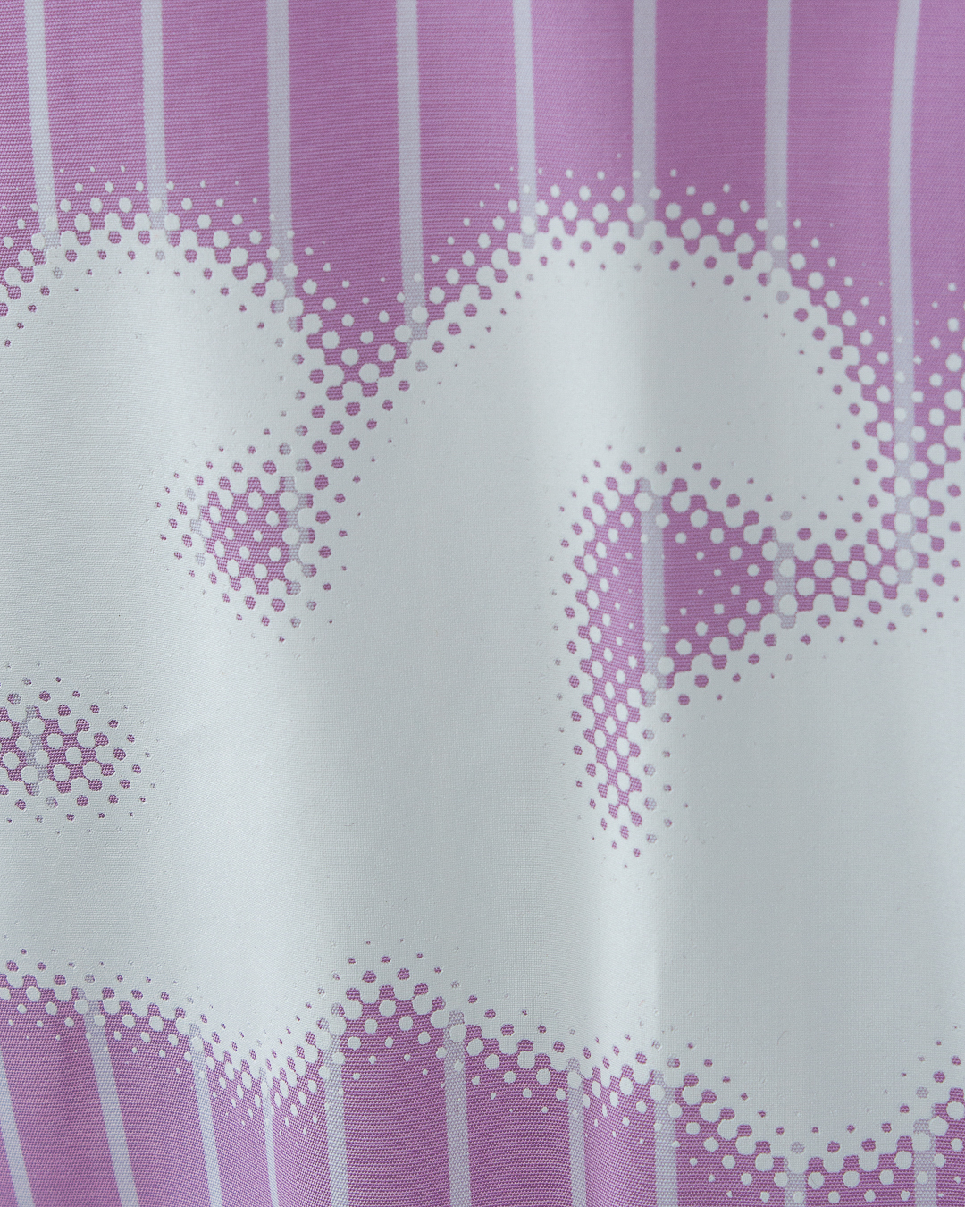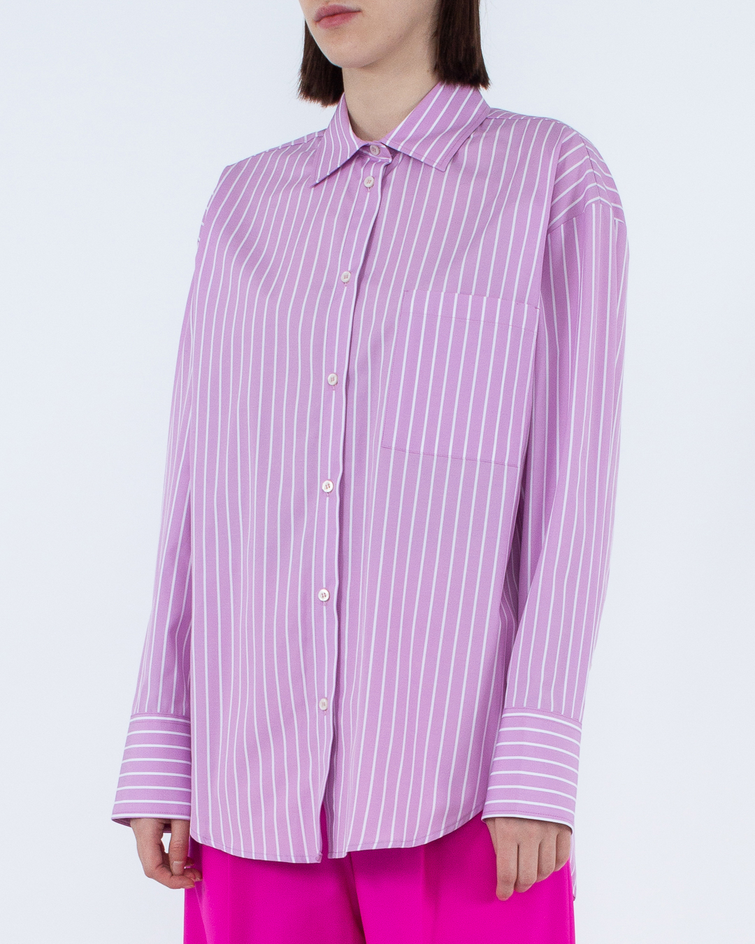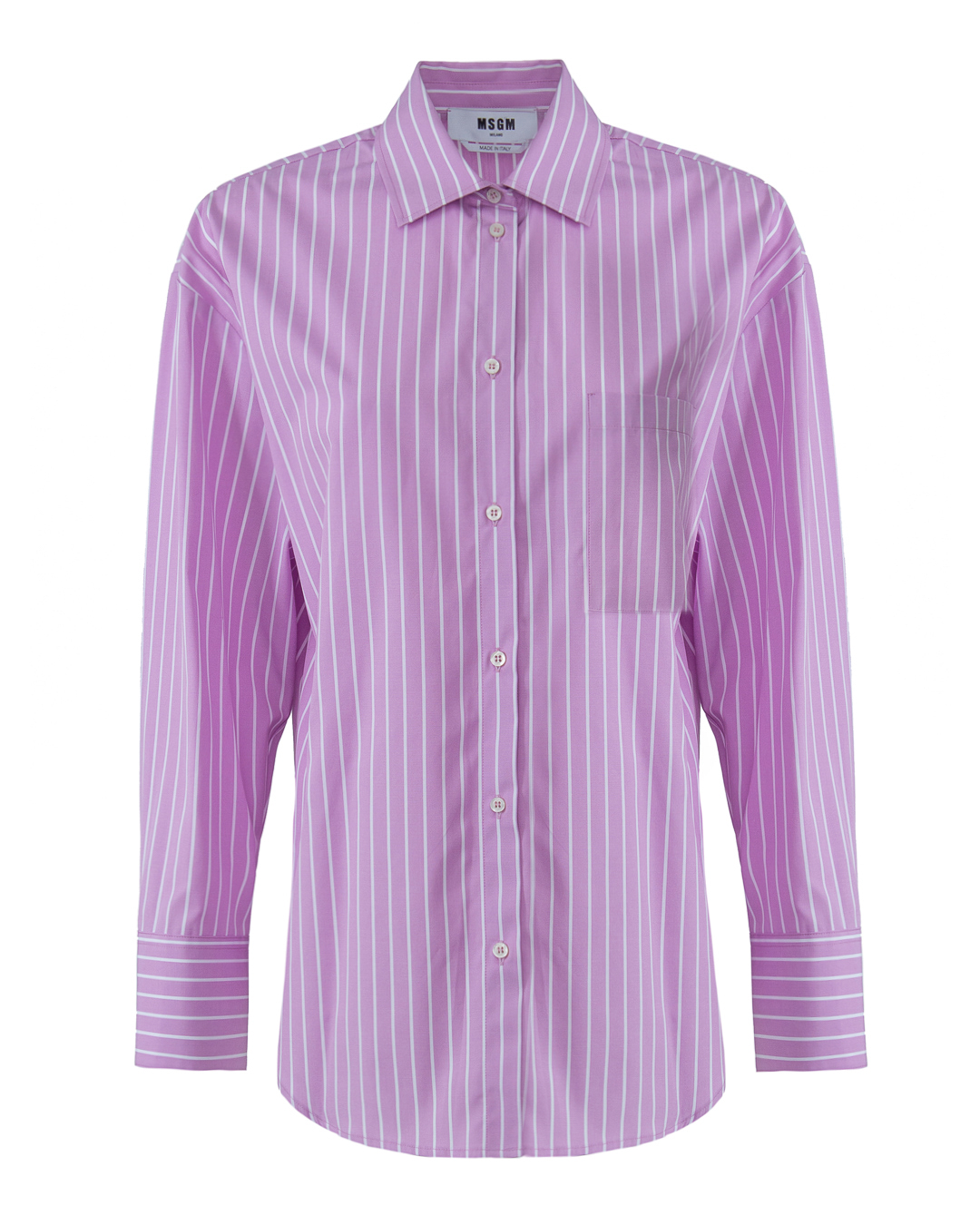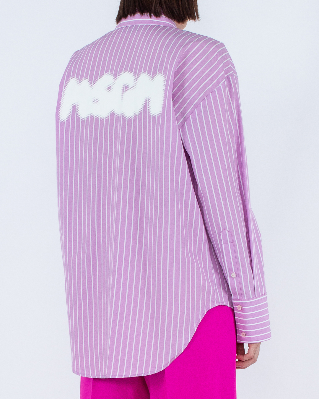 Рубашка из хлопка розового оттенка в полоску с принтом логотипа бренда. Модель прямого силуэта с застежкой на пуговицы и отложным воротником с удлиненной и закругленной линией спины.