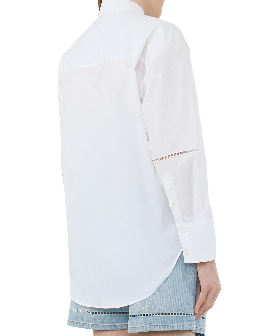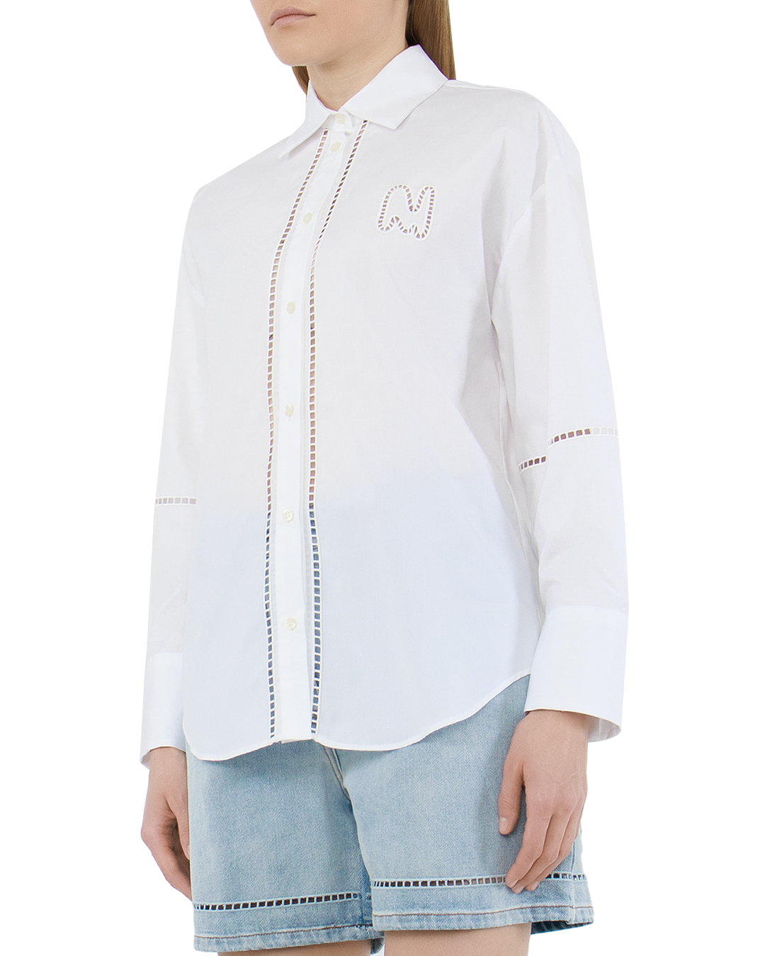 Базовый элемент с акцентом: белая хлопковая рубашка с объемным силуэтом и декоративной буквой «М» — стильная интерпретация классики. Приятная на ощупь ткань и расслабленный крой делают ее идеальной для многослойных образов.