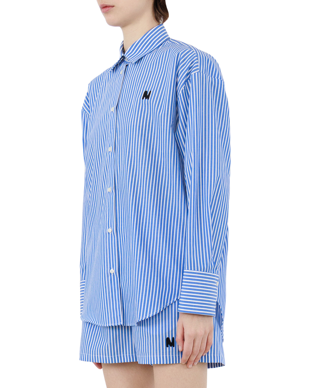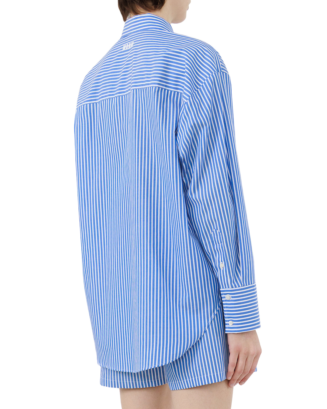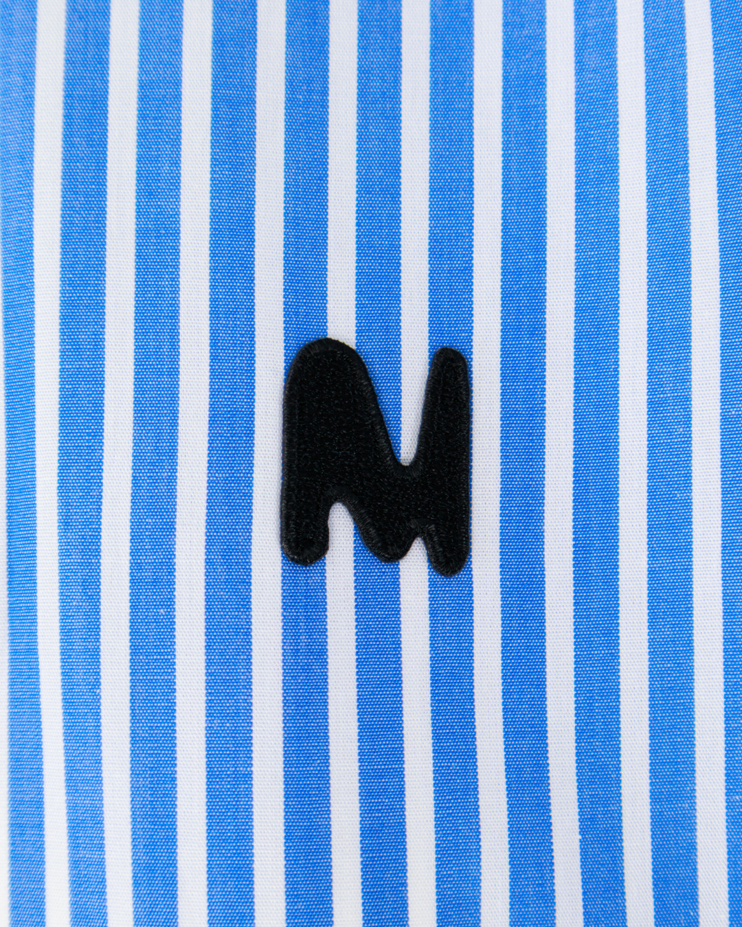 Эта классическая рубашка в сине-белую полоску — воплощение элегантной непринуждённости. Прямой крой с лёгкой приталенностью создаёт сбалансированный силуэт, который одинаково хорошо смотрится как в деловом, так и в повседневном образе. Отложной воротник с чёткими линиями подчёркивает линию шеи, добавляя образу собранности и утончённости. Вертикальная полоска визуально вытягивает фигуру, придавая ей стройность, а контрастное сочетание синего и белого делает модель яркой, но не вычурной. Пуговицы светлого оттенка органично вписаны в дизайн, не отвлекая внимание от основного рисунка, при этом обеспечивают удобную застёжку. Манжеты оформлены в том же полосатом ритме, что и основная часть изделия, создавая ощущение цельности и продуманности дизайна. Небольшой вышитый логотип на груди служит изысканным акцентом, подчёркивающим принадлежность к премиальному стилю, но не перегружает образ. Низ рубашки оформлен с лёгкой асимметрией — удлинённый задний край добавляет современности классическому фасону. Все швы выполнены аккуратно, отстрочка ровная, что свидетельствует о высоком качестве пошива. Эта рубашка — не просто элемент гардероба, а выразительный штрих, способный преобразить любой образ, добавив ему свежести и стиля.