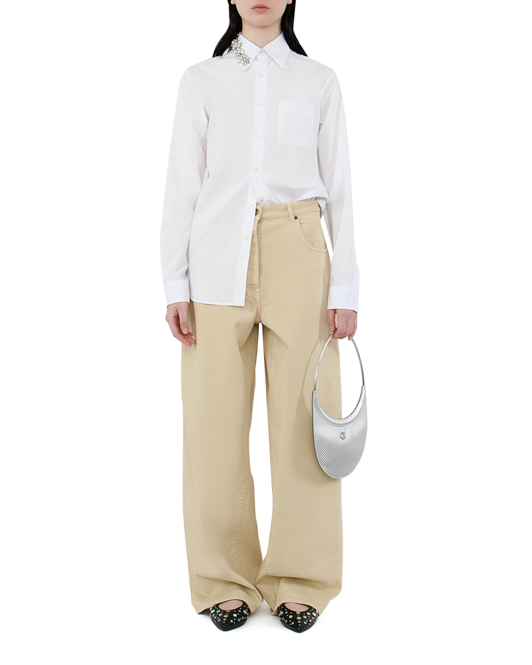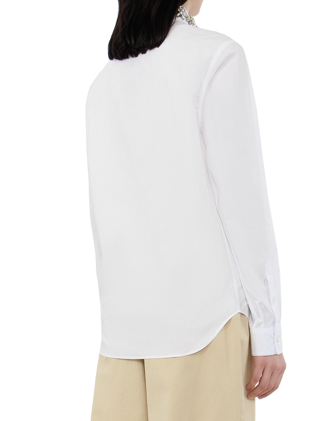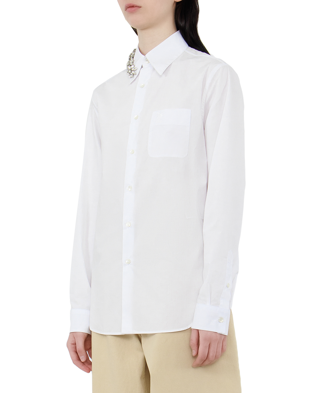 Блуза №21 — это идеальная интерпретация классики с современным акцентом, воплощенная в белоснежной палитре. Изготовленная из высококачественной ткани, она обеспечивает безупречную посадку и комфорт. Элегантный приталенный крой подчеркивает изящество фигуры, а классический отложной воротник придаёт образу строгую изысканность. Декоративная вышивка из страз на одной стороне воротника добавляет оригинальности и эффектного блеска, создавая неповторимый акцент. Нагрудный карман и центральная застежка на пуговицы поддерживают традиционную эстетику блузы, придавая ей универсальность для различных образов — от делового до вечернего. Манжеты с пуговицами завершают композицию, добавляя нотку утонченности. Эта блуза станет идеальной основой для создания стильных и изысканных ансамблей, привнося в них элемент роскошного гламура.