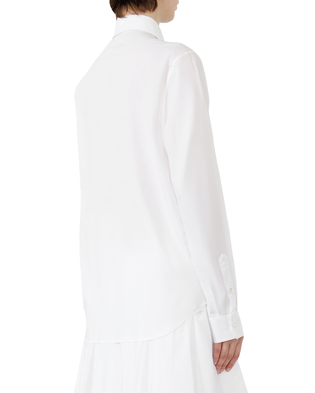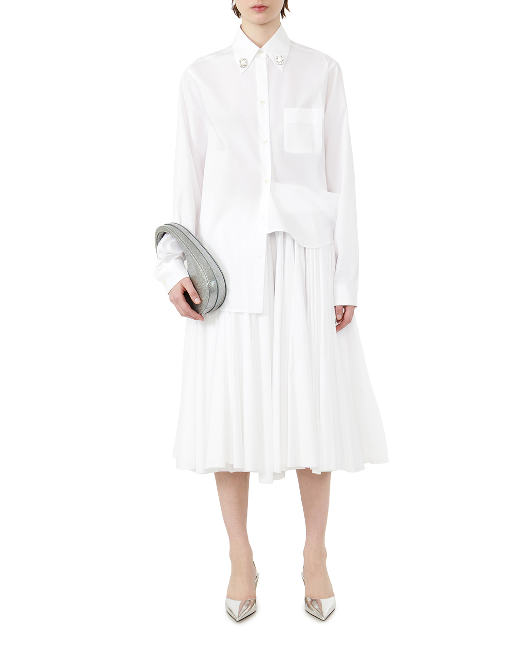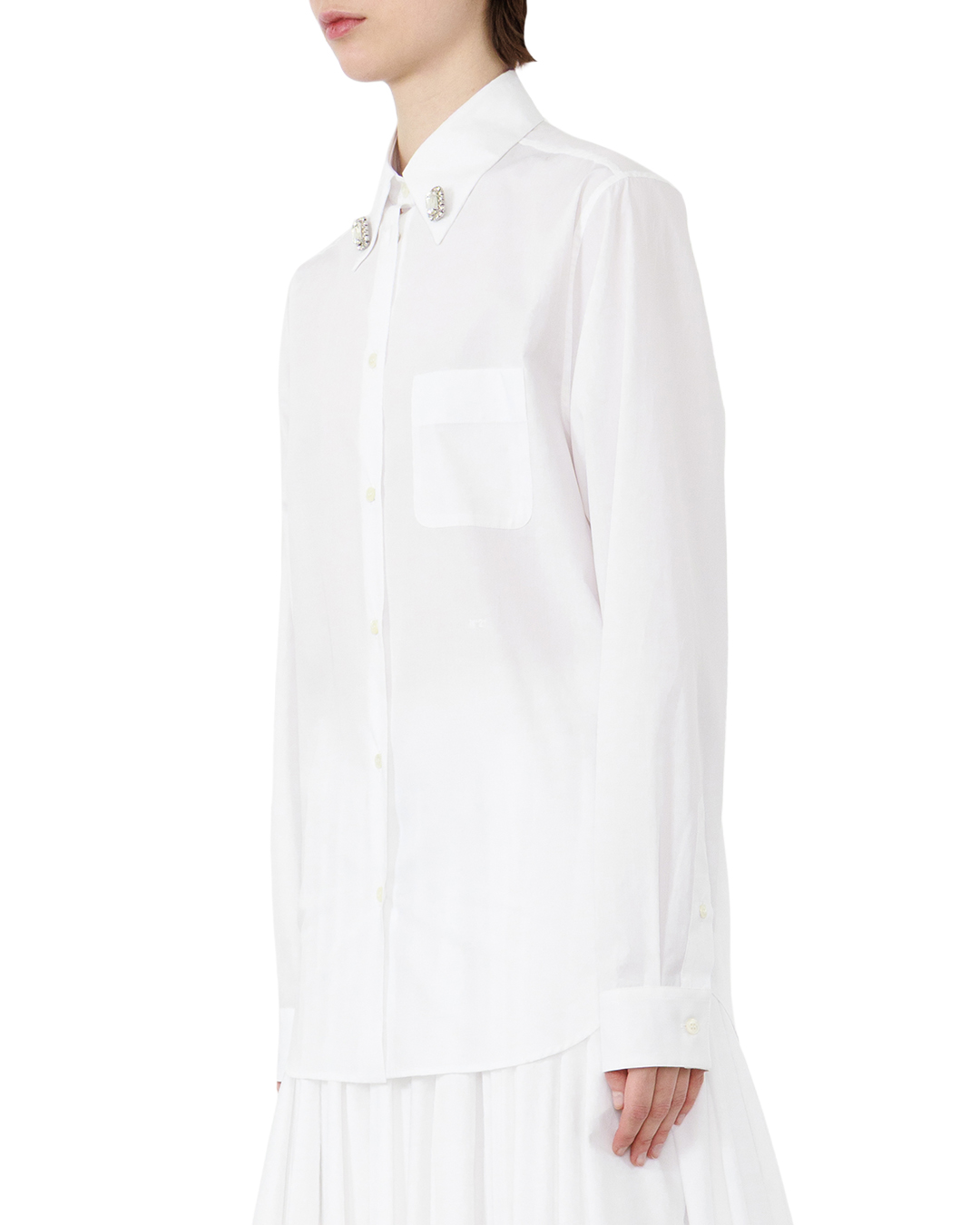 Эта белая рубашка — воплощение изысканной лаконичности и утончённого шика. Классический крой с длинными рукавами создаёт безупречный силуэт, который одинаково уместен как в деловом, так и в повседневном образе. Прямой фасон не сковывает движений, при этом подчёркивает линии фигуры, придавая облику собранность и элегантность. Особая изюминка модели — изысканная отделка воротника. Декоративные элементы с инкрустацией, расположенные по обе стороны, добавляют вещи нотку аристократичности и делают её по-настоящему уникальной. Эти акценты не перегружают образ, а, напротив, придают ему выразительность, превращая обычную рубашку в эффектный элемент гардероба. Планка с пуговицами выполнена в тон основной ткани, что создаёт ощущение цельности и гармонии. Пуговицы аккуратной округлой формы подчёркивают лаконичность дизайна, не отвлекая внимание от главных декоративных акцентов. Слегка удлинённый низ рубашки мягко обрамляет линию бёдер, завершая образ. Продуманная обработка краёв и швов придаёт вещи безупречный вид — здесь нет ни одной небрежной детали, каждая линия выверена с ювелирной точностью. Эта рубашка способна стать основой для множества образов: она легко сочетается с классическими брюками, юбкой-карандашом или даже с джинсами, позволяя создавать как строгие, так и более расслабленные луки. Благодаря изысканным деталям и безупречному крою вещь подчёркивает индивидуальность и хороший вкус своей обладательницы.
