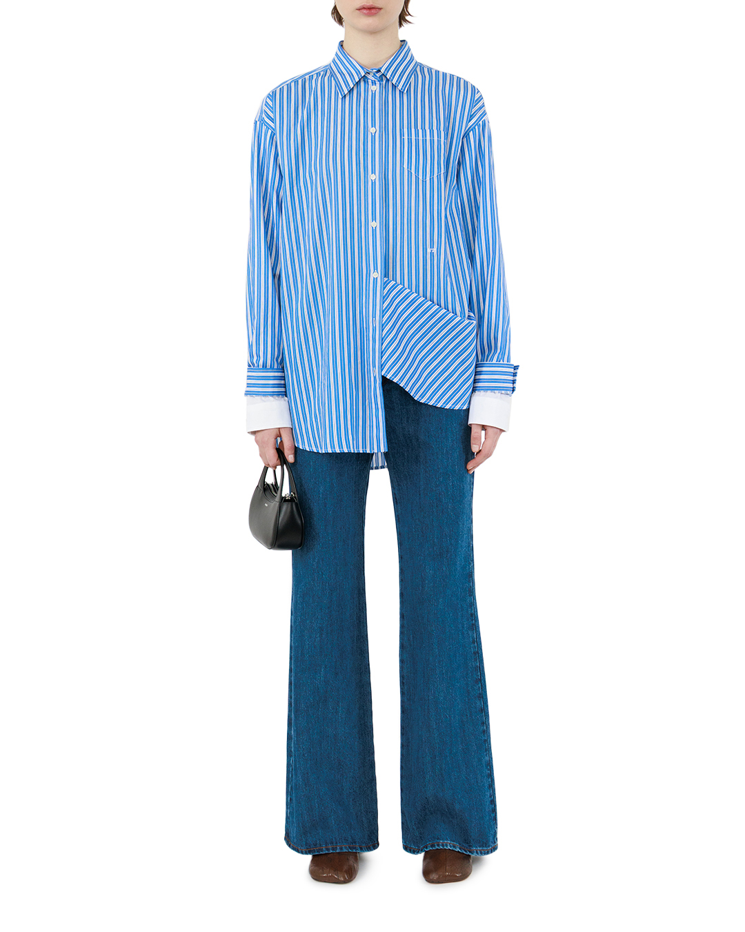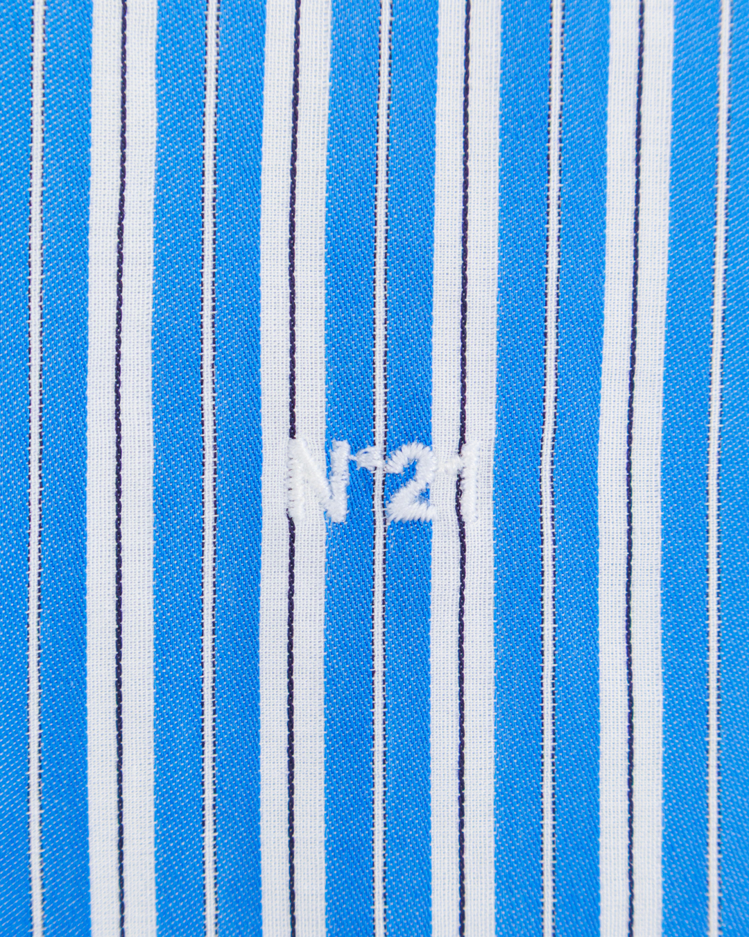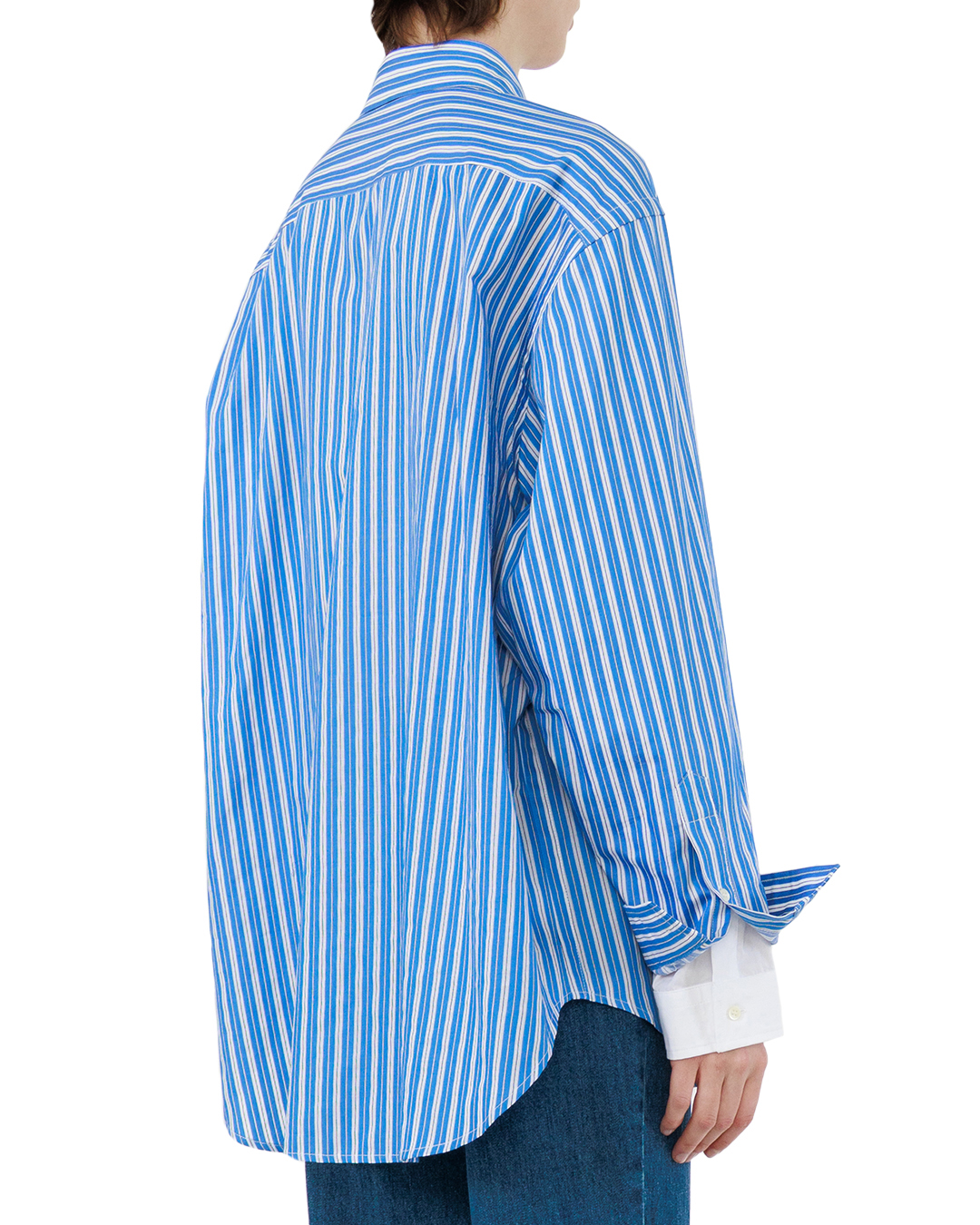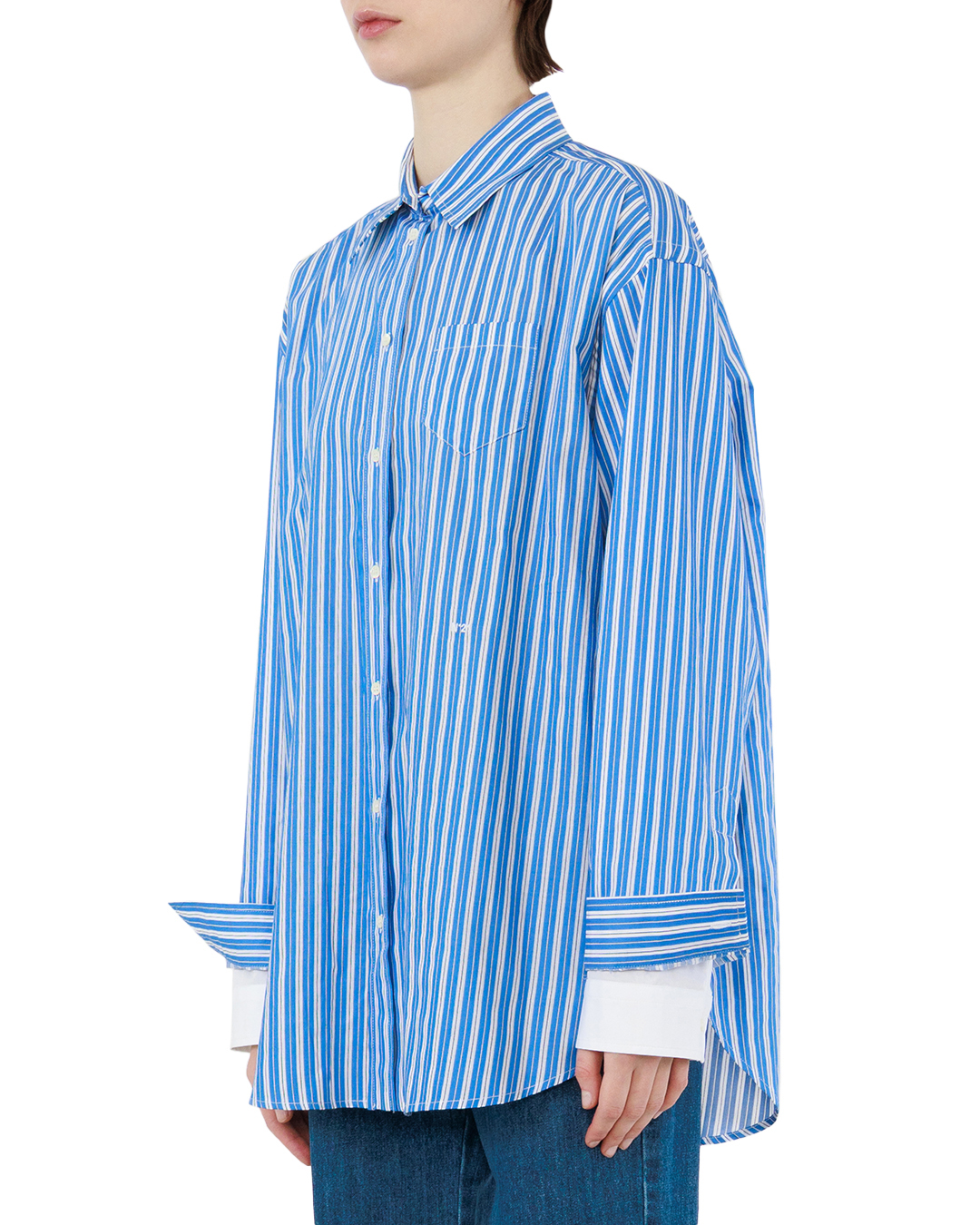 Эта рубашка — воплощение летнего настроения и непринуждённой элегантности. Яркая голубая основа с выразительными белыми вертикальными полосами создаёт динамичный, но гармоничный рисунок, который оживляет образ, не перегружая его. Классический крой с длинными рукавами обеспечивает свободу движений и подчёркивает силуэт, сохраняя при этом нотку формальности. Отложной воротник аккуратно обрамляет шею, придавая облику собранность. Планка с пуговицами выполнена лаконично — пуговицы небольшого размера, округлой формы, идеально сочетаются с общим дизайном, не отвлекая внимания от выразительного принта. Манжеты рубашки продуманы до мелочей: они оформлены с подворотом, который подчёркивает аккуратность вещи. Внутренняя часть манжет выполнена в однотонном белом цвете, что создаёт приятный контраст с основным рисунком и добавляет рубашке изысканности. Низ изделия слегка удлинён и оформлен с лёгкой асимметрией — этот приём придаёт модели современный характер, делая её универсальной для разных образов. Прострочка по швам выполнена аккуратно, без излишнего акцента, что подчёркивает качество пошива. Эта рубашка легко станет центральным элементом гардероба: она одинаково хорошо смотрится как в деловом ансамбле с классическими брюками, так и в более расслабленном образе с джинсами или шортами. Благодаря удачному сочетанию классического кроя и яркого принта вещь позволяет создавать образы с характером, подчёркивая индивидуальность своей обладательницы.