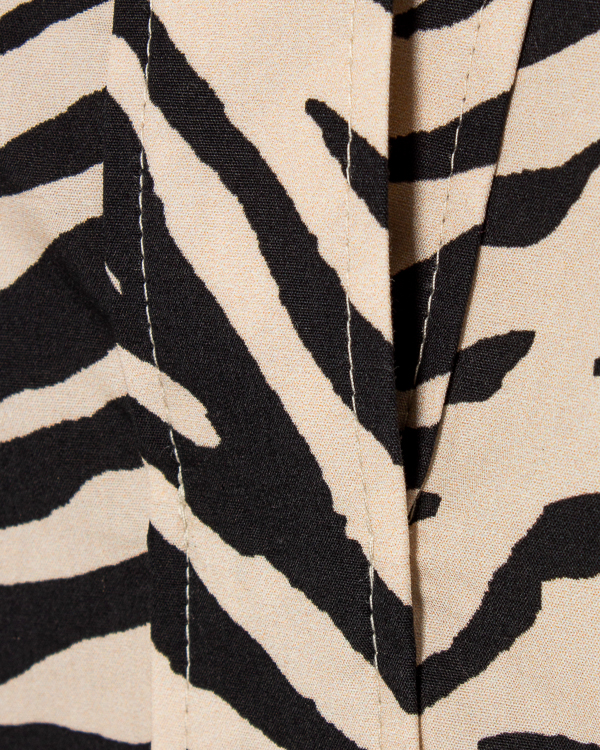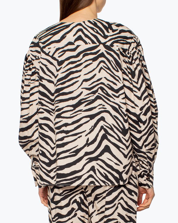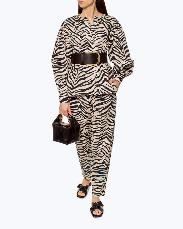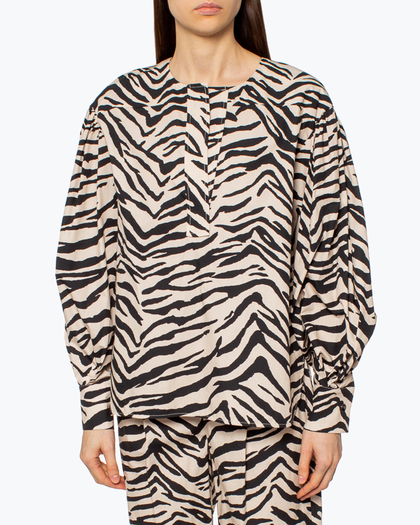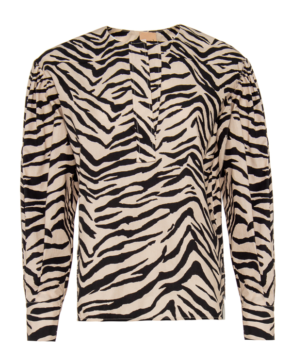 Блуза из хлопка с анималистичным принтом. Модель дополнена завязками на шее, спущенной линией плеч и объемными рукавами с манжетами.