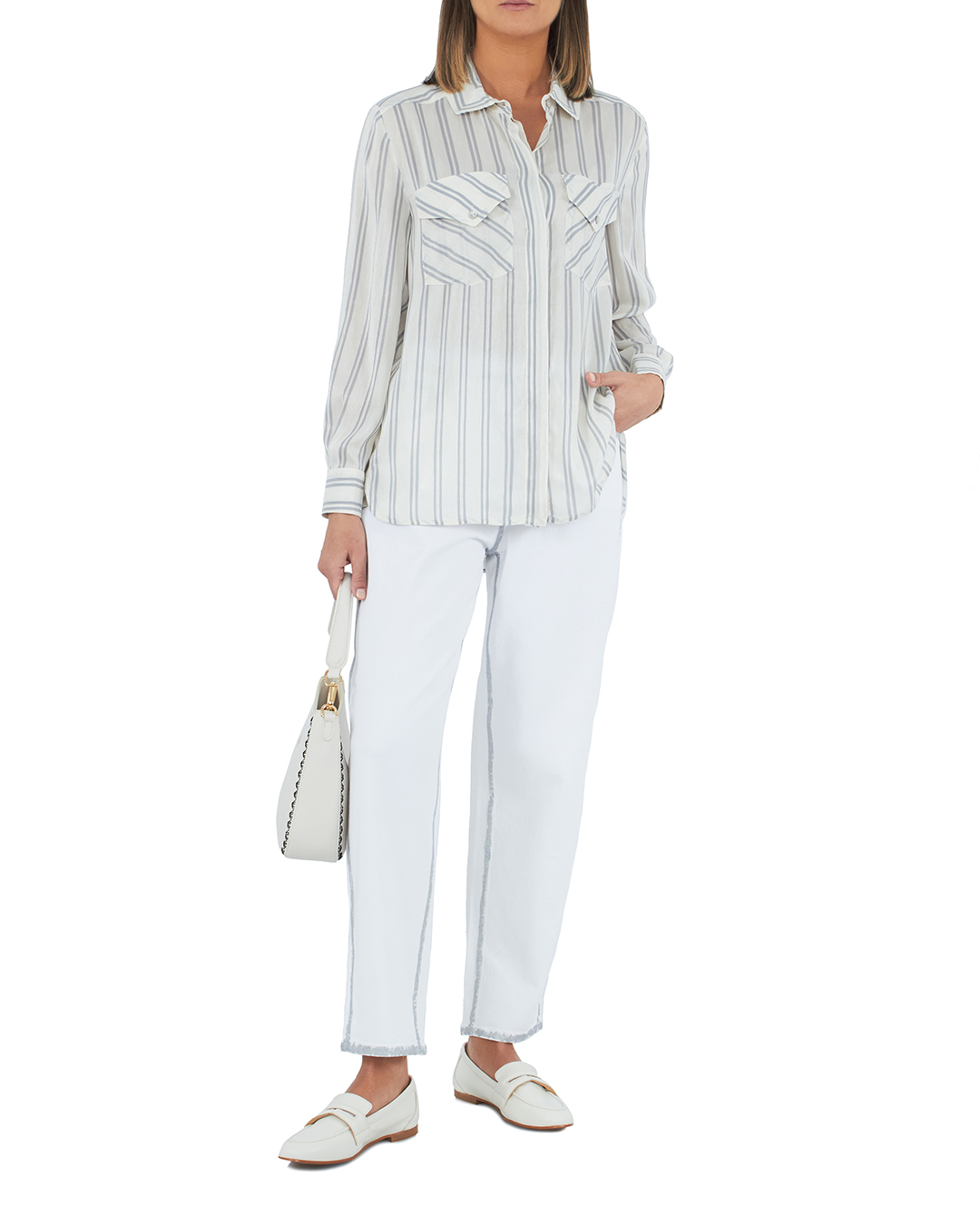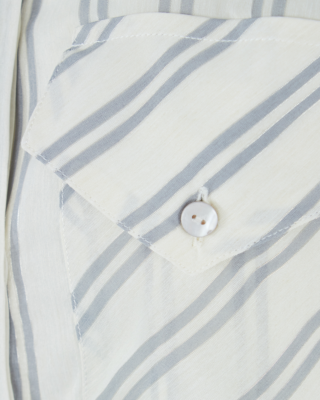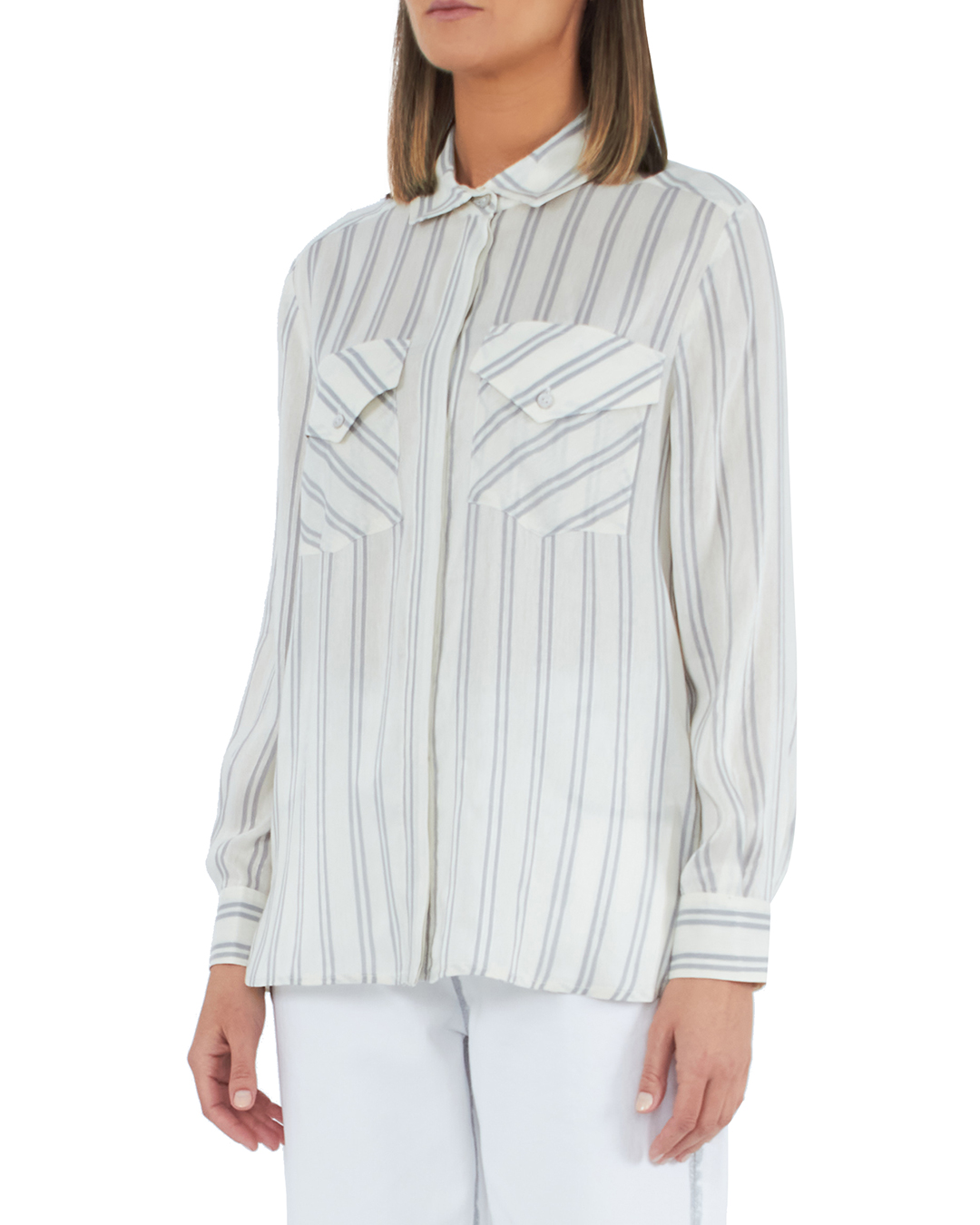 Рубашка из вискозы и шелка в полоску. Прямой крой дополнен застежкой на пуговицы, накладными карманами и отложным воротником.