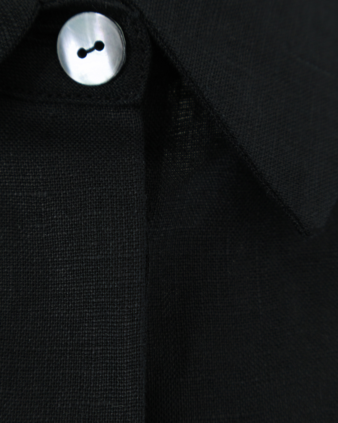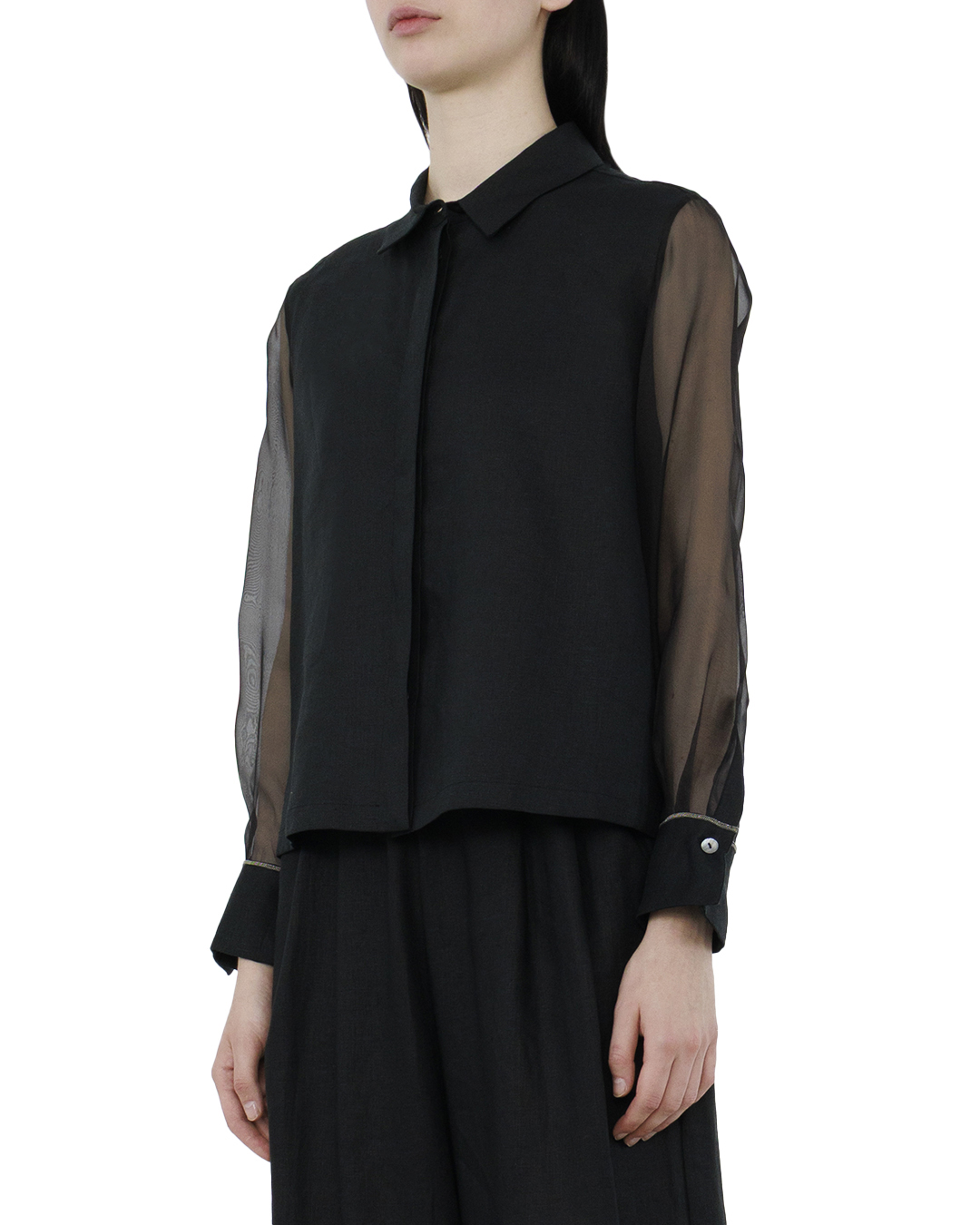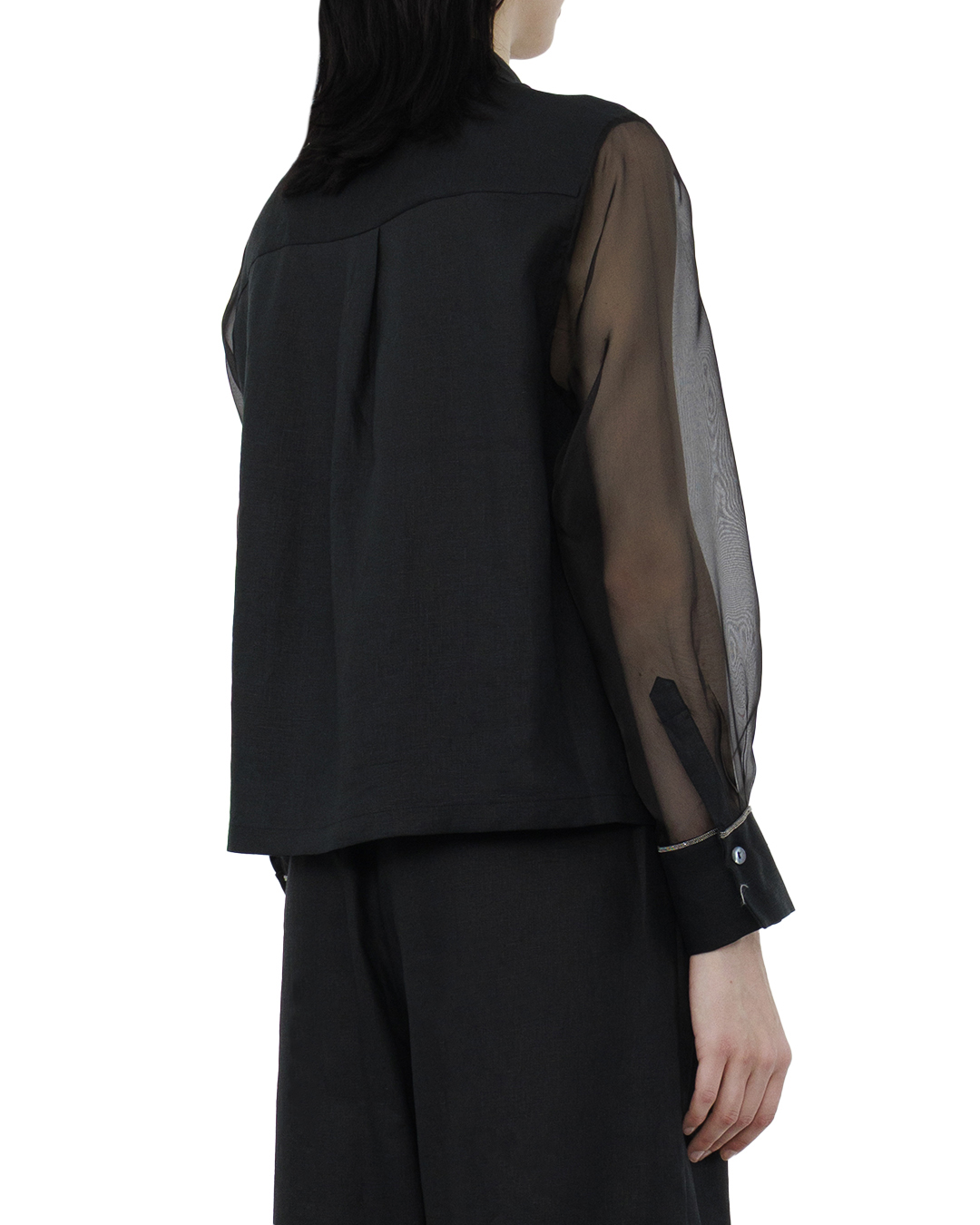 Эта рубашка — воплощение современного шика и элегантности, созданная для уверенной женщины, ценящей внимание к деталям. Основная часть выполнена из матовой черной ткани, создавая строгую и лаконичную основу образа. Классический отложной воротник придает рубашке нотку аристократичности и формальности, что идеально подходит для деловых встреч и особых мероприятий. Главная изюминка этой модели — полупрозрачные шифоновые рукава, которые добавляют загадочности и воздушности. Они создают интересный контраст с плотной тканью корпуса, тонко подчеркивая женственность и грацию. Рукава завершаются манжетами из плотной ткани, что обеспечивает удобную посадку и добавляет акцент, уравновешивая общий дизайн. Потайная застежка на пуговицах придает изделию гладкость и завершенность, избегая лишних деталей и акцентов, что позволяет сосредоточить внимание на текстурных контрастах. Эта рубашка демонстрирует мастерство балансировки классики и модного авангарда, идеально вписываясь как в деловой, так и в вечерний гардероб.