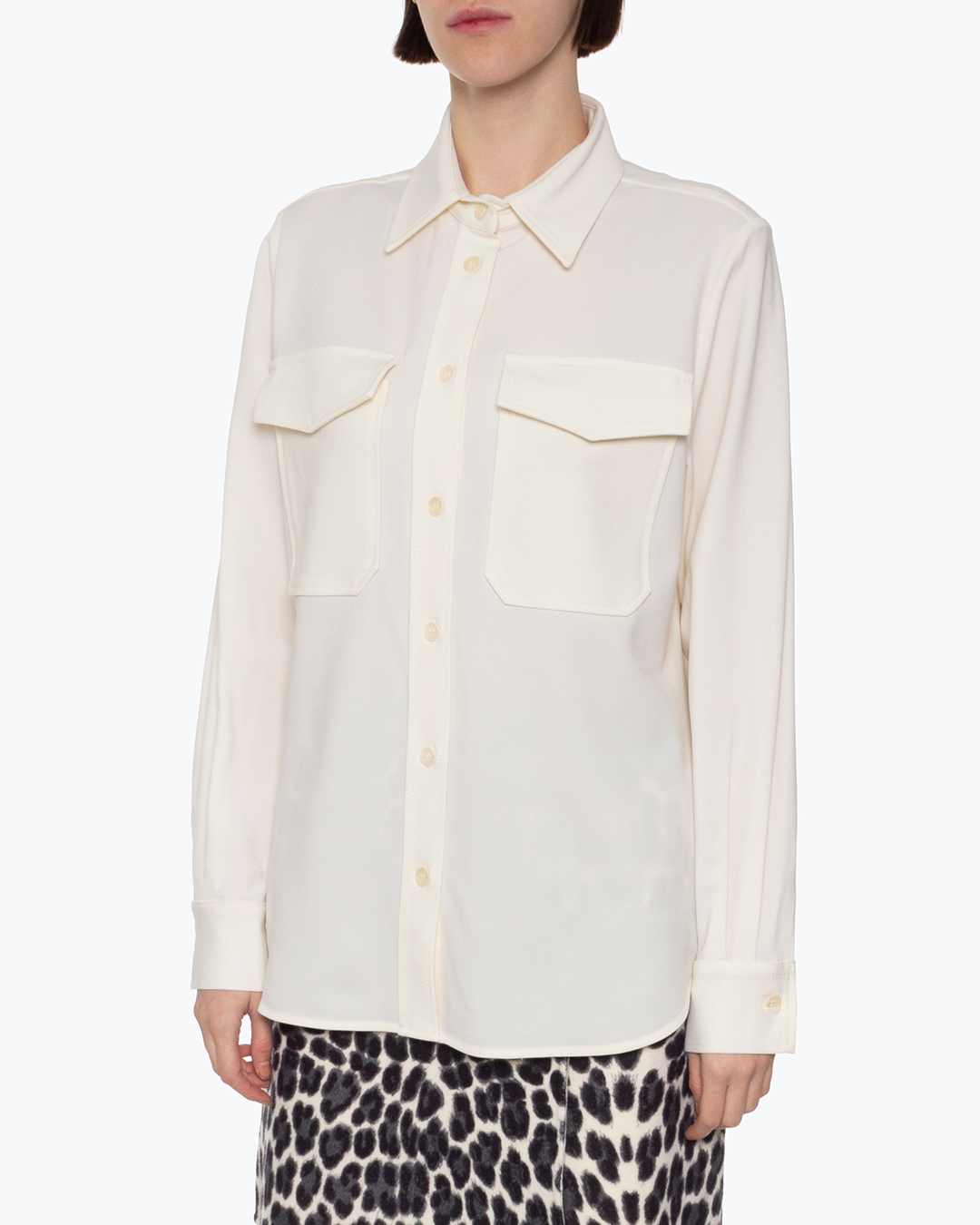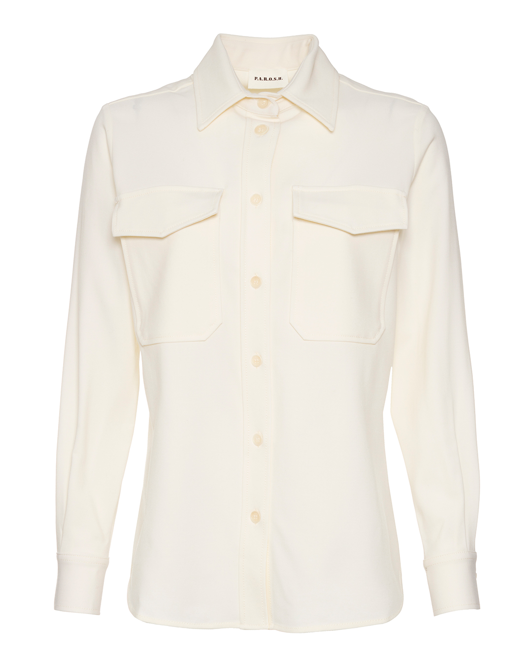 Рубашка P.A.R.O.S.H. выполнена из шерстяного текстиля. Прямой крой с застежкой на пуговицы дополнен отложным воротником и накладными карманами. Закругленная линия низа.