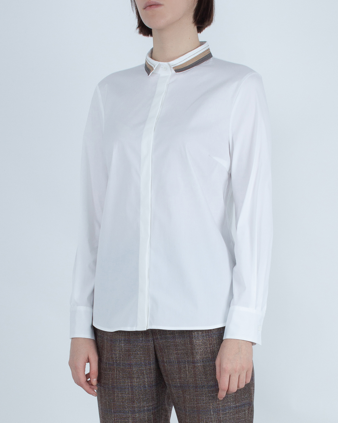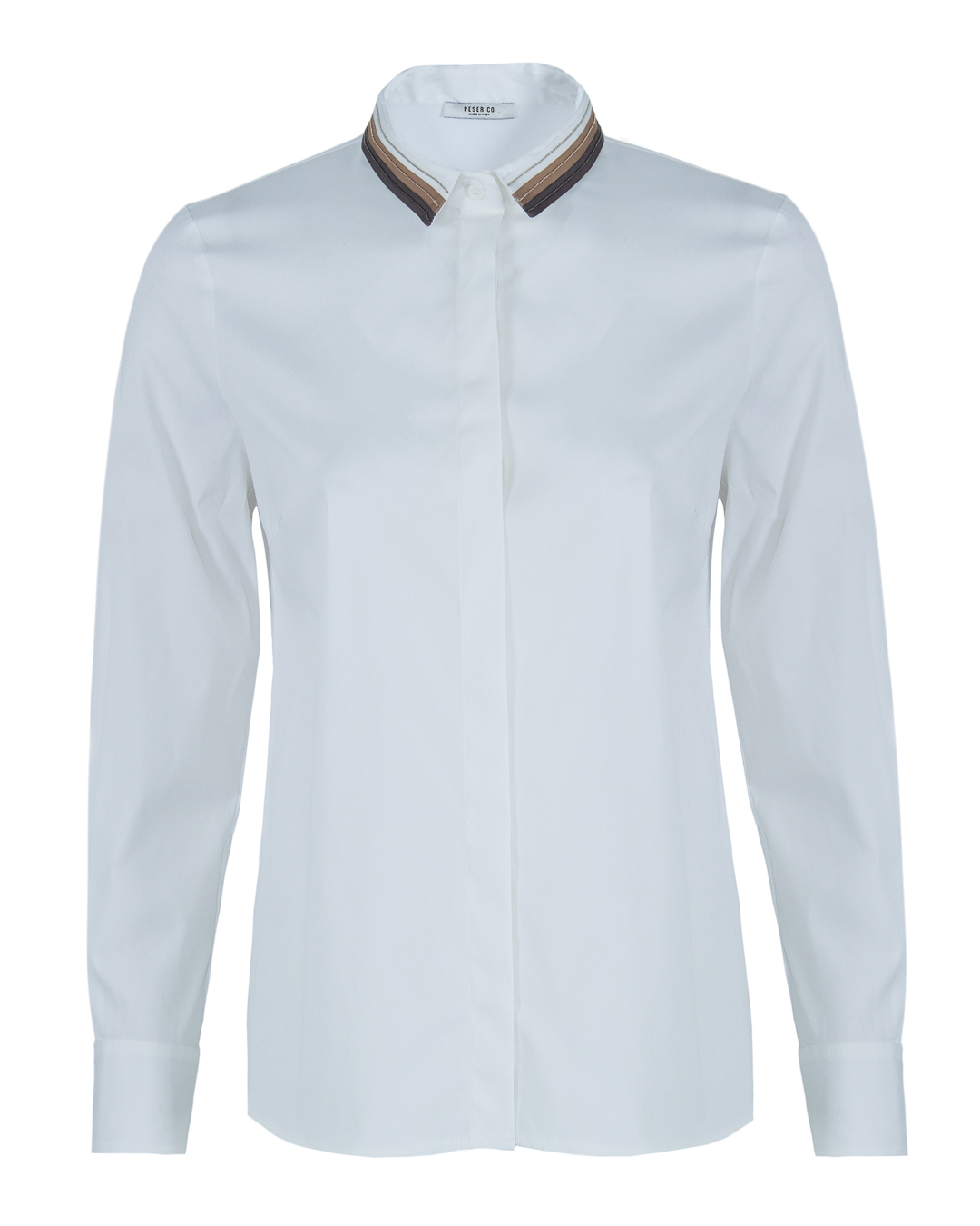 Рубашка Peserico из гладкого хлопка белого цвета. Модель прямого силуэта с застежкой на пуговицы дополнена отложным воротником с отделкой. Закругленная линия низа.