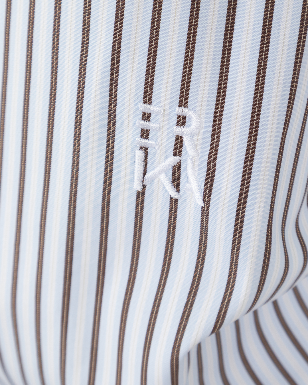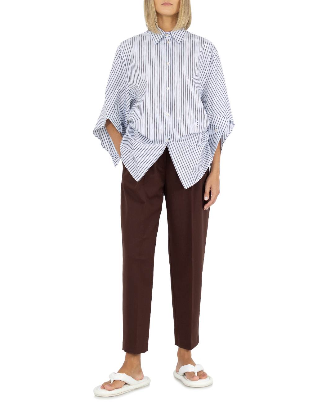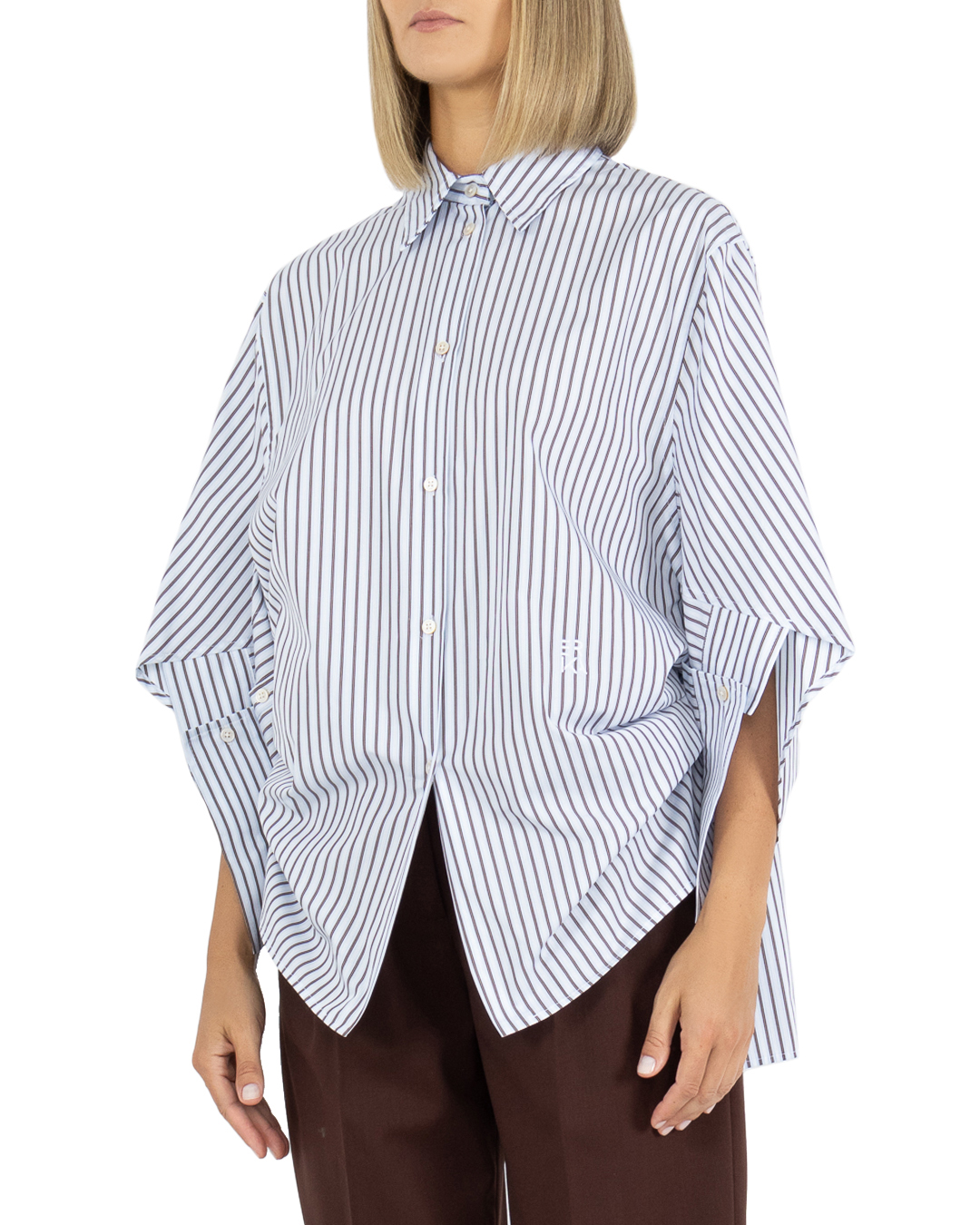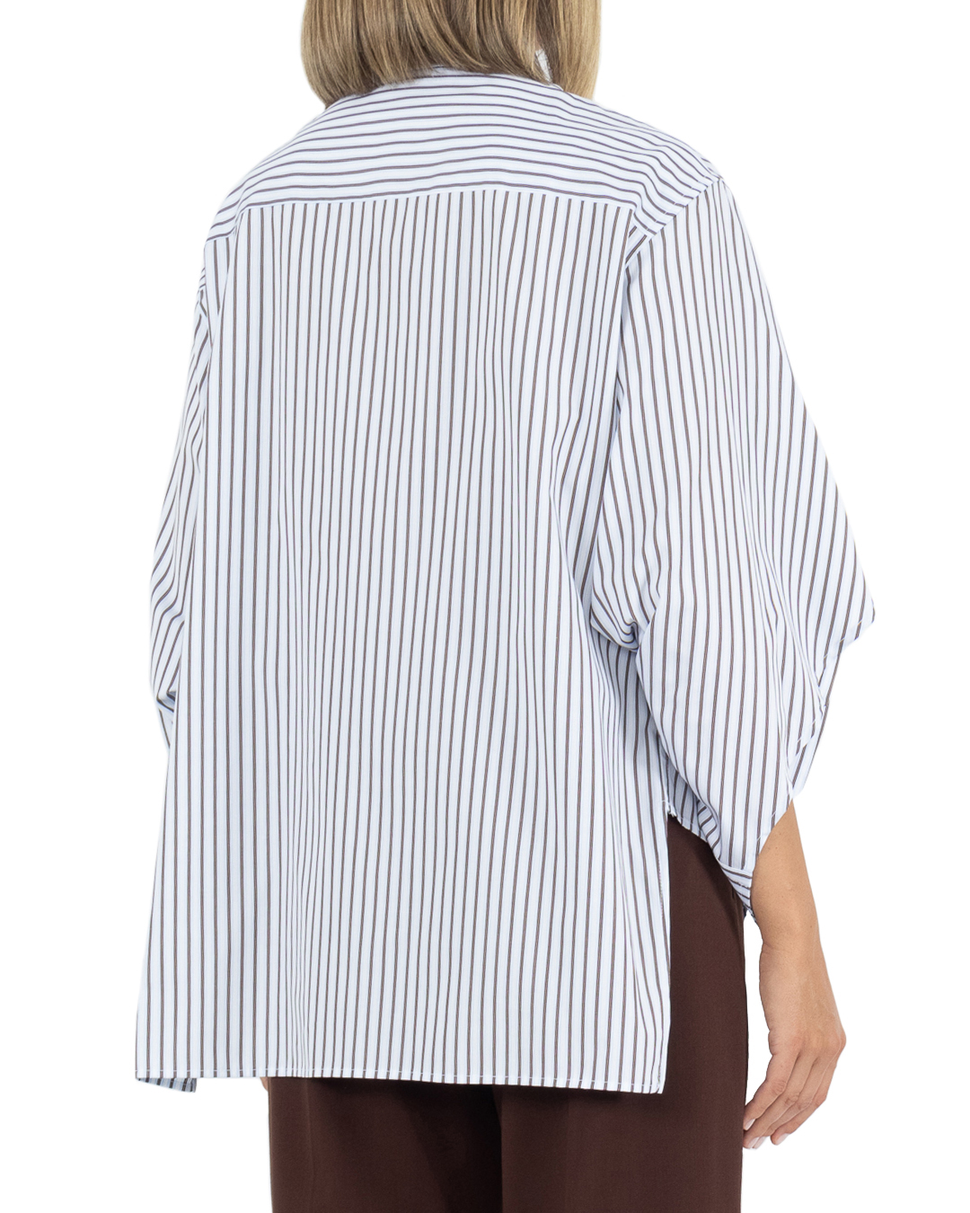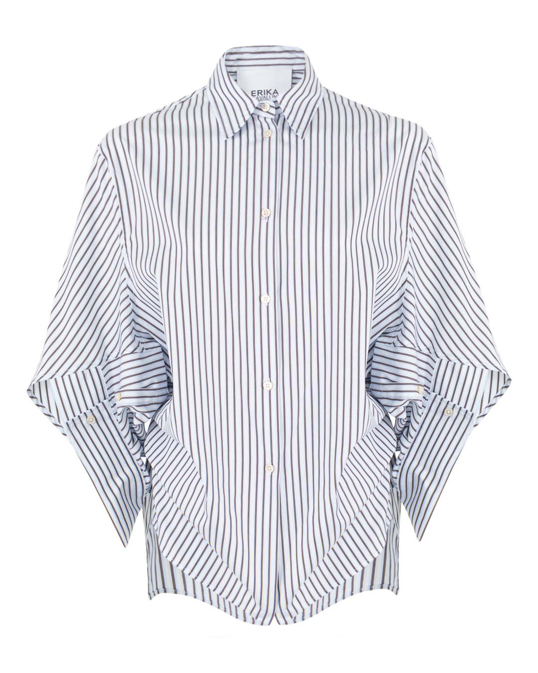 Рубашка Erika Cavallini сшита из хлопка в полоску. Свободный графичный крой со сборкой по бокам дополнен застежкой на пуговицы и отложным воротником.