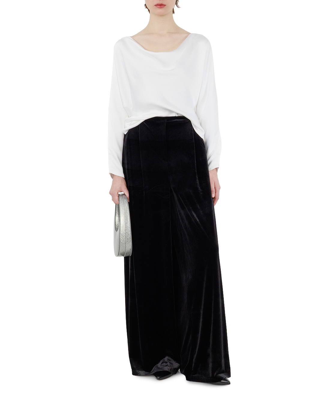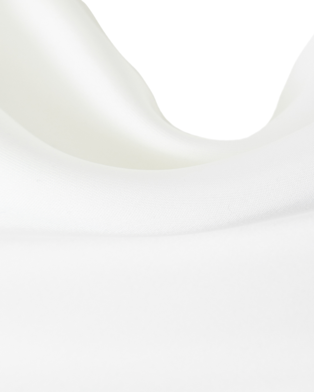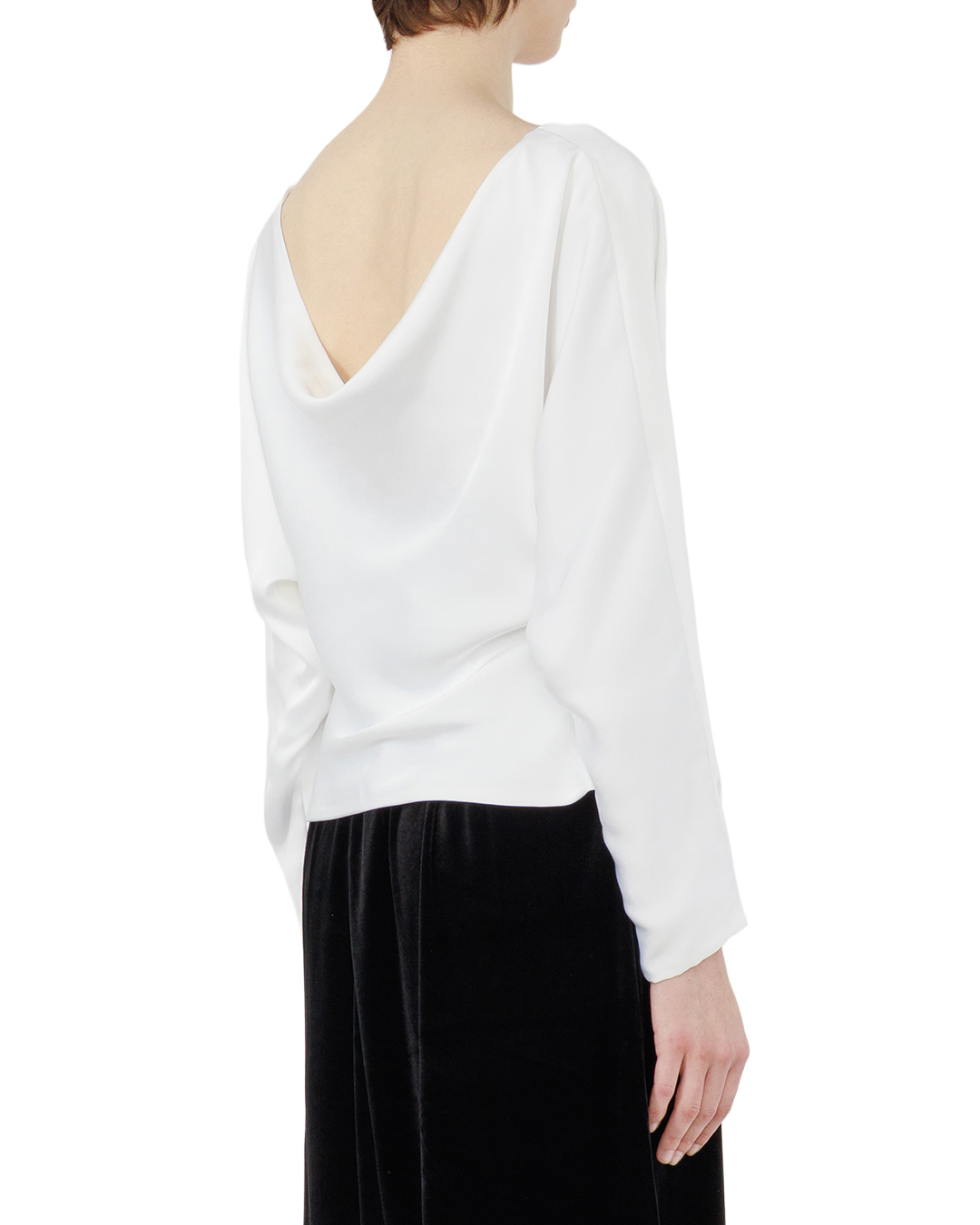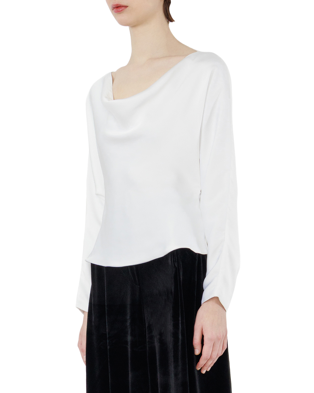 Эта белоснежная блуза — воплощение утончённой элегантности и минимализма. Модель притягивает взгляд своей лаконичностью и безупречным кроем, который балансирует между свободой и изысканностью. Ключевой акцент — изысканный драпированный вырез, создающий эффект лёгкой небрежности и добавляющий силуэту воздушности. Такая деталь не только подчёркивает линию шеи, но и придаёт образу деликатную женственность. Длинные свободные рукава выполнены в стиле «летучая мышь», что создаёт ощущение лёгкости и непринуждённости. Их плавные линии гармонично сочетаются с укороченным кроем блузы, визуально удлиняя силуэт и делая образ более динамичным. Ткань выглядит благородно — гладкая, с лёгким матовым блеском, она струится по фигуре, не облегая её плотно, а лишь мягко повторяя контуры. Такая фактура добавляет модели выразительности, не перегружая её деталями. Отсутствие декора — осознанный стилистический ход: минимализм здесь становится главным украшением. Чистота линий и безупречность кроя делают эту блузу универсальной базой для самых разных образов — от делового до романтичного. Эта модель идеально подойдёт для создания многослойных луков: сочетайте её с классическими брюками со стрелками для офисного стиля или с лёгкими льняными юбками для летнего образа. Минималистичные украшения и лаконичная обувь станут идеальным дополнением, подчёркивая изысканность блузы. В итоге — это не просто предмет гардероба, а стильный инструмент для создания образов с характером, где каждая деталь работает на создание безупречного силуэта.