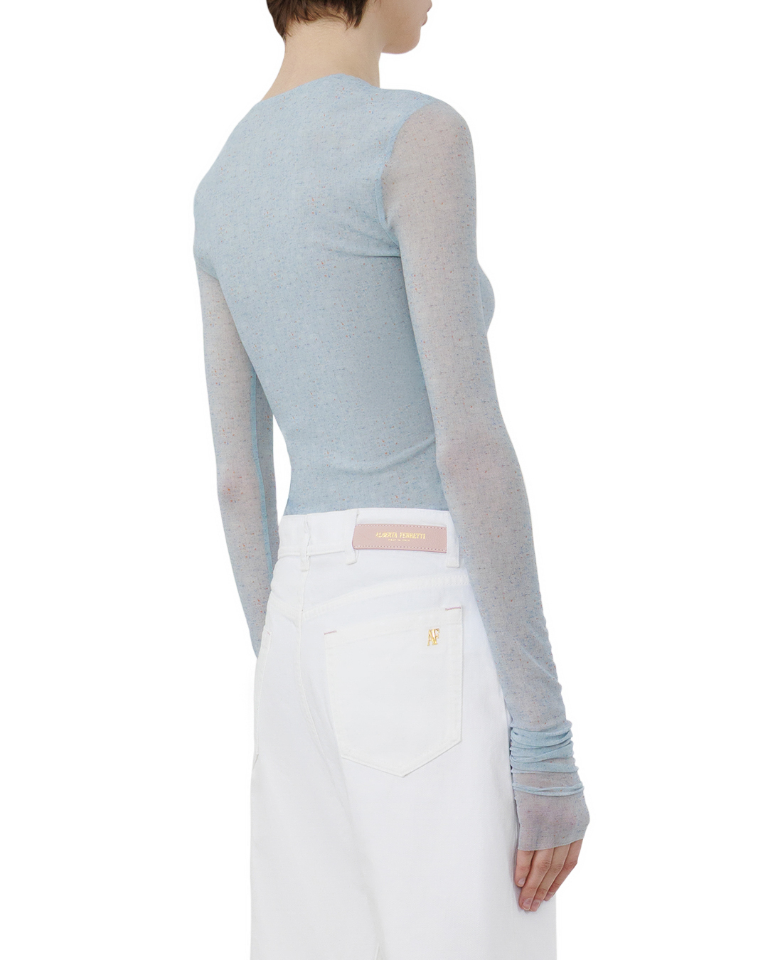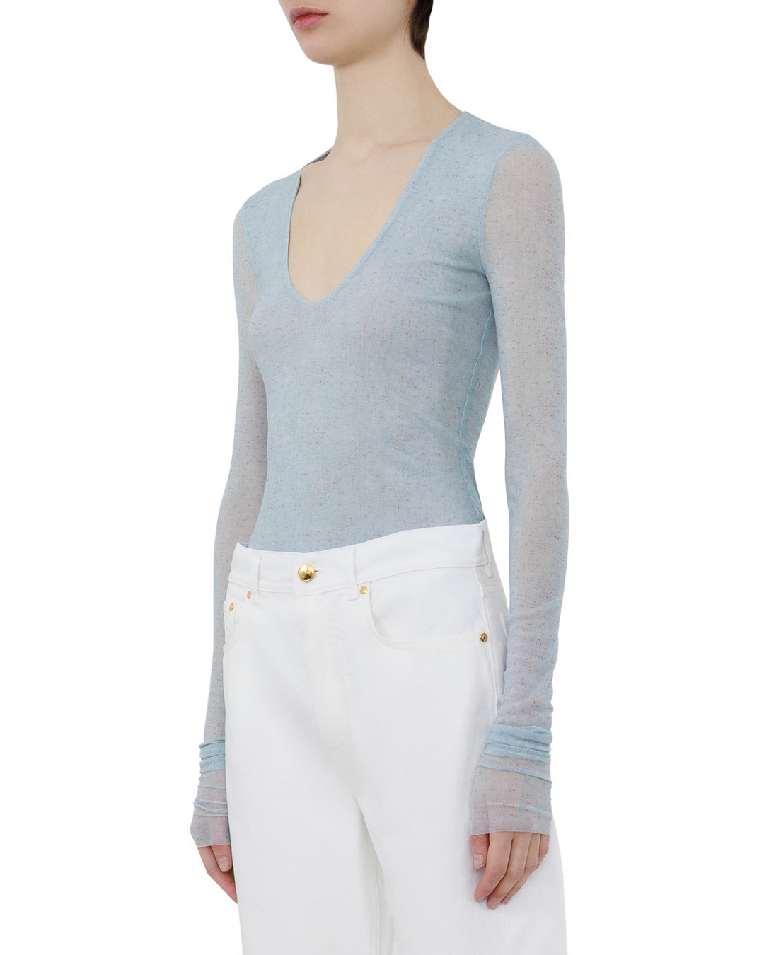 Это боди — воплощение лёгкой элегантности. Нежно-голубой оттенок создаёт ощущение воздушности, а облегающий крой подчёркивает линии фигуры, не утрачивая утончённости. Глубокий округлый вырез мягко обрамляет шею, добавляя образу сдержанной чувственности. Длинные рукава с собранными манжетами формируют изысканные воланы, придающие силуэту динамику. Лёгкая полупрозрачность материала играет на контрасте с лаконичностью кроя, создавая многослойный визуальный эффект. Швы выполнены аккуратно, практически незаметны — это подчёркивает качество пошива. Минималистичный дизайн и продуманные детали делают это боди универсальной базой для создания стильных образов — от романтичных до современных.