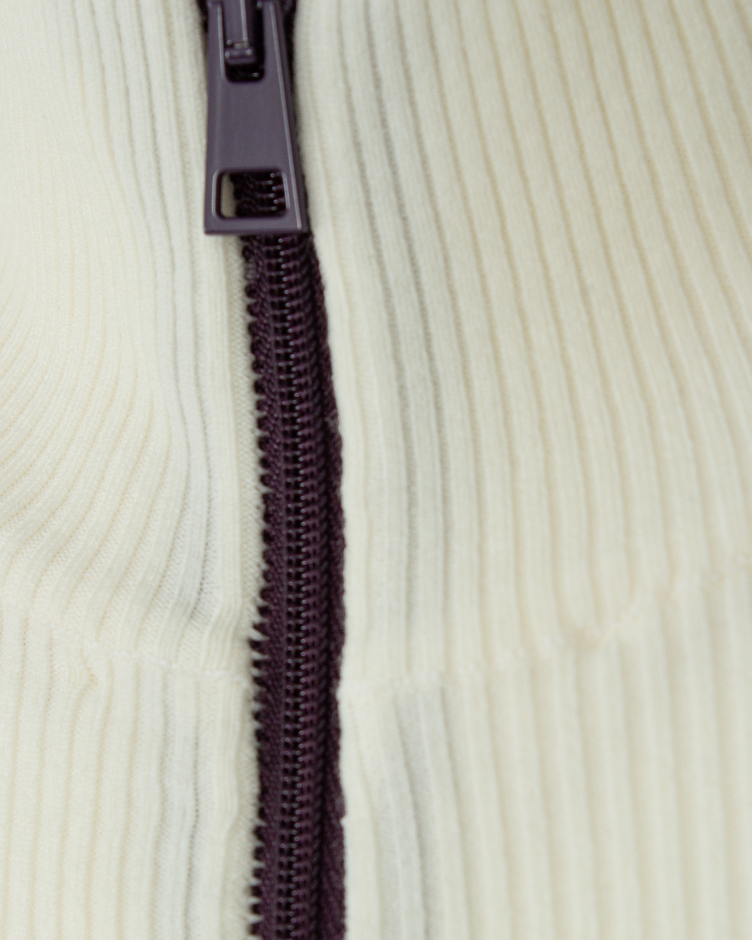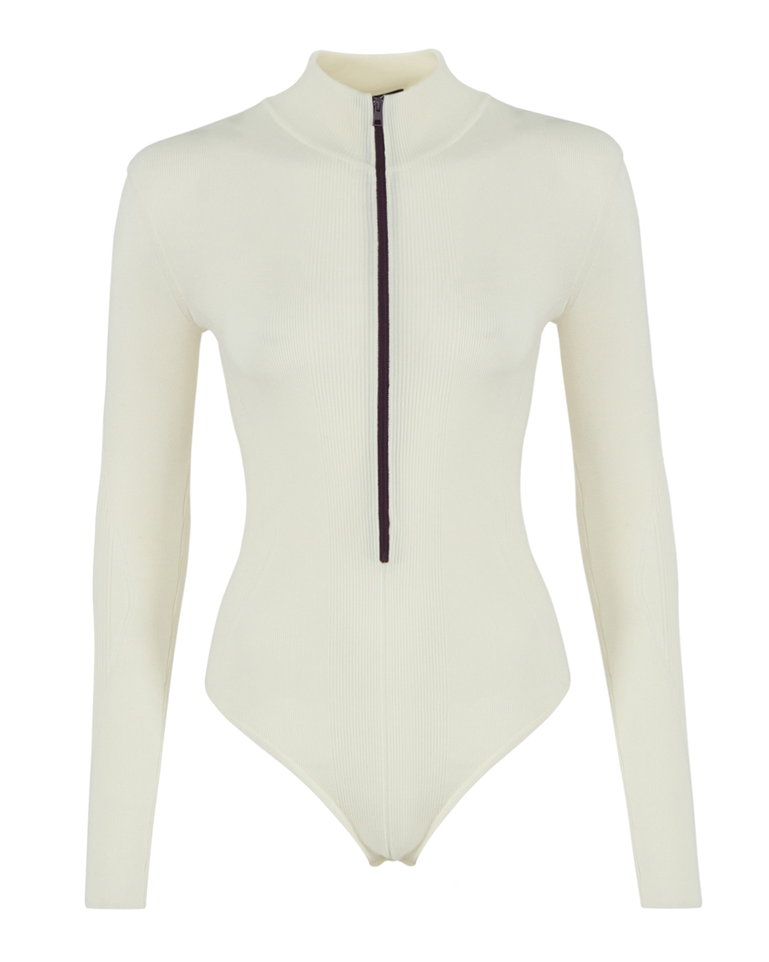 Боди MRZ из трикотажной мягкой шерсти молочного оттенка в рубчик. Модель облегающего силуэта с застежкой на молнию и длинными рукавами.