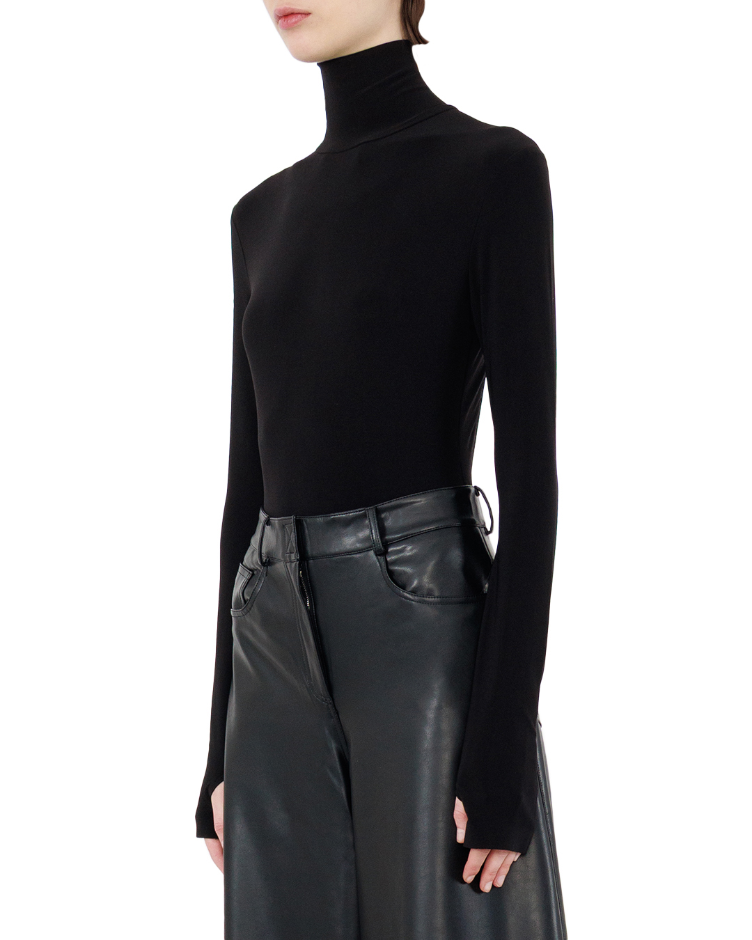Это чёрное боди с открытой спиной — воплощение утончённой элегантности и дерзкой женственности в одном флаконе. Высокий воротник-стойка задаёт образу сдержанный, но выразительный тон, а длинные облегающие рукава подчёркивают линии рук, создавая эффект цельного, безупречного силуэта. Открытая спина становится главным акцентом модели: плавные линии выреза играют со светом и тенью, добавляя образу загадочности и чувственности. Монохромный чёрный цвет придаёт изделию универсальность — оно легко впишется как в повседневный, так и в вечерний гардероб. Боди идеально садится по фигуре, деликатно подчёркивая естественные изгибы тела. Материал выглядит благородно и при этом невероятно комфортен в носке — он мягко облегает кожу, не сковывая движений. Эта модель станет отличной базой для создания многослойных образов: сочетайте её с пиджаками, кардиганами или прозрачными блузами для эффектного контраста. В этом боди органично сочетаются минимализм и смелость — оно подчёркивает индивидуальность, не перетягивая внимание на себя лишними деталями. Идеальный выбор для тех, кто ценит в одежде одновременно стиль, комфорт и выразительность.