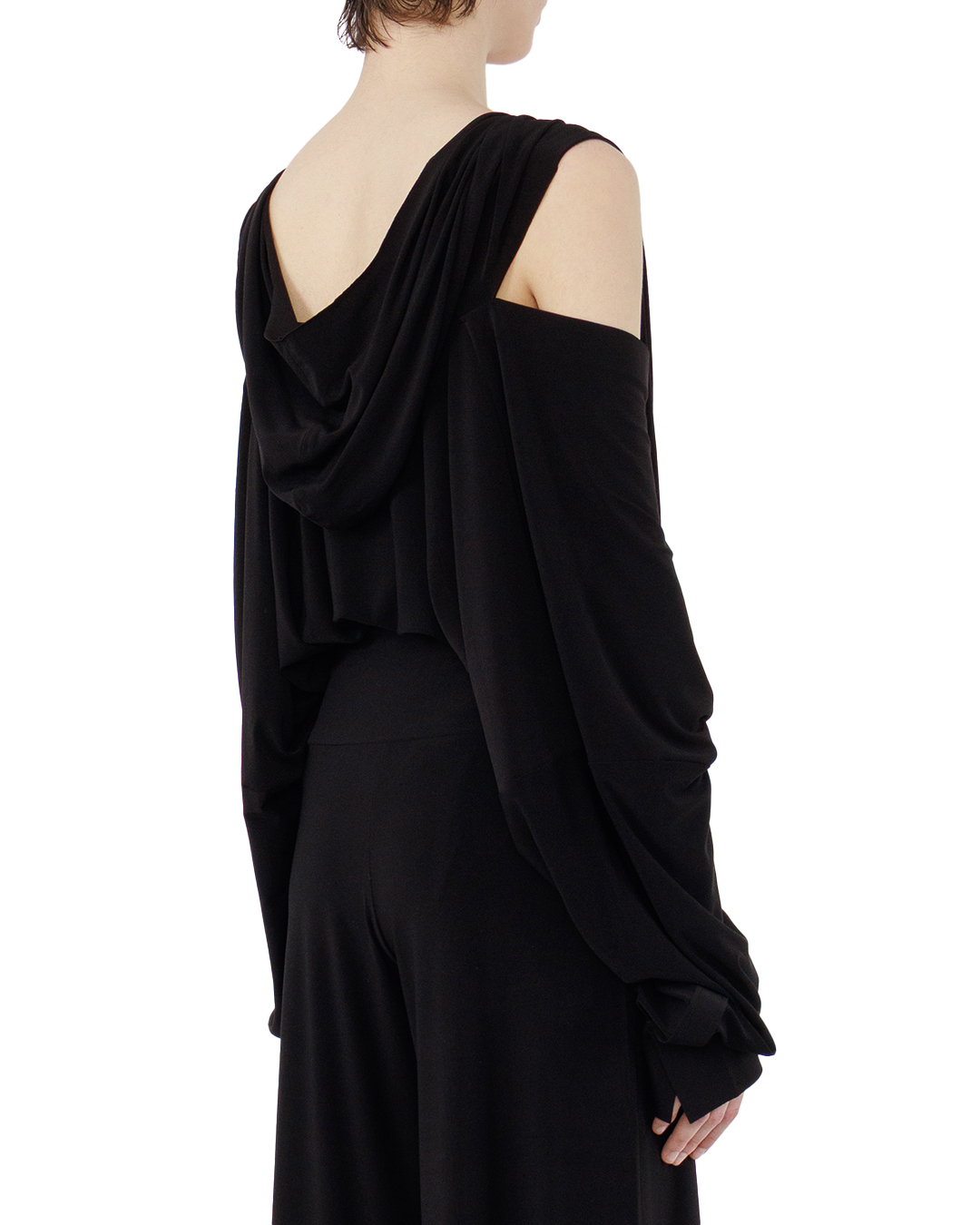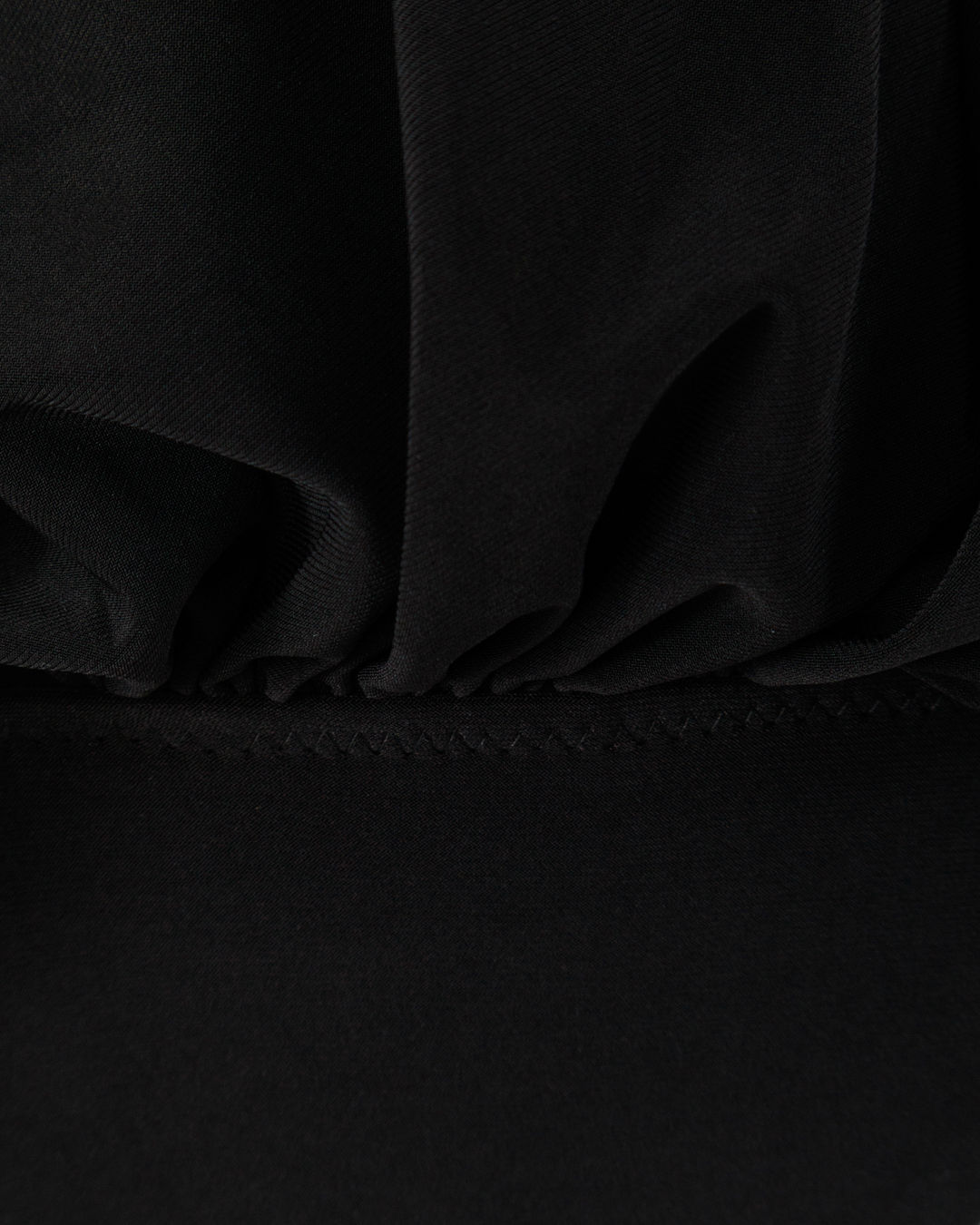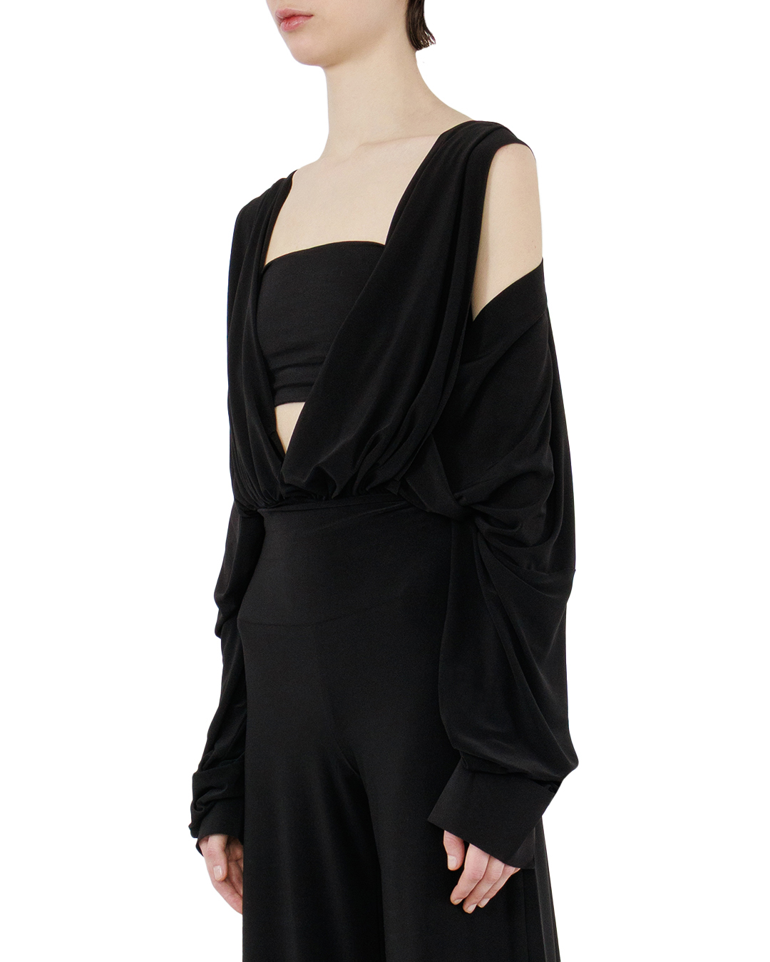 Это элегантное боди от Norma Kamali — воплощение современного шика с отголосками минимализма. Глубокий V-образный вырез задаёт драматичный акцент, превращая модель в настоящий арт-объект гардероба. Свободный, слегка оверсайз-силуэт балансирует между расслабленностью и изысканностью, а плавные линии кроя деликатно подчёркивают фигуру, не сковывая движений. Особого внимания заслуживает изысканная драпировка в области груди — она создаёт эффектный объём и добавляет изделию нотку утончённой театральности. Воротник с мягкими лацканами придаёт образу лёгкую формальность, превращая боди в альтернативу классической блузе. Длинные рукава с объёмным силуэтом завершаются лаконичными манжетами на пуговицах — эта деталь добавляет модели характер и служит стильным акцентом. Комбинация эластичного матового и слегка блестящего полиэстера в составе ткани создаёт интересный визуальный эффект: боди одновременно выглядит сдержанно и притягивает взгляды игрой фактур. Чёрная цветовая гамма работает на универсальность: этот предмет гардероба легко интегрируется как в повседневные, так и в вечерние образы. Боди идеально сочетается с классическими брюками, юбками-карандашами или кожаными леггинсами, а в тандеме с обувью на высоком каблуке превращается в эффектный вечерний аутфит. Каждая деталь этого боди продумана до мелочей: от ровных, практически незаметных швов до безупречной посадки. Это не просто элемент одежды, а выразительный инструмент для создания образов с характером — для тех, кто ценит в моде баланс между комфортом и эстетикой высокого полёта.