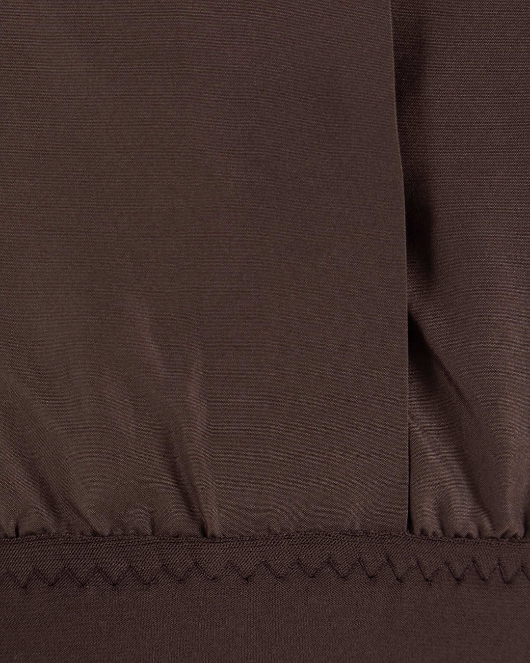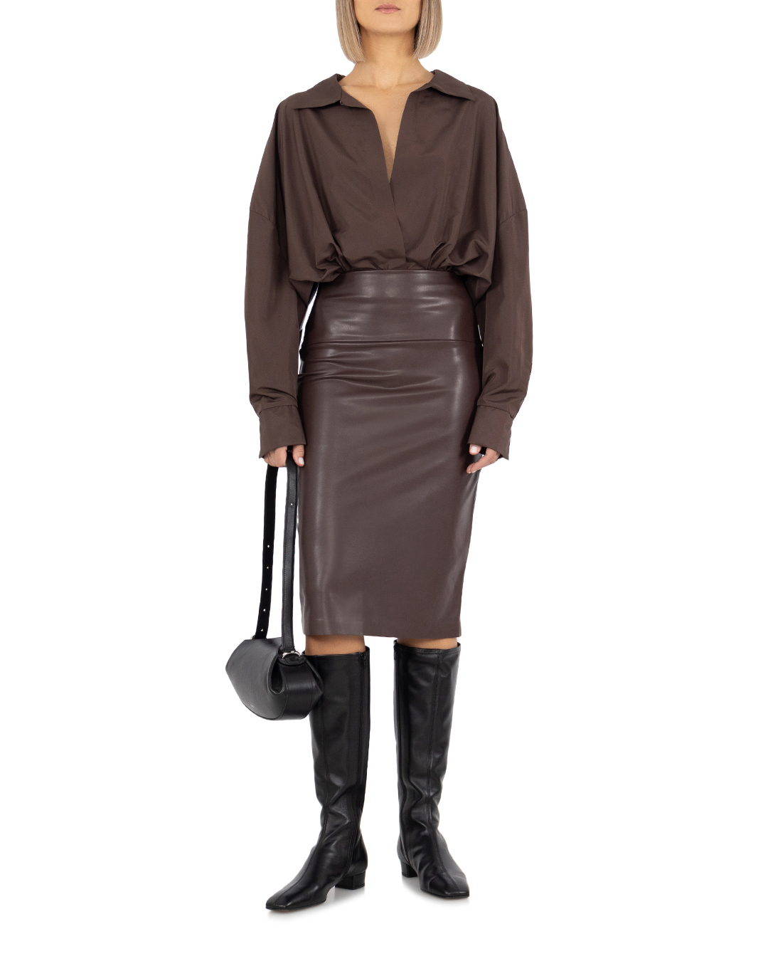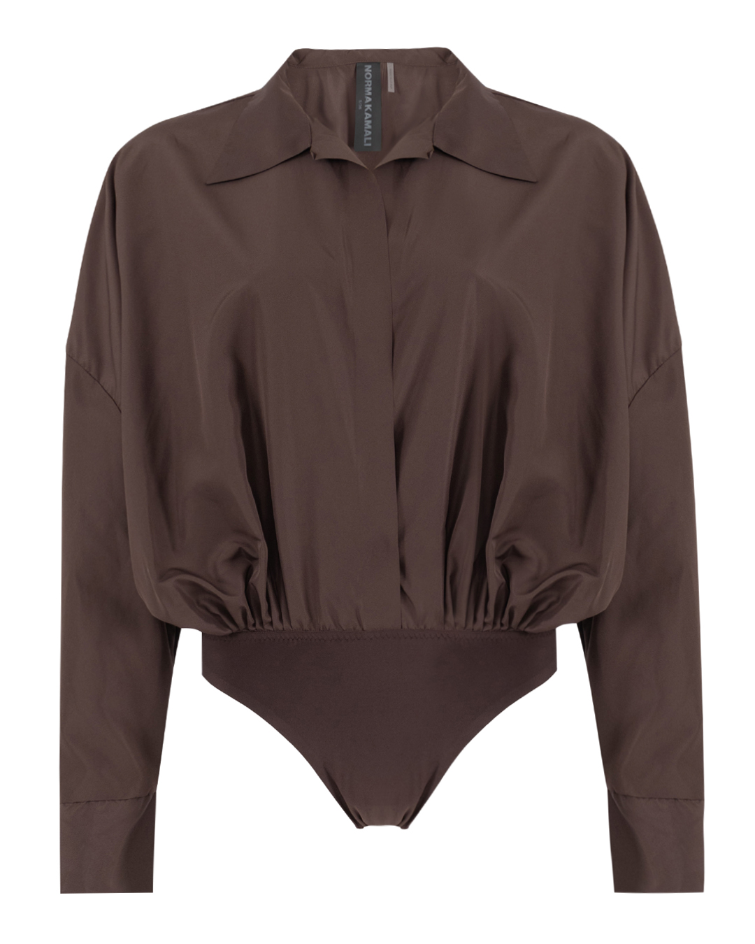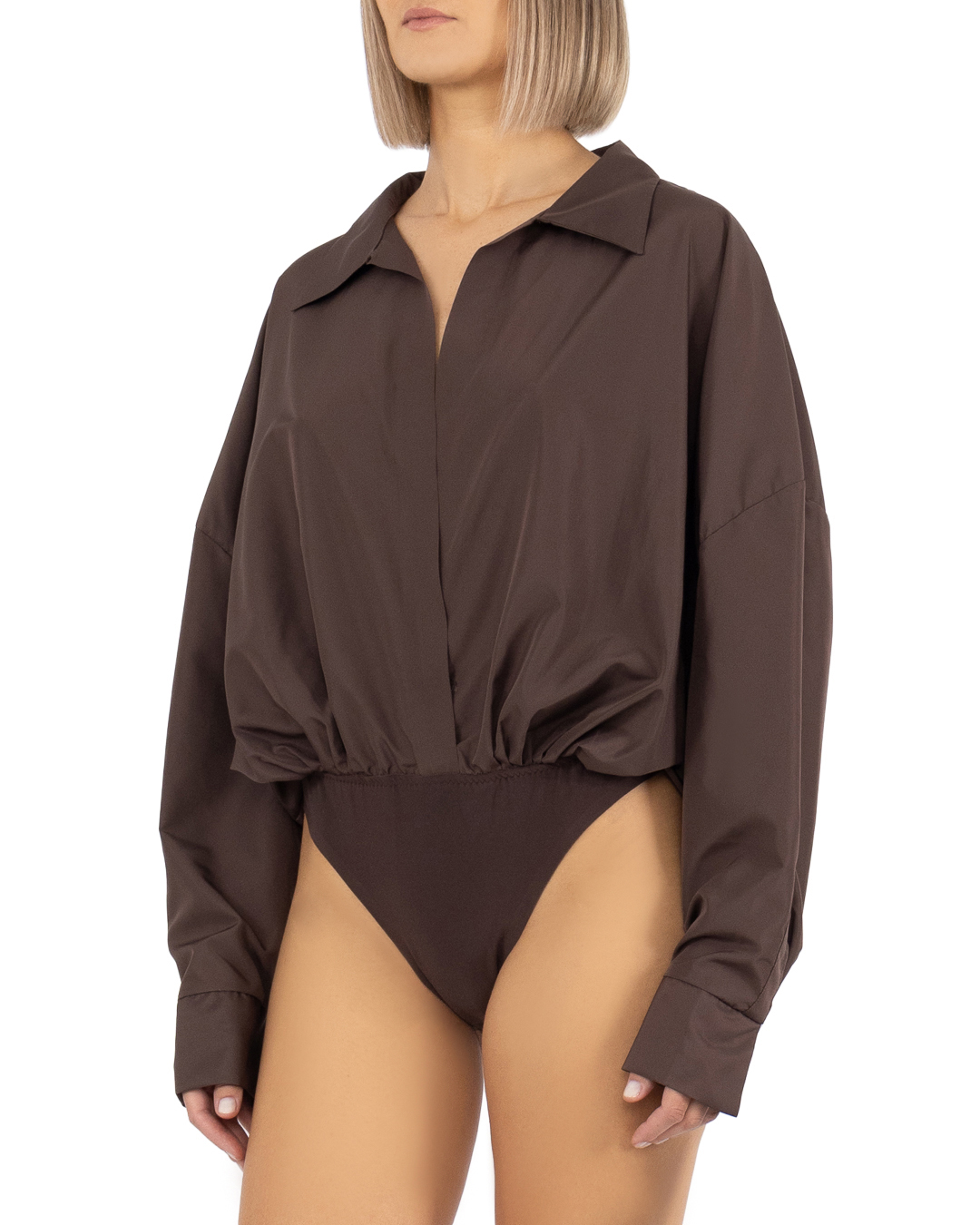 Боди напоминает лаконичную блузу свободного кроя. Модель без застежки с глубоким V – образным вырезом и воротником с лацканами. Для пошива изделия использовали комбинацию эластичного матового и блестящей полиэстера. Манжеты на объемных рукавах застегиваются на пуговицы. Боди хорошо сочетается с классическими брюками и юбкой темных оттенков и обувью на высоком каблуке.