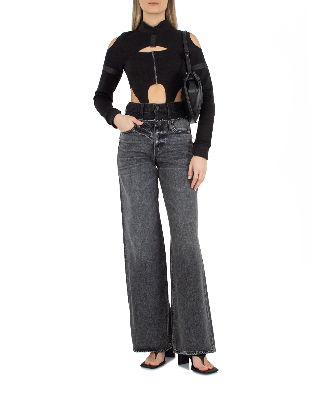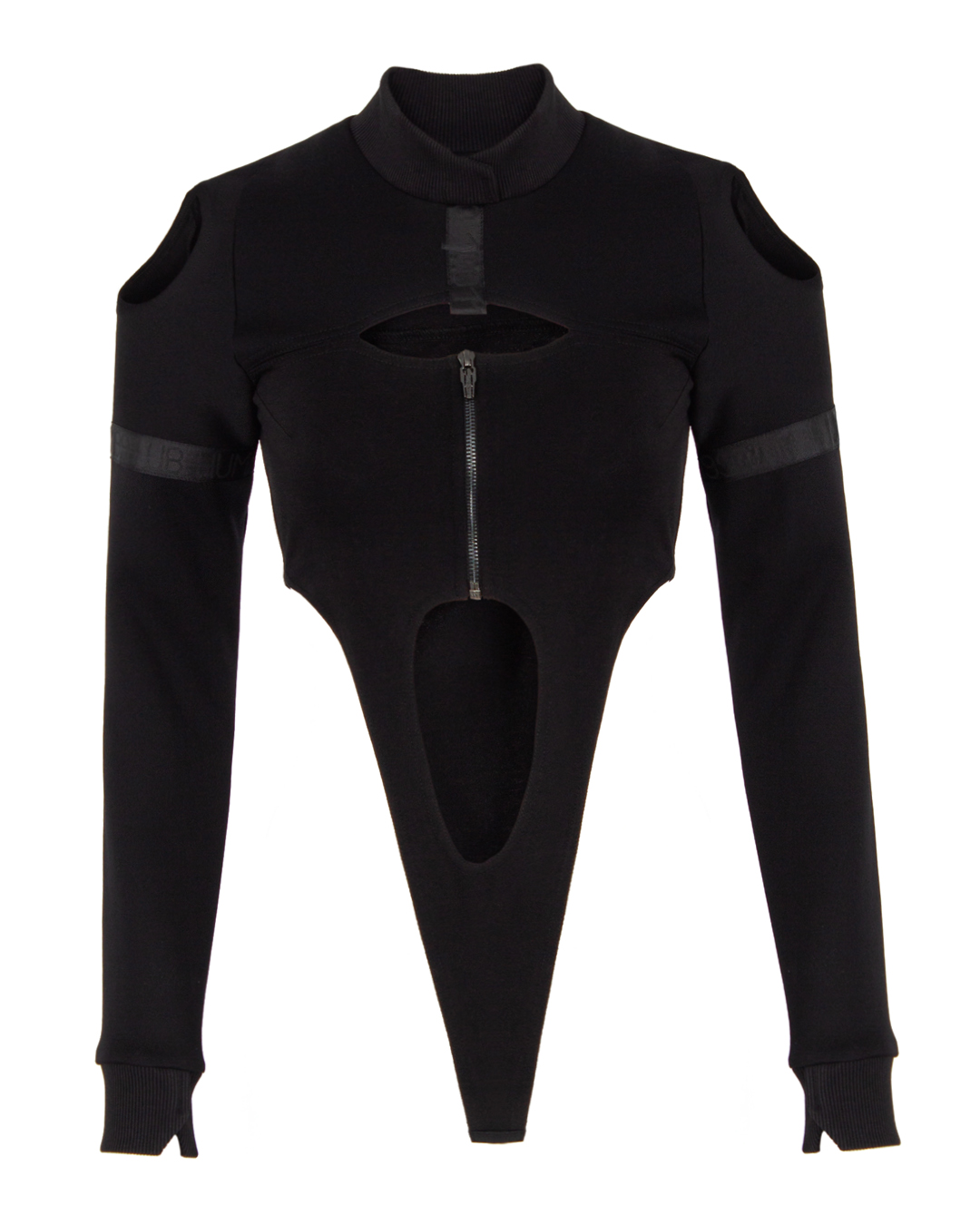 Боди URBAN BORIS из уплотненного эластичного материала черного цвета. Облегающее изделие с высокими вырезами по бокам. Изделие дополнено вырезами и застежкой на молнию.