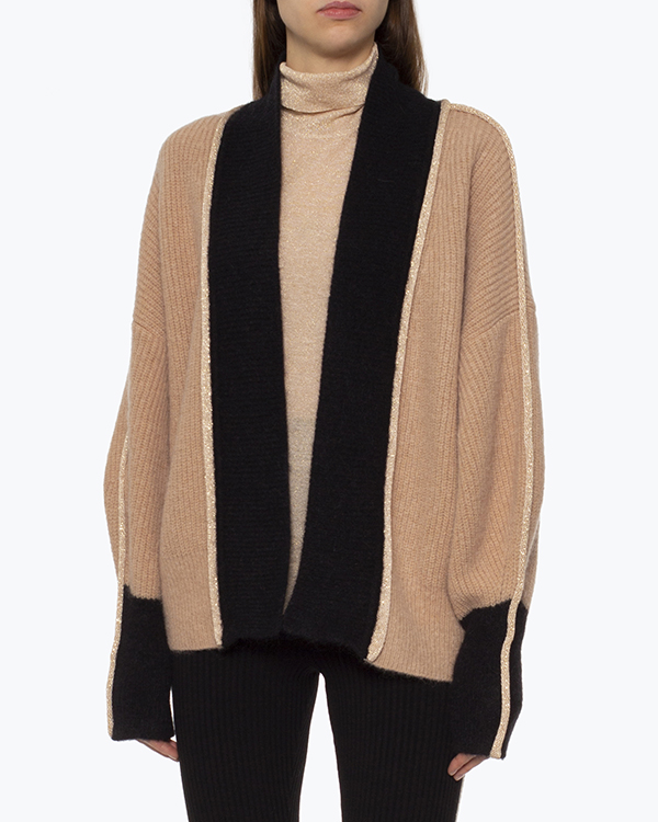 Кардиган из вязаной пряжи с добавлением мохера и блестящей нити. Комфортное изделие непринужденного силуэта со спущенной линией плеч и уплотненной отделкой.