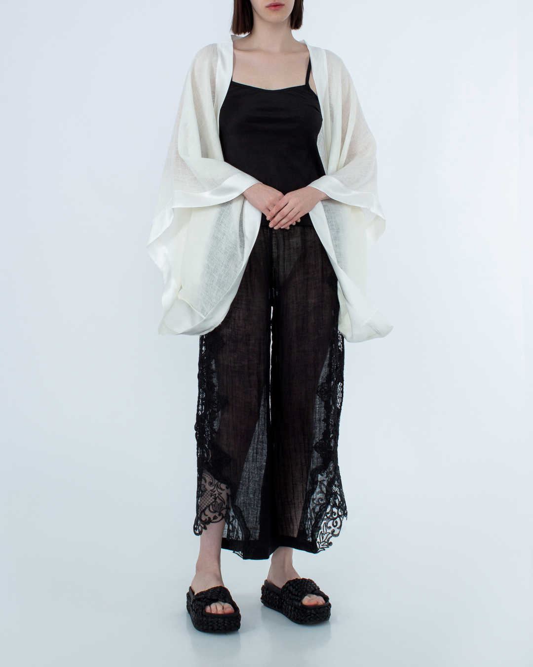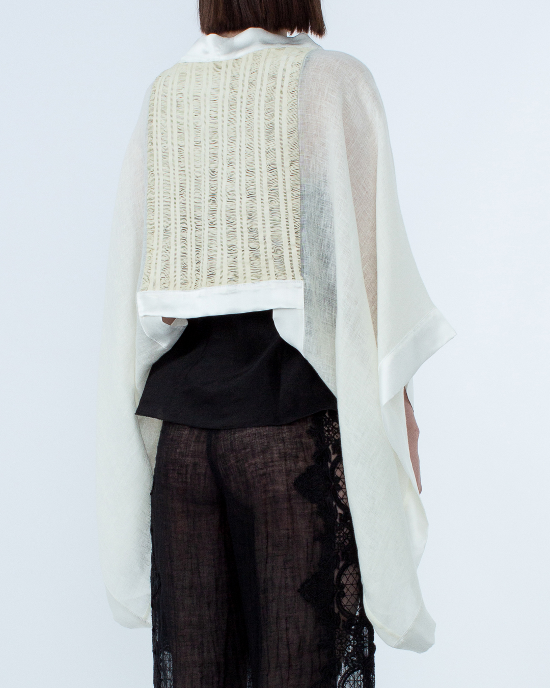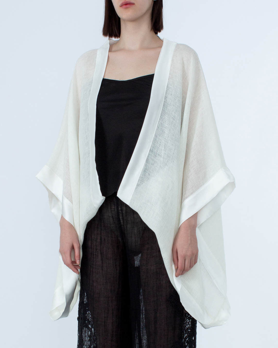 Жакет в стиле кимоно от MAURIZIO из новой коллекции сшили из льна молочного оттенка с отделкой шелком. Изделие свободного силуэта с кожаной отделкой спины.