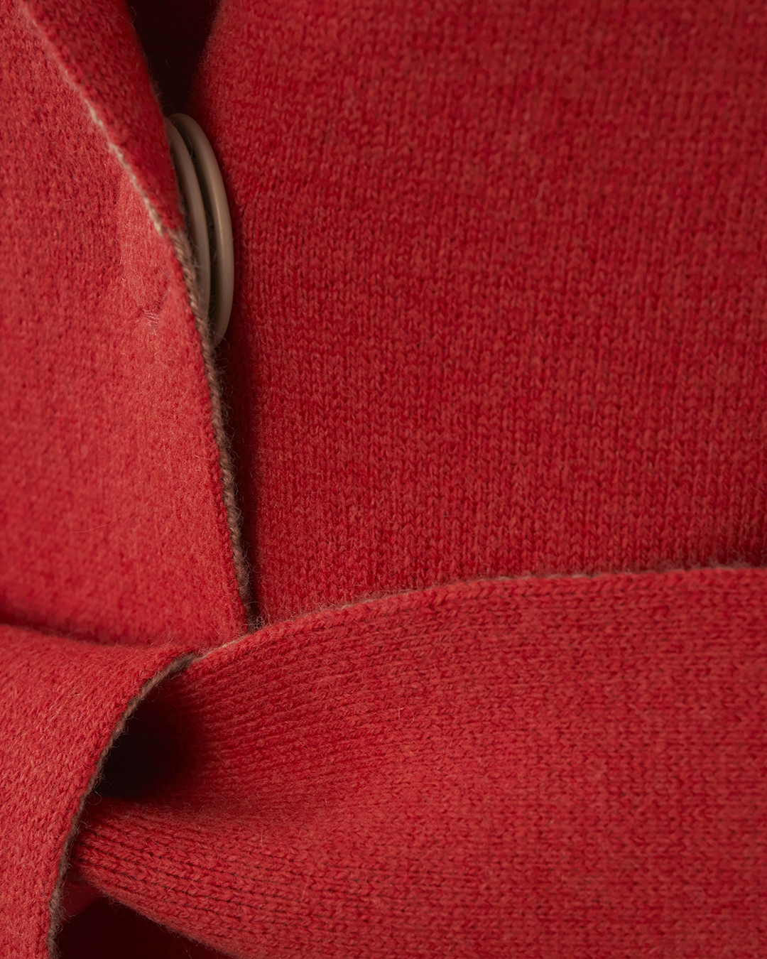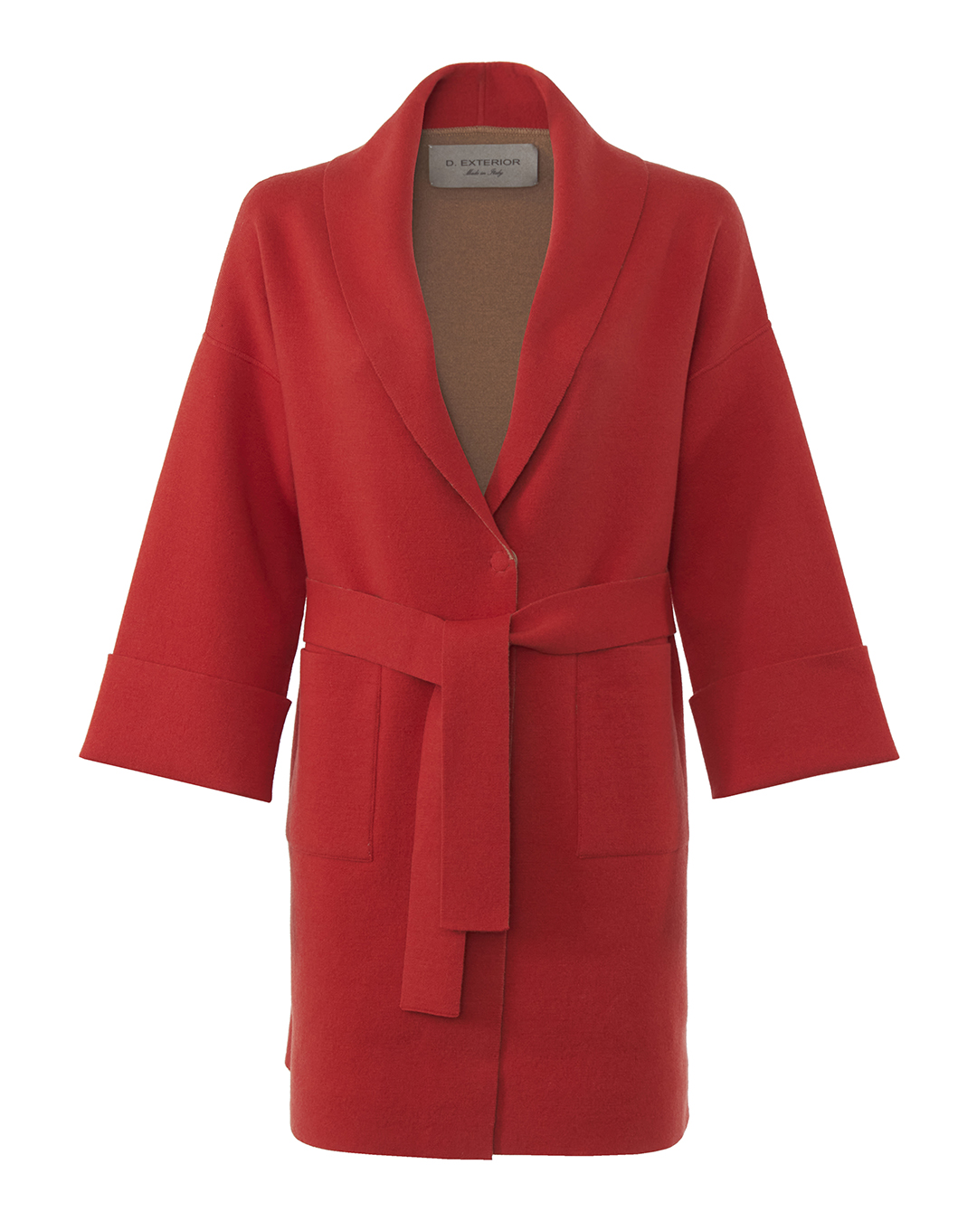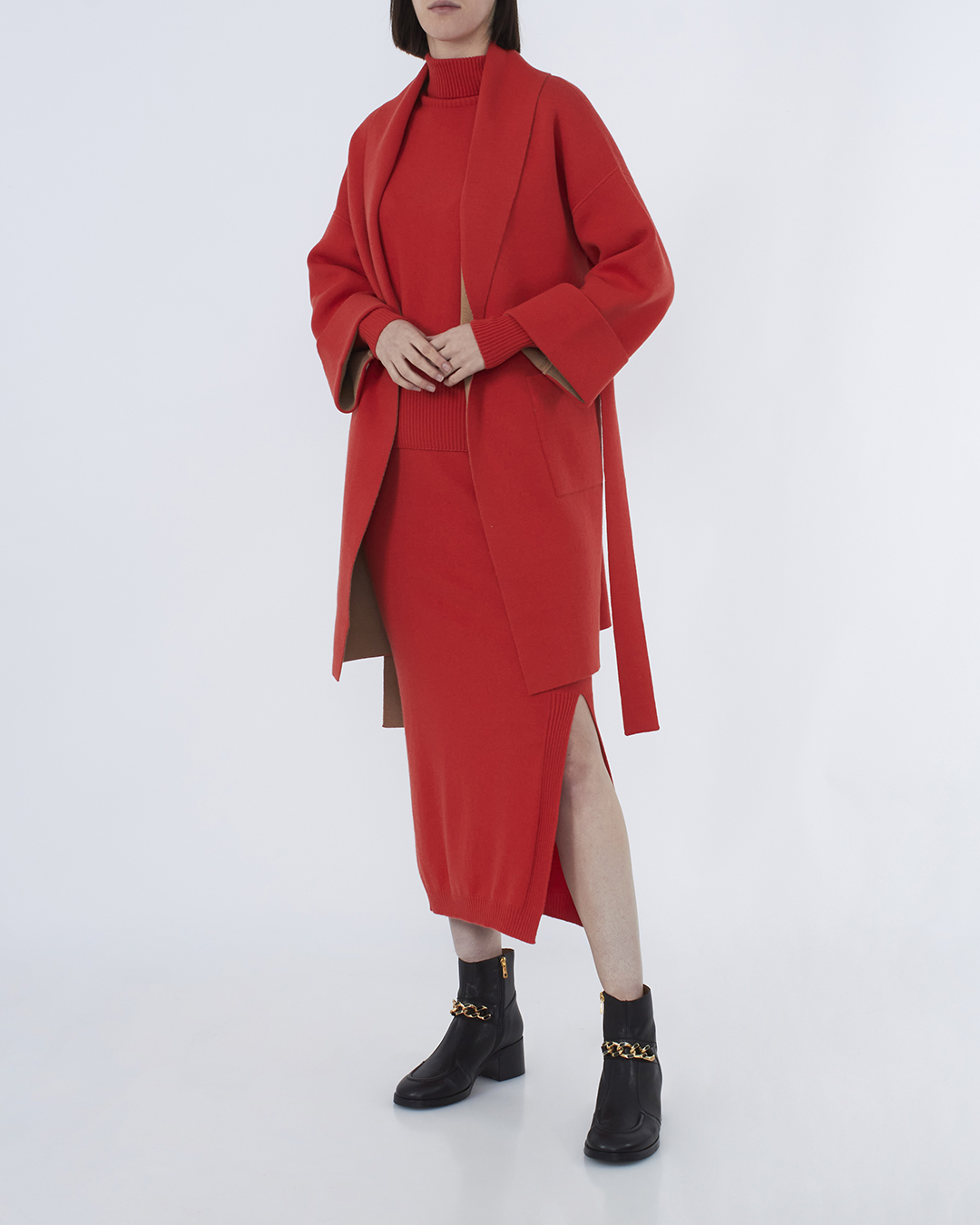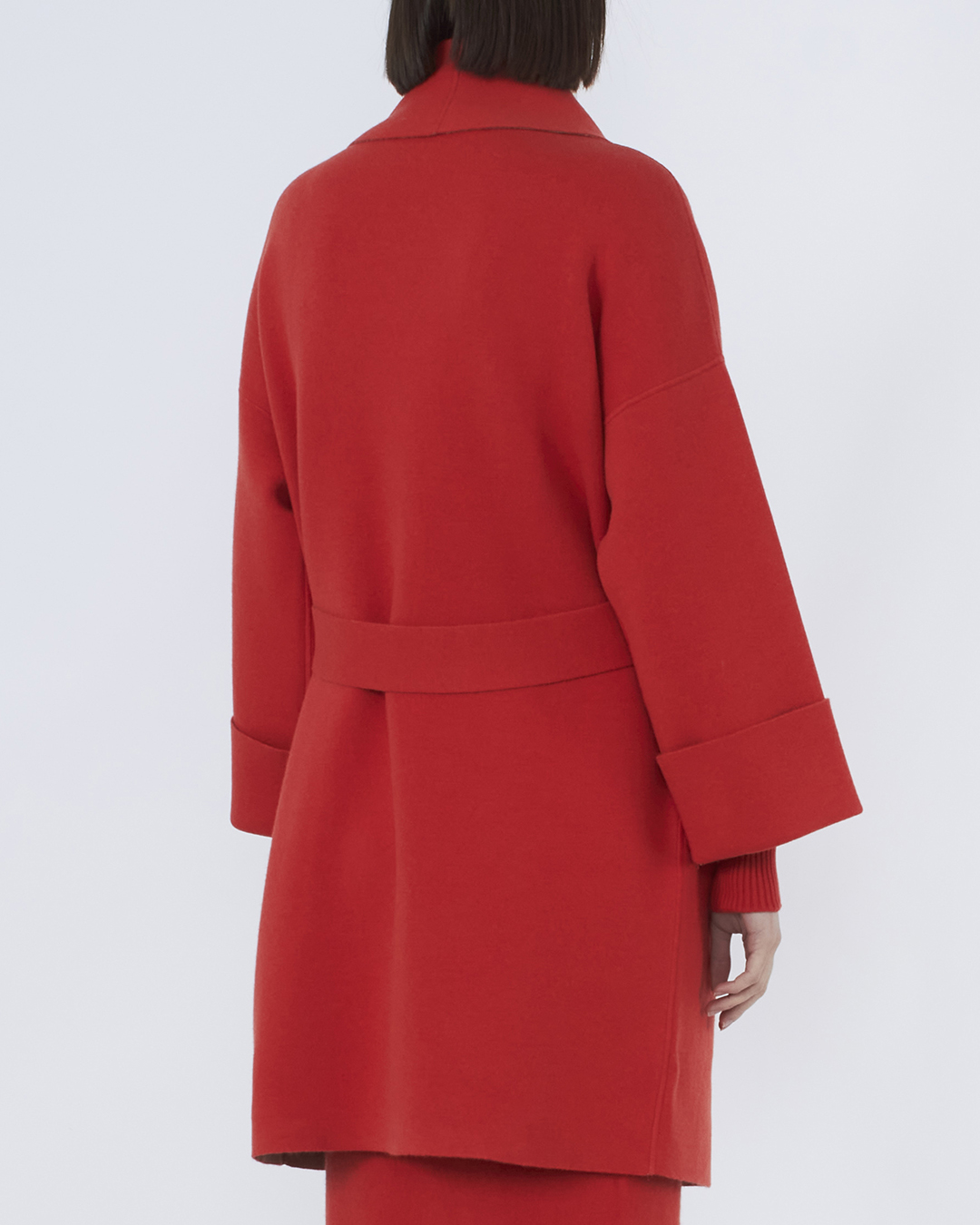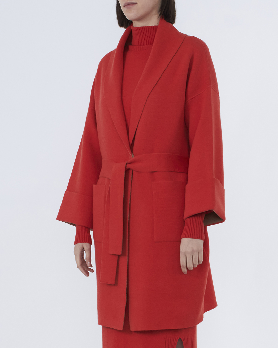 Пальто из трикотажной мягкой шерсти с добавлением кашемира красного оттенка. Модель прямого силуэта с накладными карманами и поясом из основного материала.