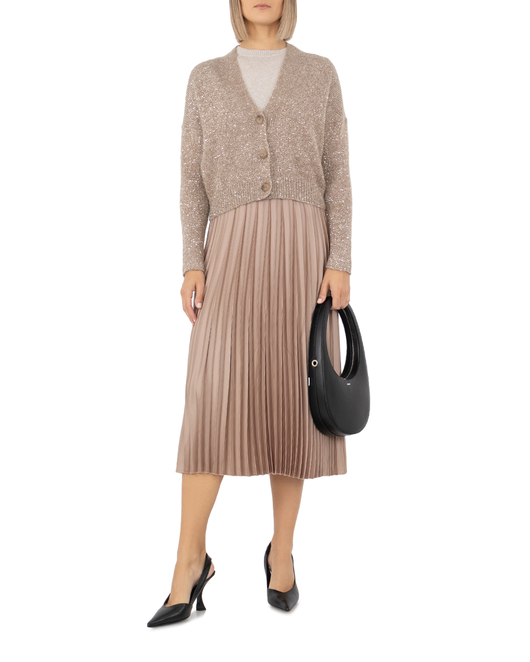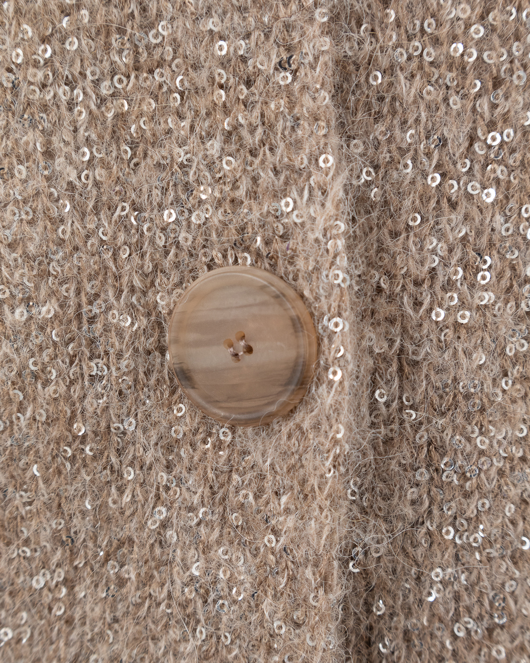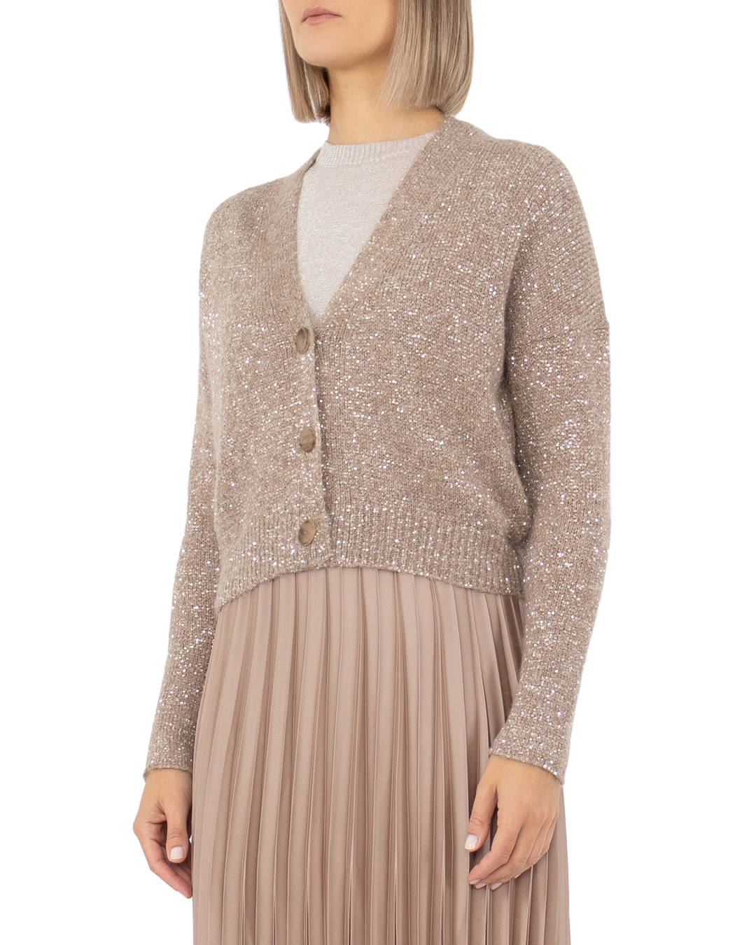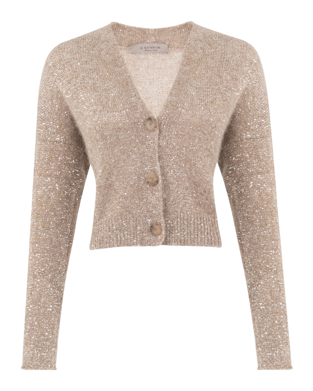 Укороченный кардиган с глубоким V-образным вырезом выполнили из трикотажа с добавлением шерсти и кашемира. При производстве материала на нити нанизали микро - пайетки, придав изделию блеск. Модель идеально сочетается с водолазкой , но так же безупречно впишется в образ и с топом.