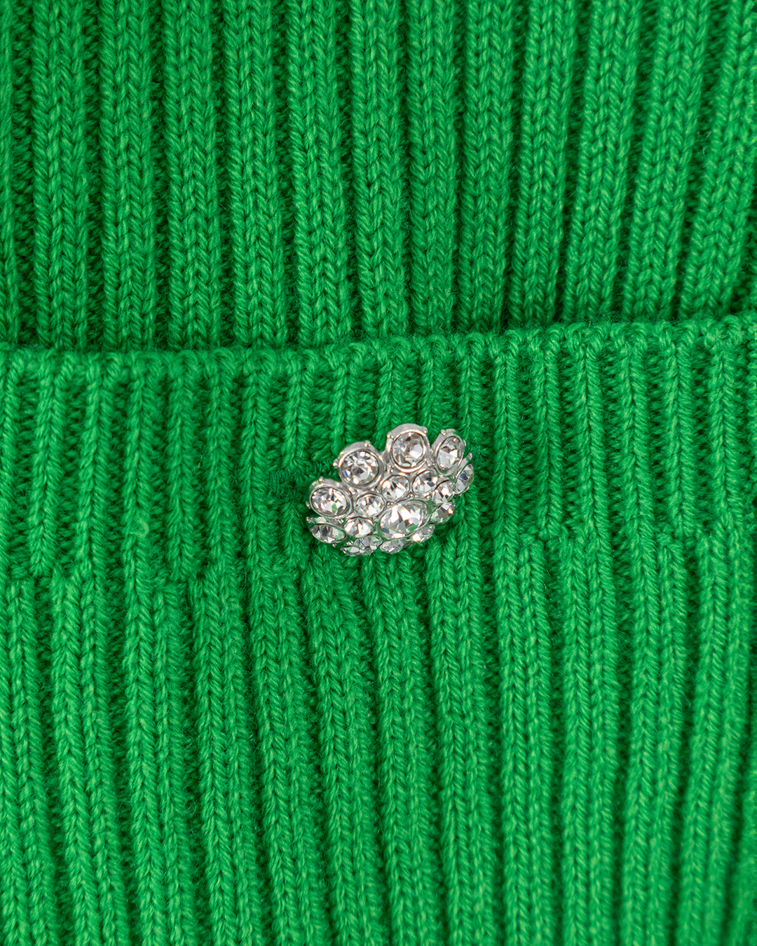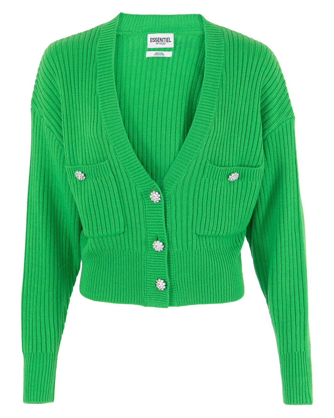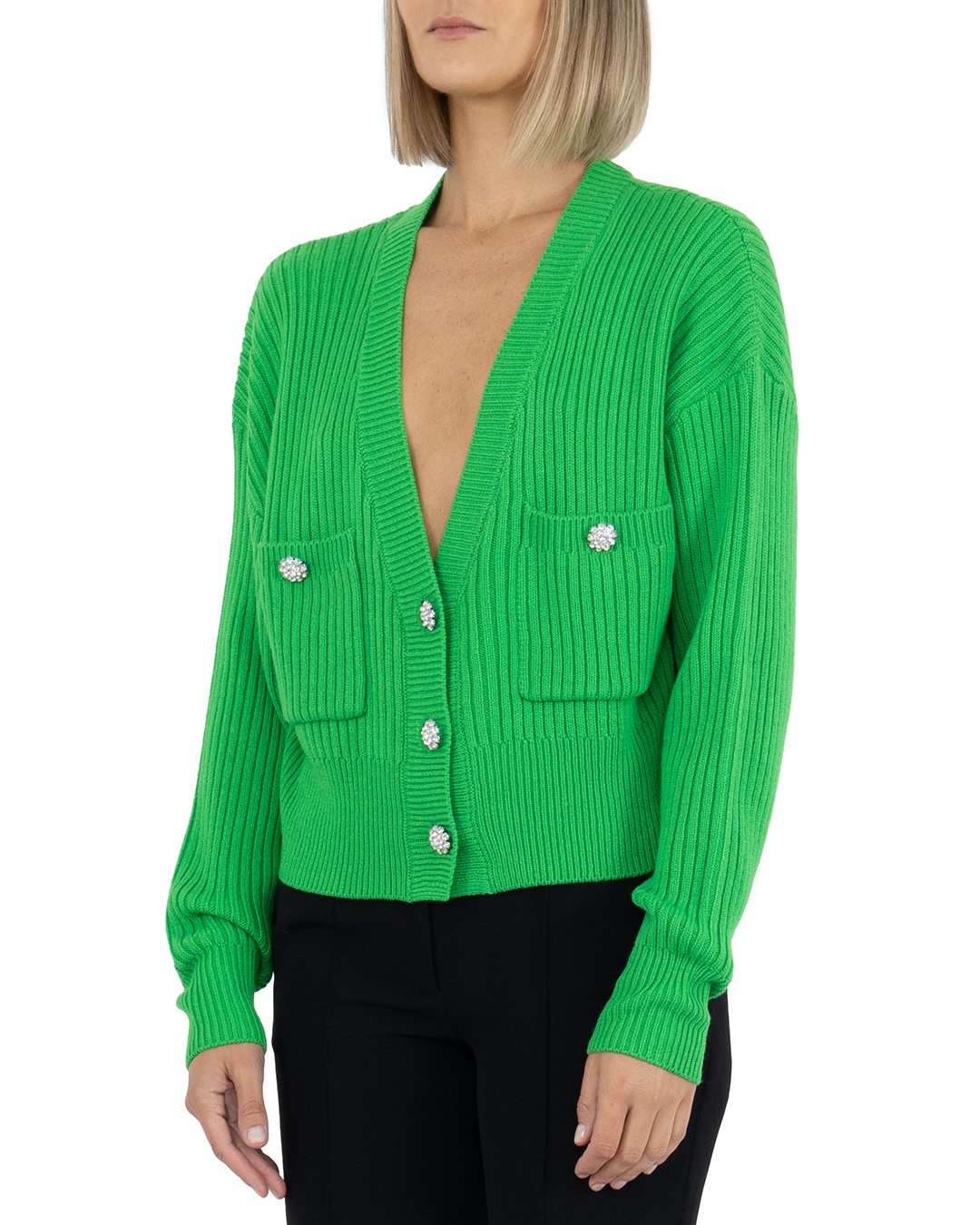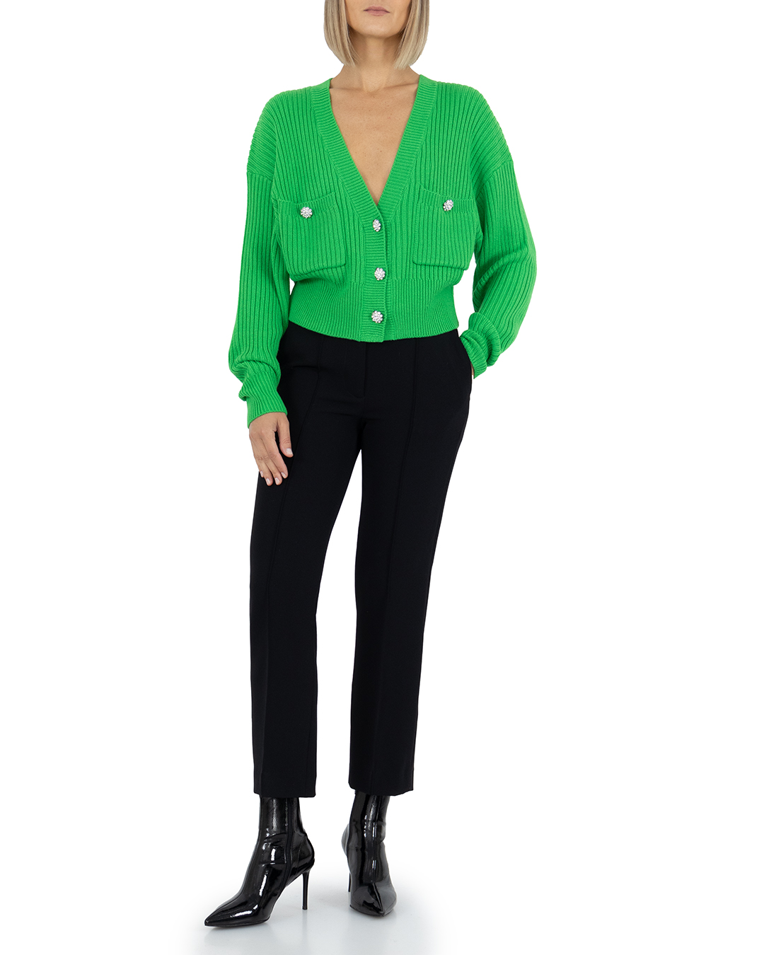 Укороченный кардиган с V-образным вырезом связан в технике английской резинки, который сужается к бедрам, что делает его идеальным для сочетания с брюками или юбкой с высокой талией. На двух накладных карманах и по линии застежки расположили стильные пуговицы с камнями.