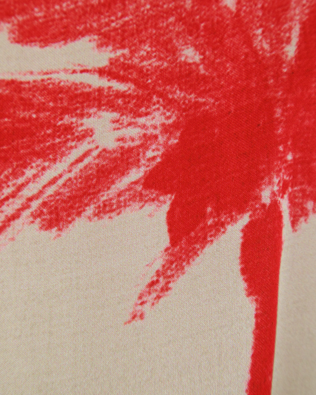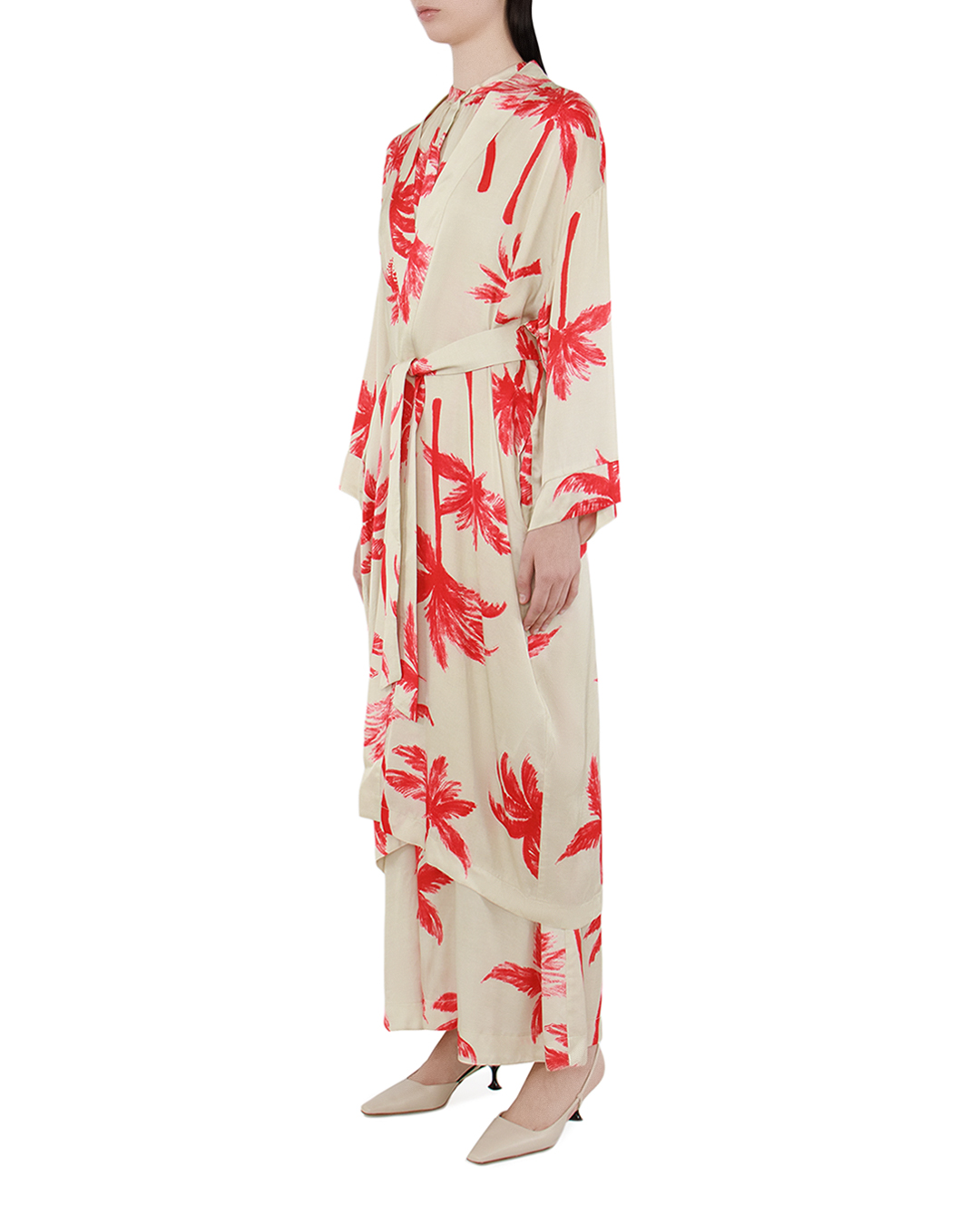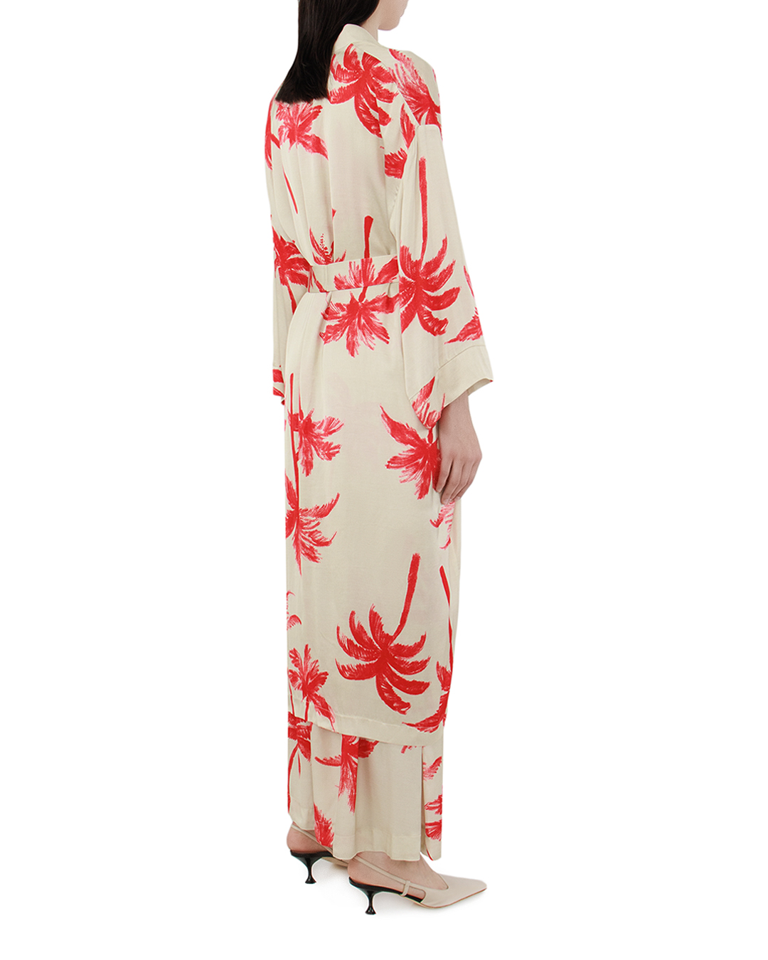 Это кимоно — гармоничное сочетание экзотической роскоши и утонченной элегантности. Бежевый фон оживляется яркими коралловыми узорами, изображающими пальмовые мотивы, что придаёт изделию динамику и свежесть, идеально сочетаясь с летними образами. Легкая ткань обеспечивает свободу движений и комфорт, придавая кимоно воздушность и легкость. Широкие рукава создают классический силуэт и добавляют объем, создавая эффект парения. Пояс, выполненный из той же ткани, подчеркивает талию, позволяя адаптировать посадку и акцентировать женственность линии фигуры. Этот элемент добавляет функциональности и эстетической завершенности. Отделка края аккуратной строчкой и простой, но элегантный запах подчеркивают мастерство исполнения и внимание к деталям. Это кимоно можно носить как поверх купального костюма на пляже, так и в городе, сочетая с легкими платьями или брюками, привнося в образ нотку экзотики и элегантности.
