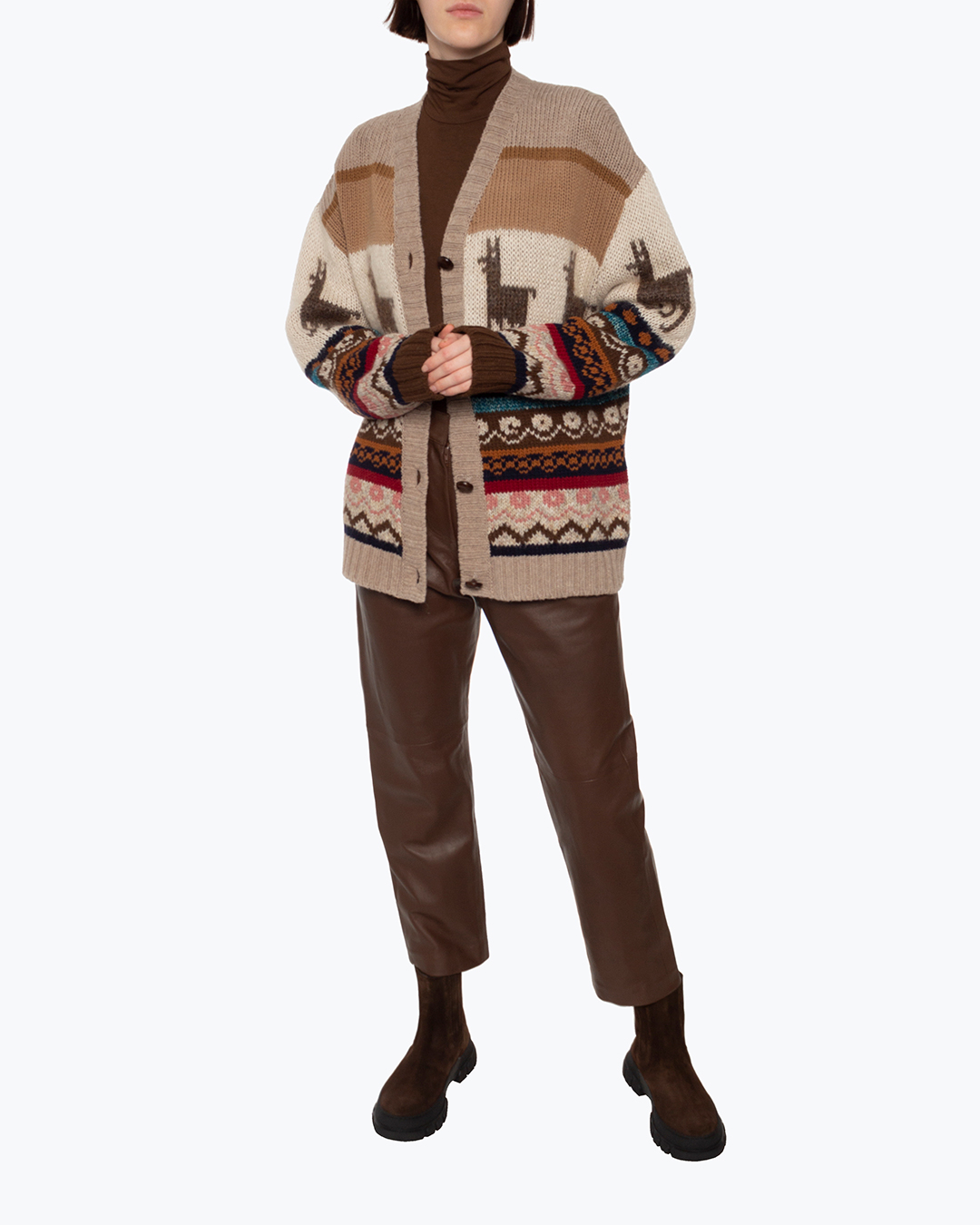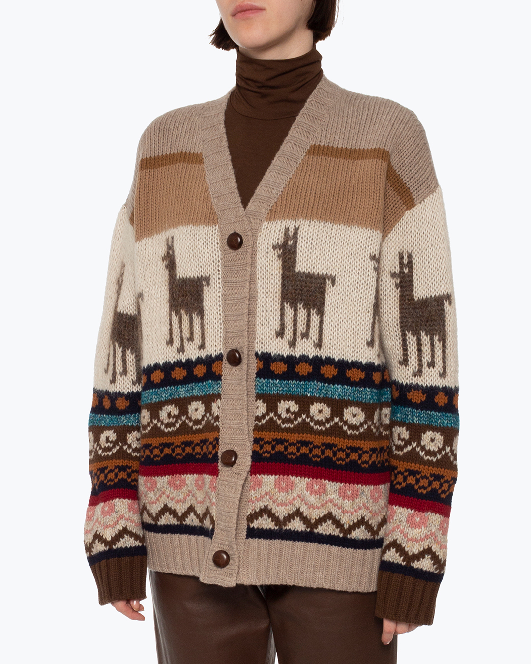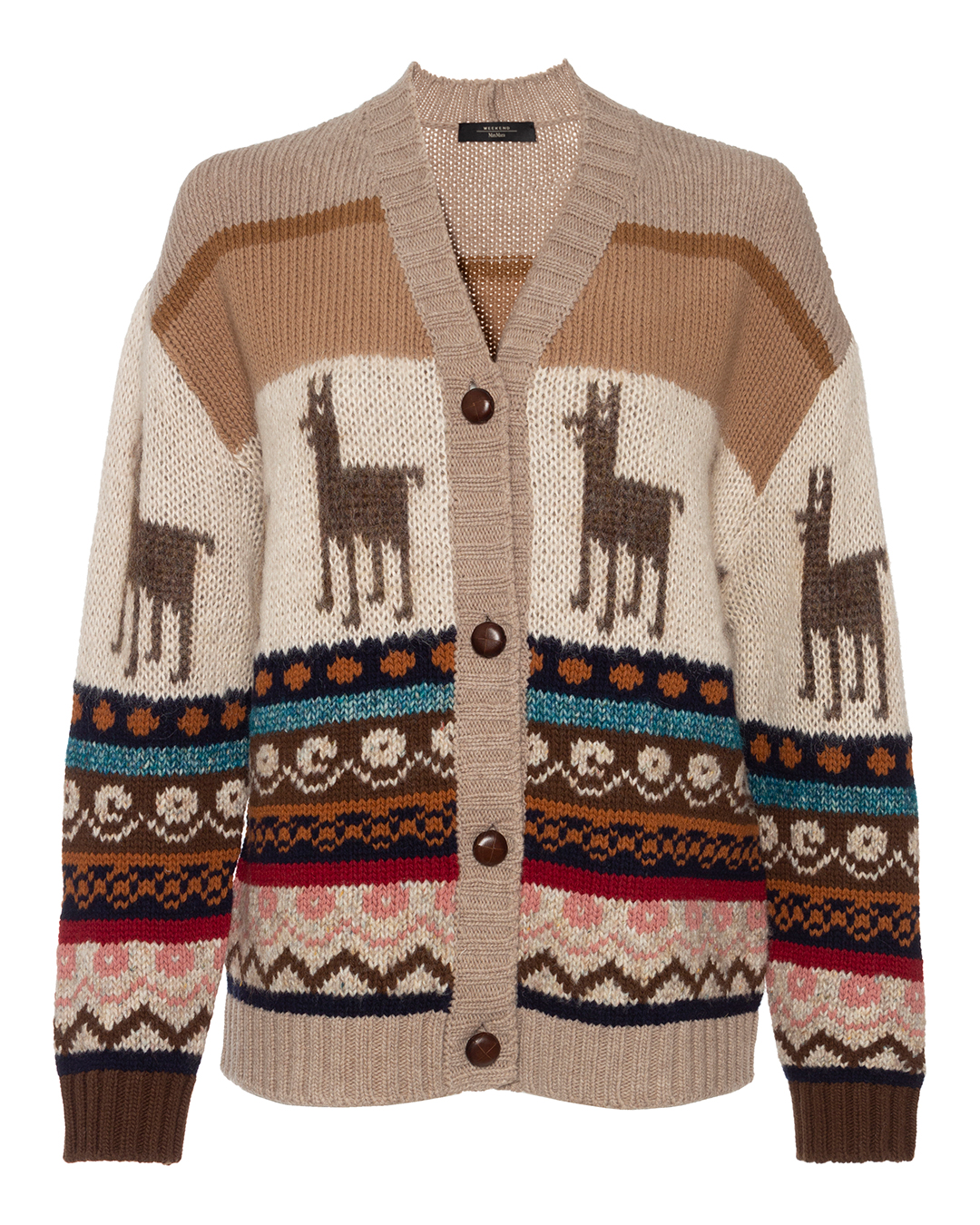 Вязаный кардиган Max Mara Weekend из шерсти с узором. Уютное изделие прямого силуэта с застежкой на пуговицы со спущенной линией плеч и длинными рукавами.