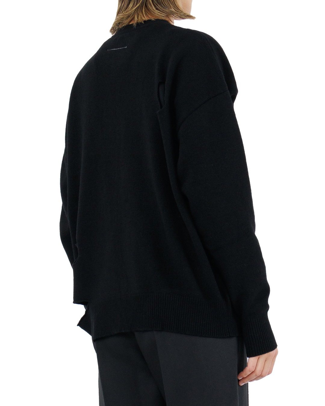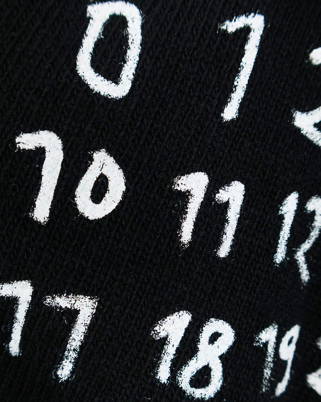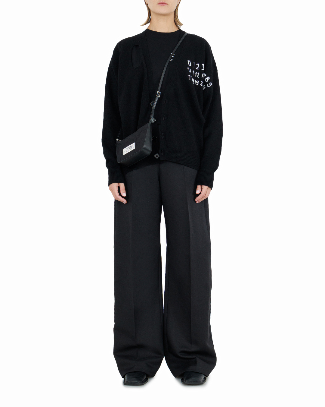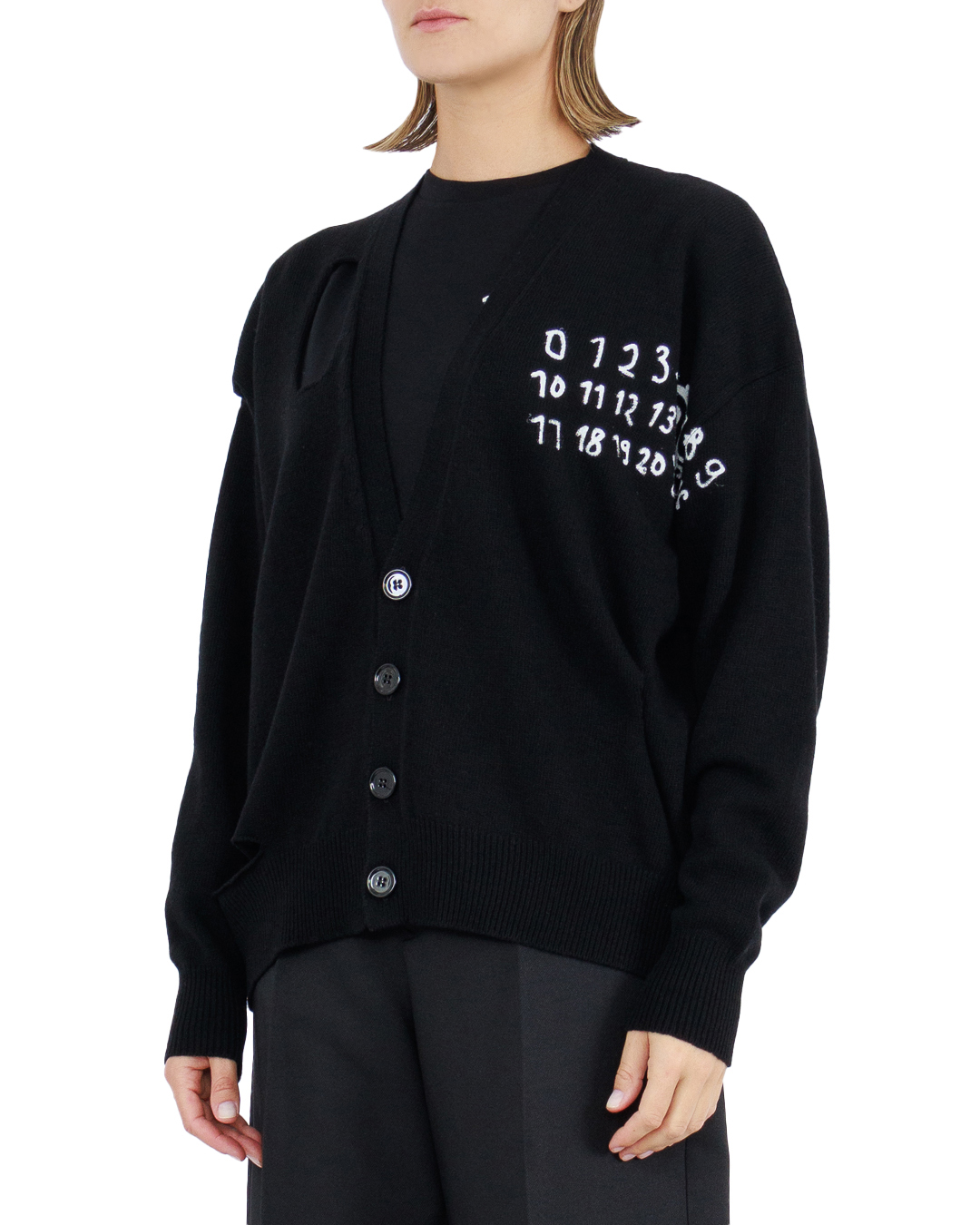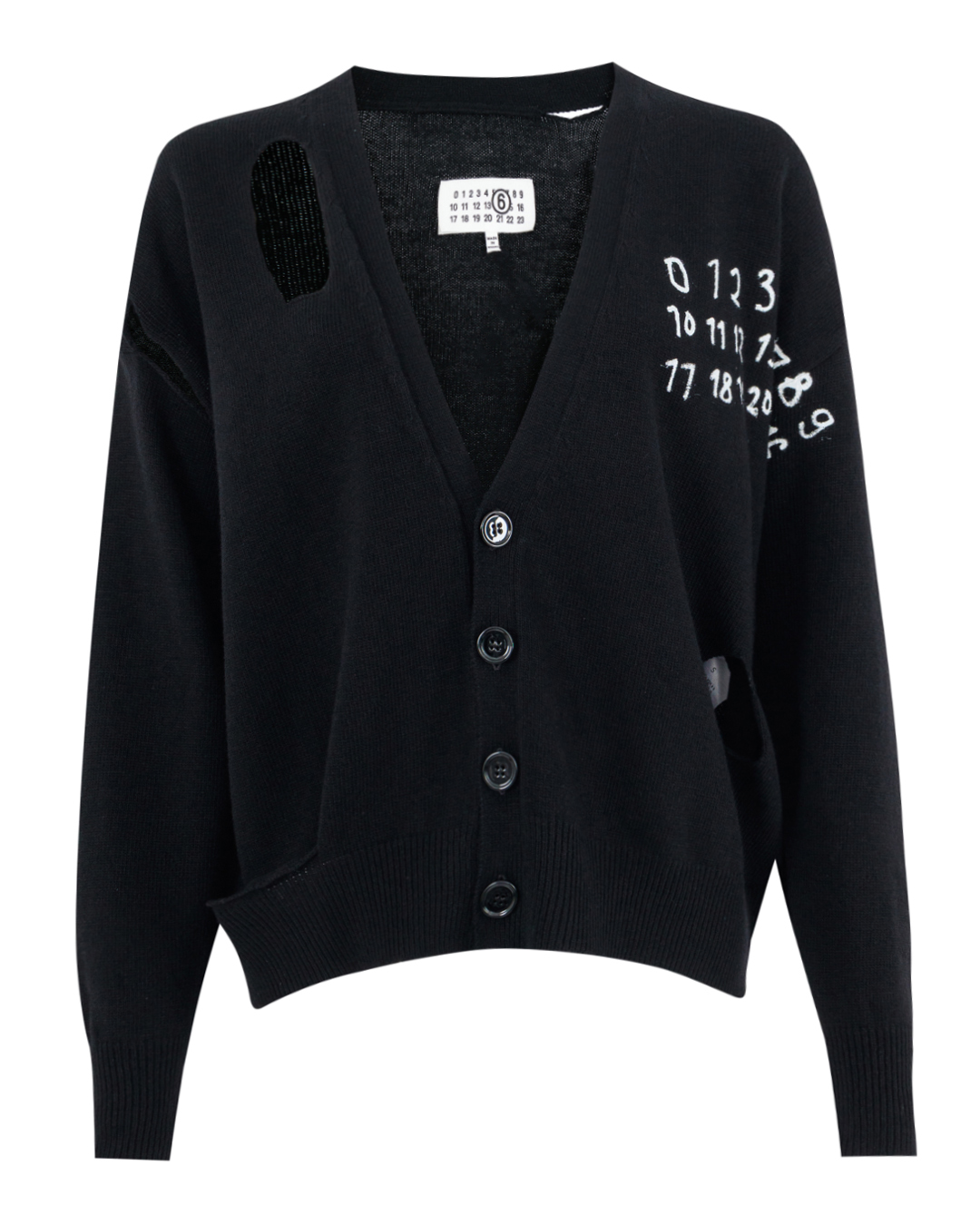 Укороченный кардиган из шерстяной пряжи. Модель с V – образным вырезом застегивается на пуговицы. Изделие декорировано искусственными разрезами и числовым кодом на груди в стиле бренда.
