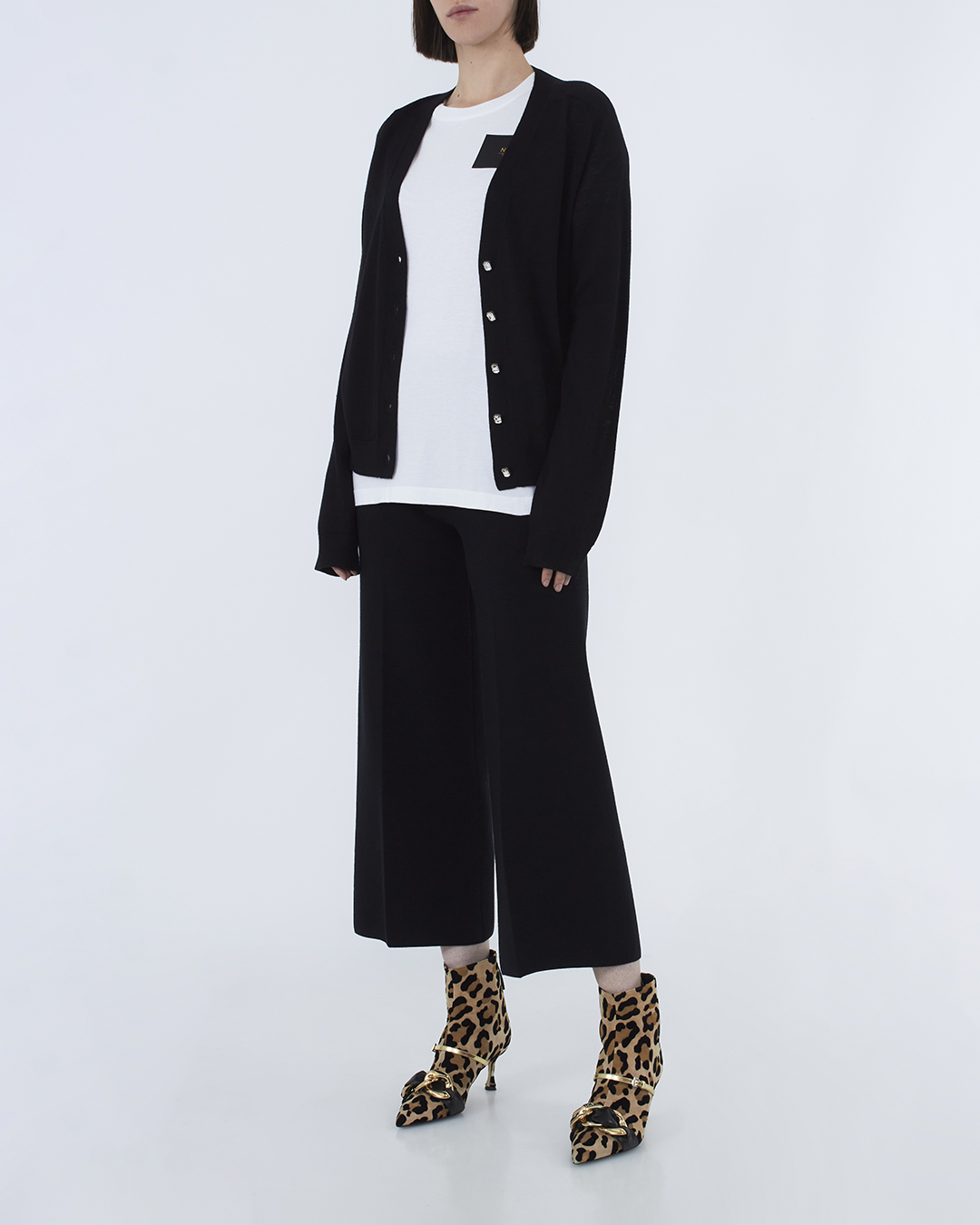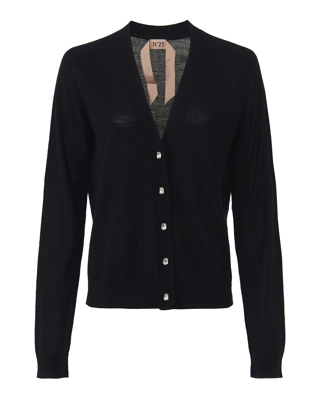 Кардиган № 21 из новой коллекции сезона FW’22/23 выполнен из тонкой трикотажной шерсти черного цвета. Эластичное изделие полуприлегающего силуэта с застежкой на пуговицы-кристаллы.