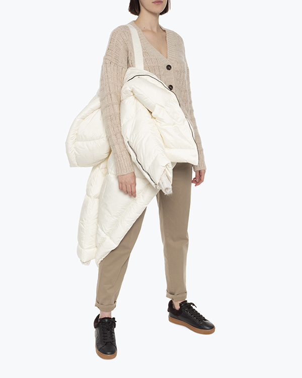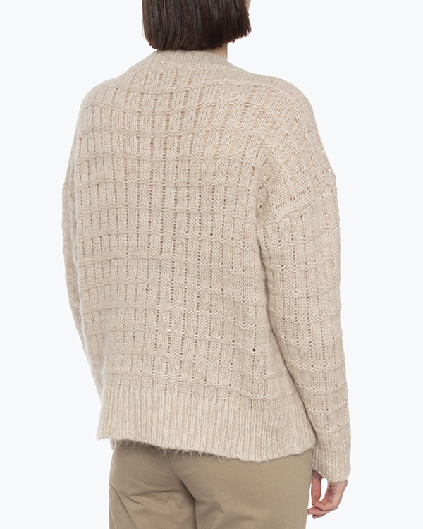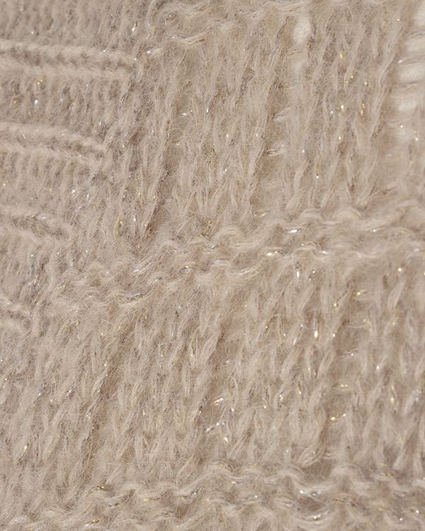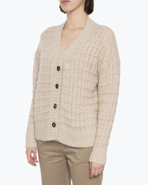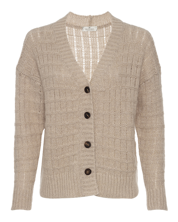 Кардиган фактурной вязки из смесовой пряжи из вискозы с добавлением мохера, шерсти альпаки с добавлением блестящей нити. Эластичное изделие с застежкой на пуговицы и спущенной линией плеч.