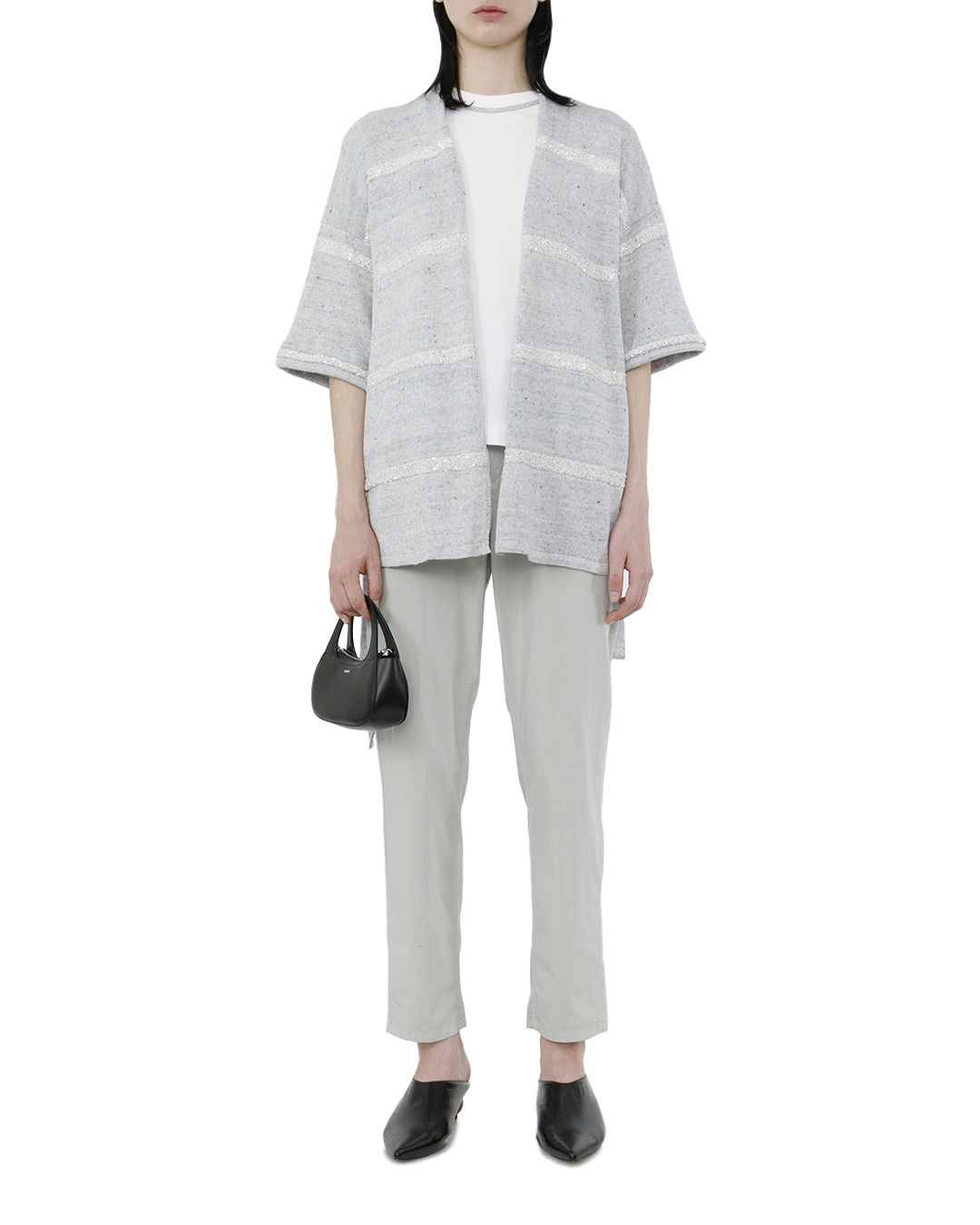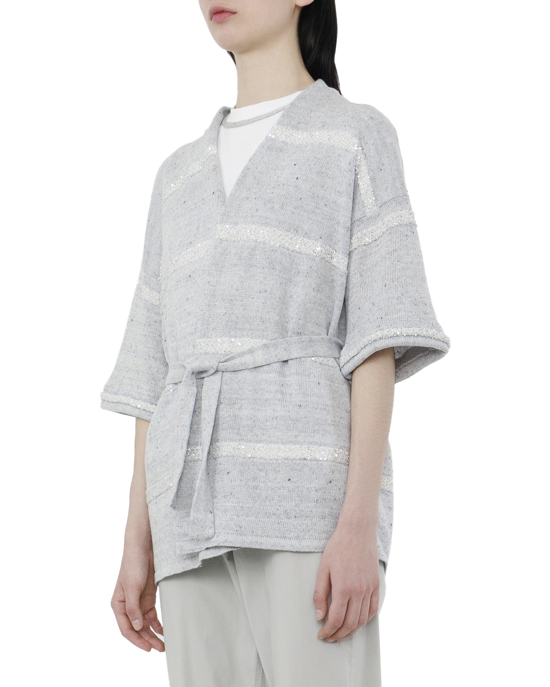 Этот кардиган представляет собой идеальное сочетание комфорта и изящества, добавляя в гардероб свежесть и невесомость благодаря своему нежному голубому оттенку. Изготовленный из мягкой пряжи, он предлагает уют и тепло в любое время года. Халатный крой кардигана обеспечивает свободу и расслабленность, в то время как пояс на талии подчёркивает силуэт, создавая женственные линии и добавляя нотку роскоши. Свободные рукава три четверти длиной вносят баланс между изысканностью и повседневной практичностью. Элегантные горизонтальные полосы с деликатным блеском добавляют текстуру и зрительное разнообразие, привнося в дизайн элемент игривости и сияния. Этот декоративный акцент делает кардиган более выразительным и интересным. Кардиган открывает безграничные возможности для сочетания: от использования поверх топов и блуз до комбинирования с платьями для создания слоистых, стильных образов. Этот элемент гардероба — идеальный компаньон для создания непринуждённого и одновременно элегантного стиля.