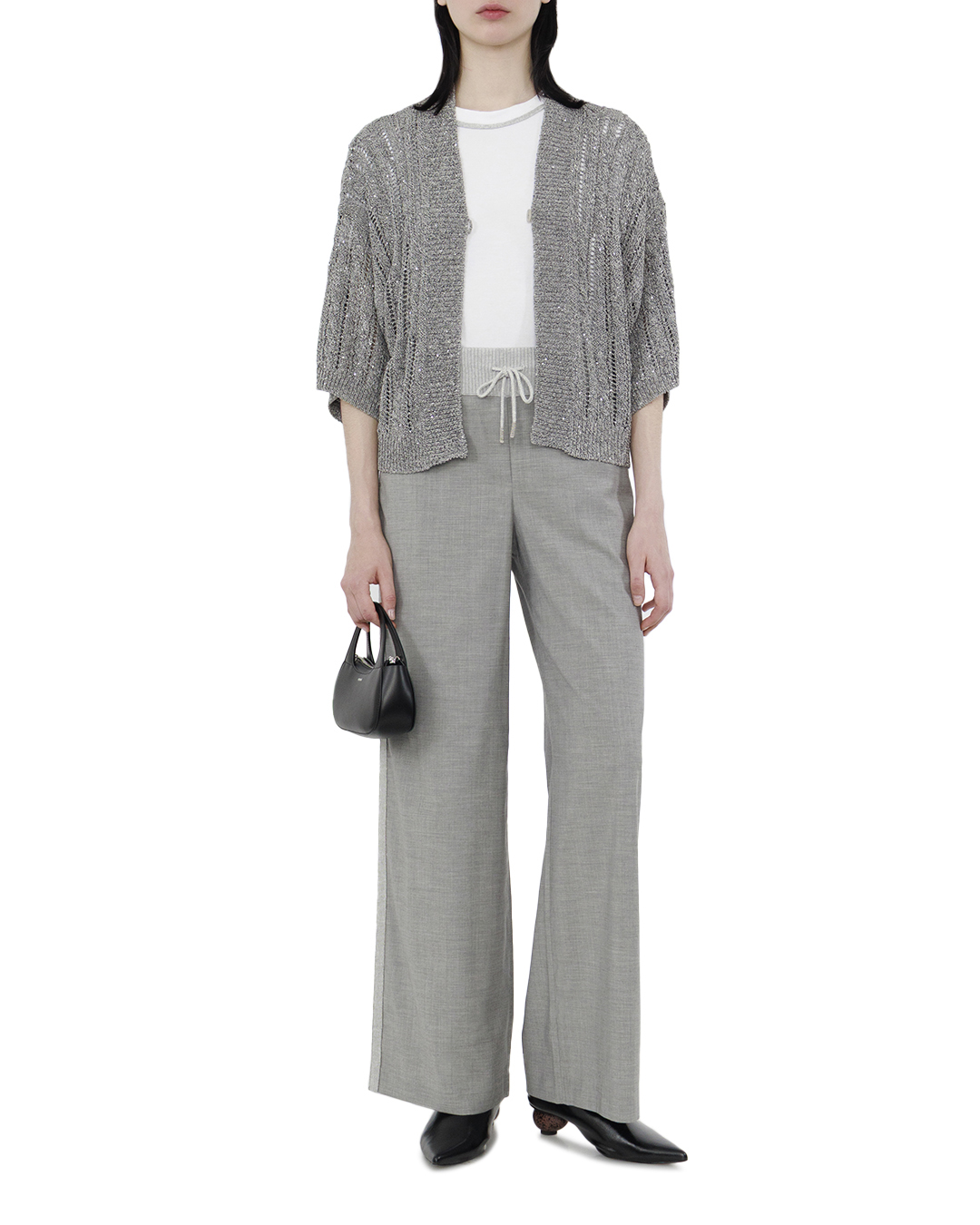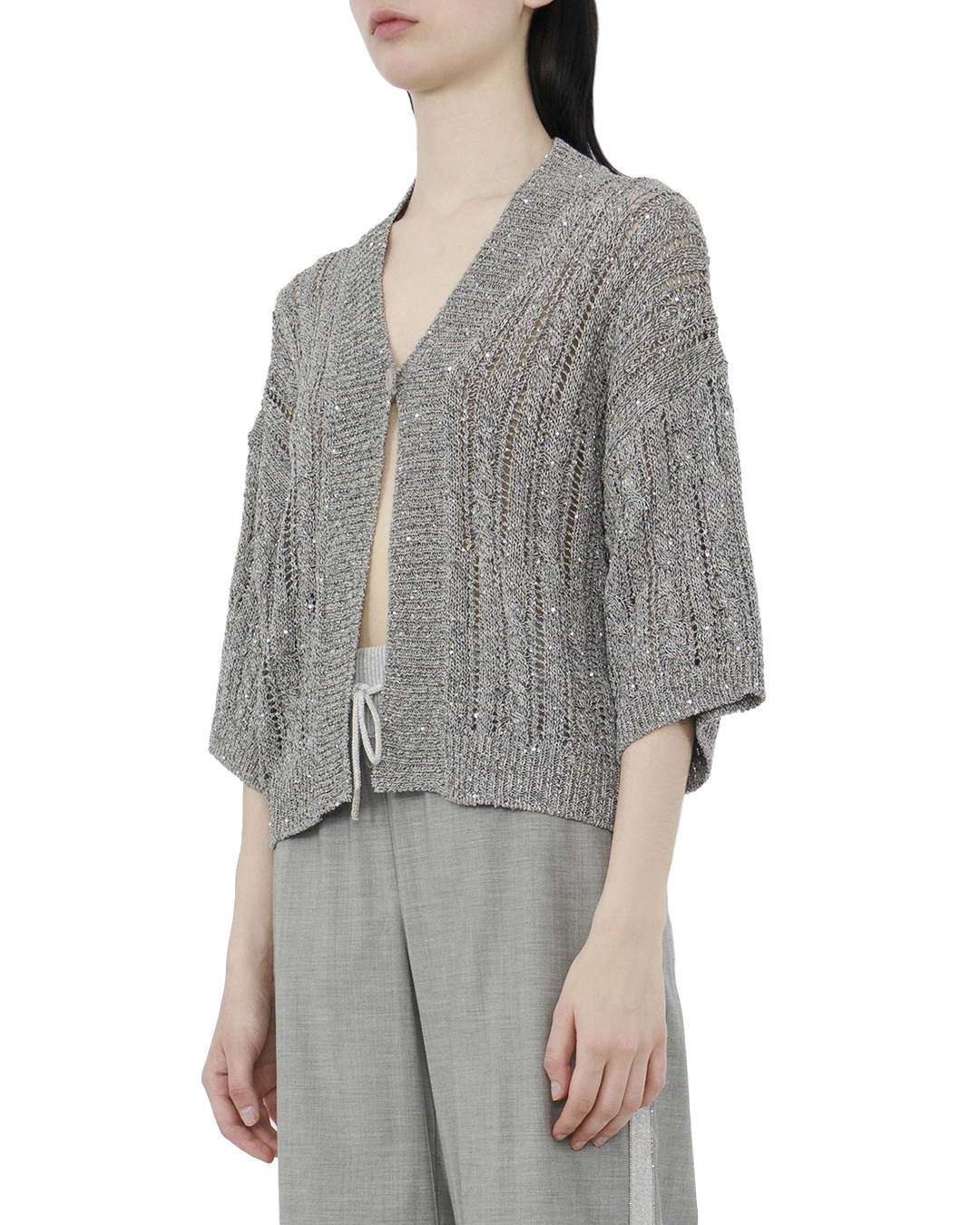 Этот кардиган — шедевр вязального искусства, который привносит в гардероб нотку классической элегантности и нежности. Выполненный в благородном сером оттенке, он идеально подходит для создания сдержанных и утончённых образов. Фактурная вязка делает кардиган особенно выразительным, обеспечивая интересную игру света и тени, что добавляет глубину и сложность дизайну. Крупные ажурные элементы придают изделию легкость и воздушность, создавая ощущение лёгкого облака. Укороченная длина и свободный крой дарят свободу движений, а три четверти рукава добавляют непринужденности и уютной непринужденности. V-образный вырез горловины удлиняет шею и создает элегантный контур, прекрасно подчеркивая любой наряд. Единичная застёжка на пуговицу добавляет стильный акцент, подчёркивая внимание к мелким деталям и делая кардиган изысканным дополнением любого ансамбля. Этот кардиган станет универсальным элементом для многослойных образов, идеально сочетаясь как с повседневными джинсами, так и с вечерними платьями.