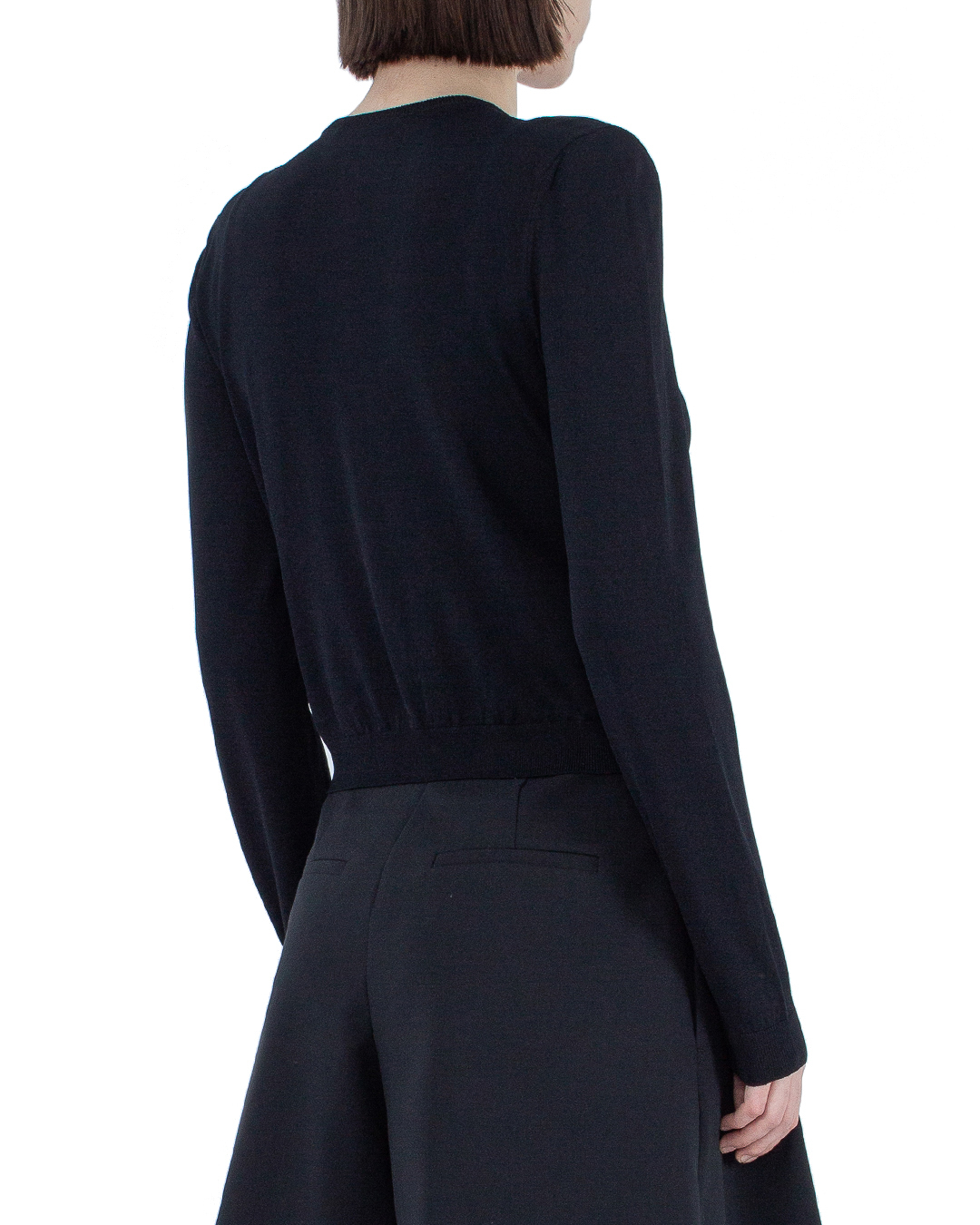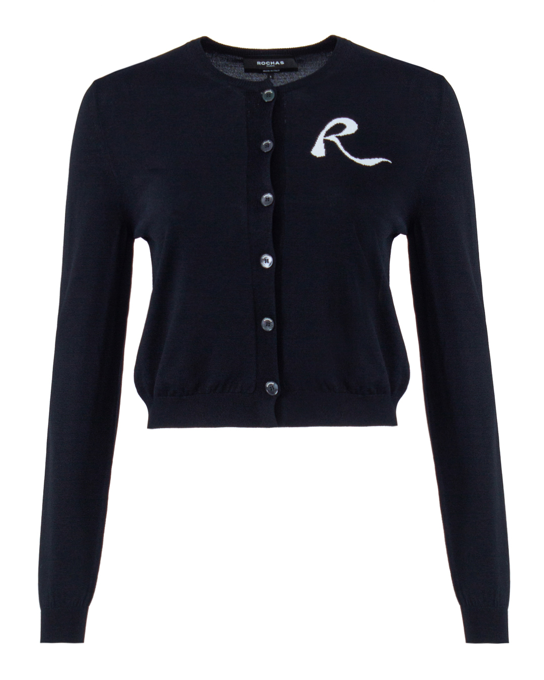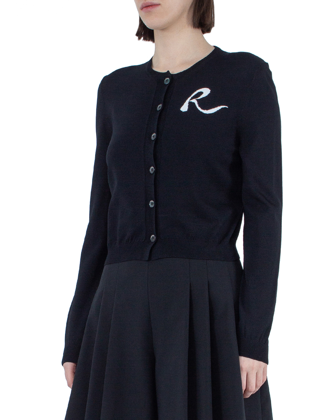Женский кардиган из трикотажного мягкого материала черного цвета с лаконичным логотипом бренда. Укороченное изделие с застежкой на пуговицы.