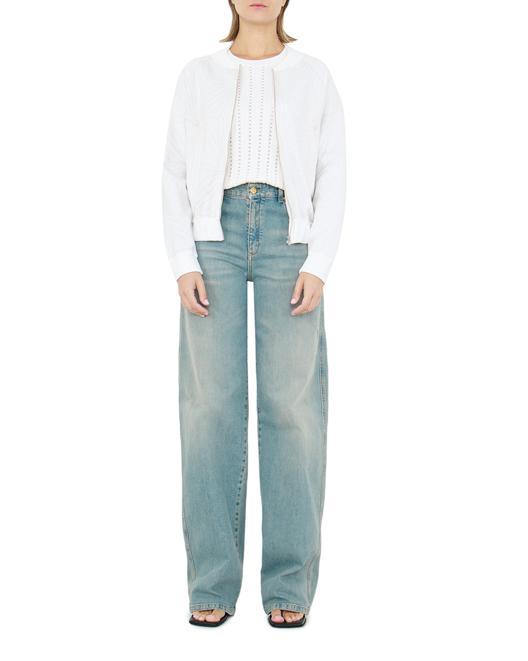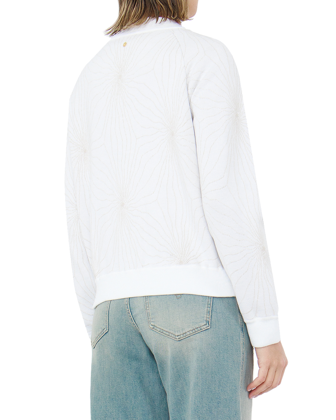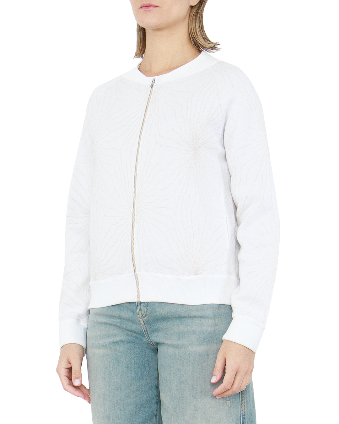 Эта стильная олимпийка сочетает в себе спортивный шик и изысканную элегантность. Выполненная из легкого и приятного на ощупь материала, она обеспечивает комфорт и свободу движений, оставаясь при этом модным элементом гардероба. Классический крой с акцентом на прямые линии создает чёткий силуэт, который идеально подходит для создания повседневных образов. Вставки с декоративными узорами привносят текстурный интерес, добавляя уникальность и изящество в общий дизайн. Молния по всей длине позволяет регулировать степень закрытости, создавая многослойность и адаптивность в носке. Манжеты и воротник из мягкой резинки обеспечивают идеальную посадку и лёгкость. Эта олимпийка станет прекрасным акцентом вашего гардероба, добавляя стиль и утончённость к вашему повседневному образу.
