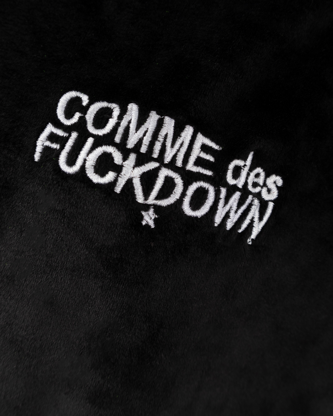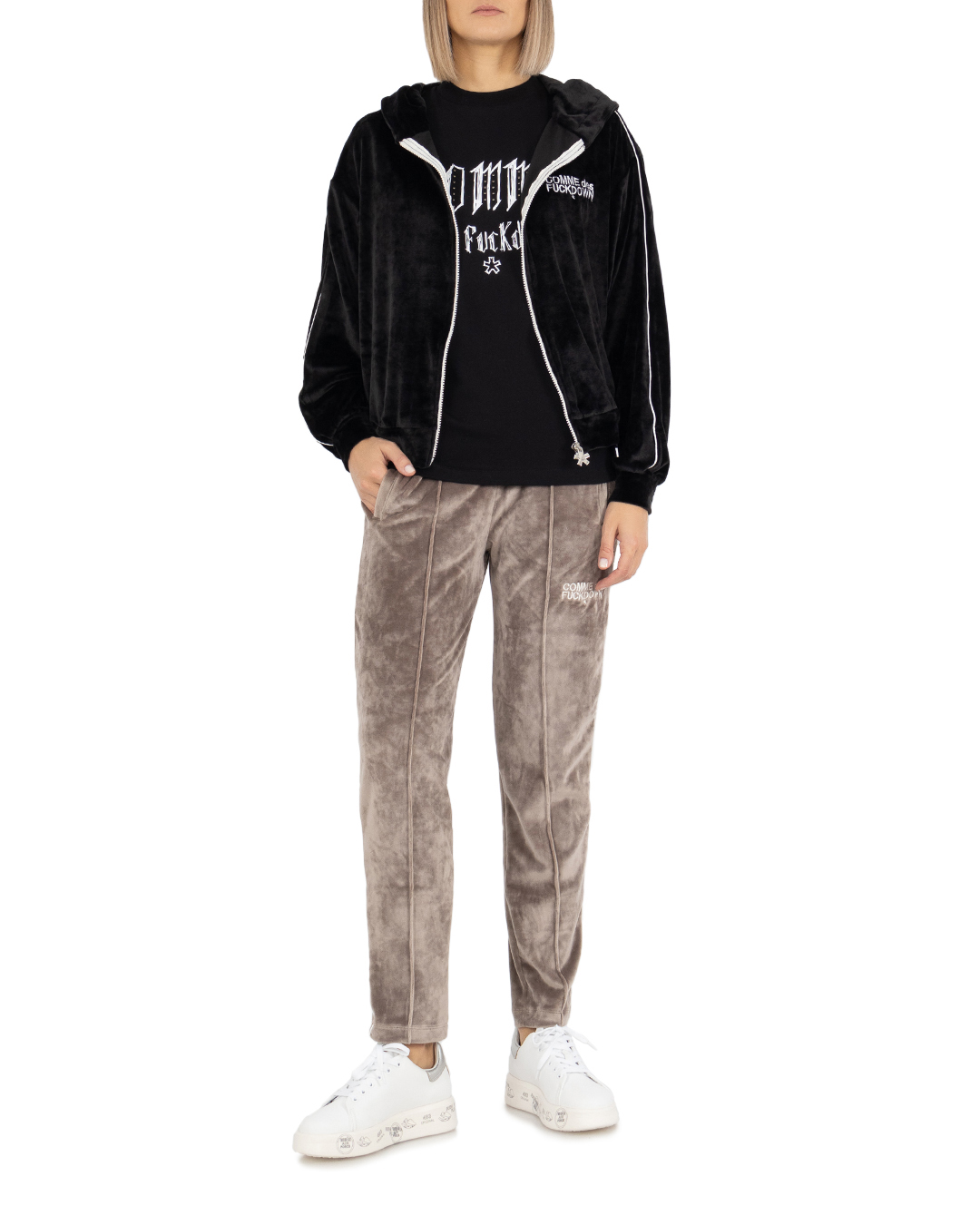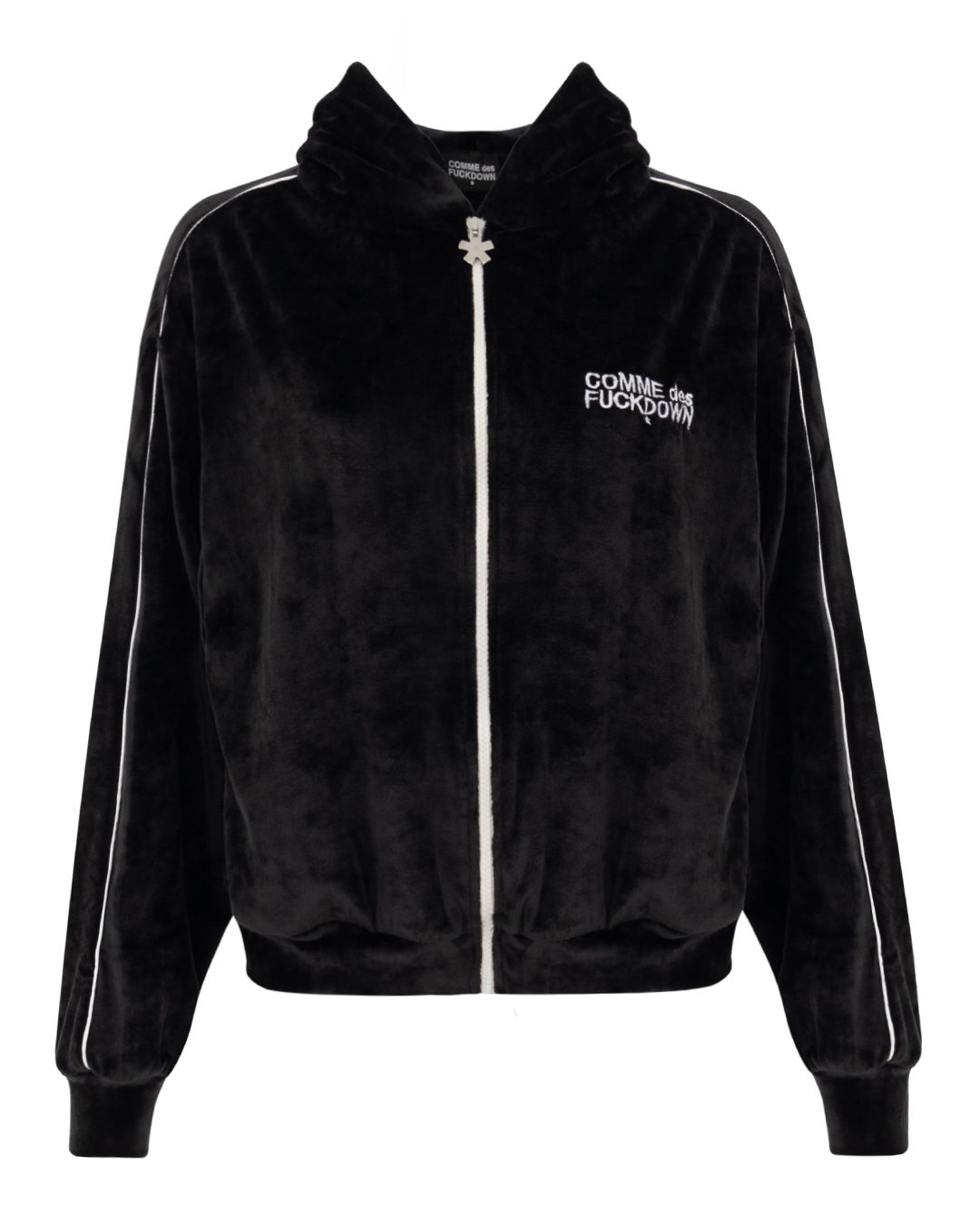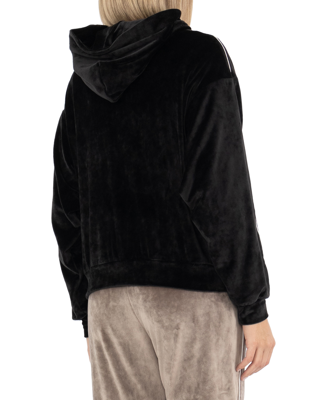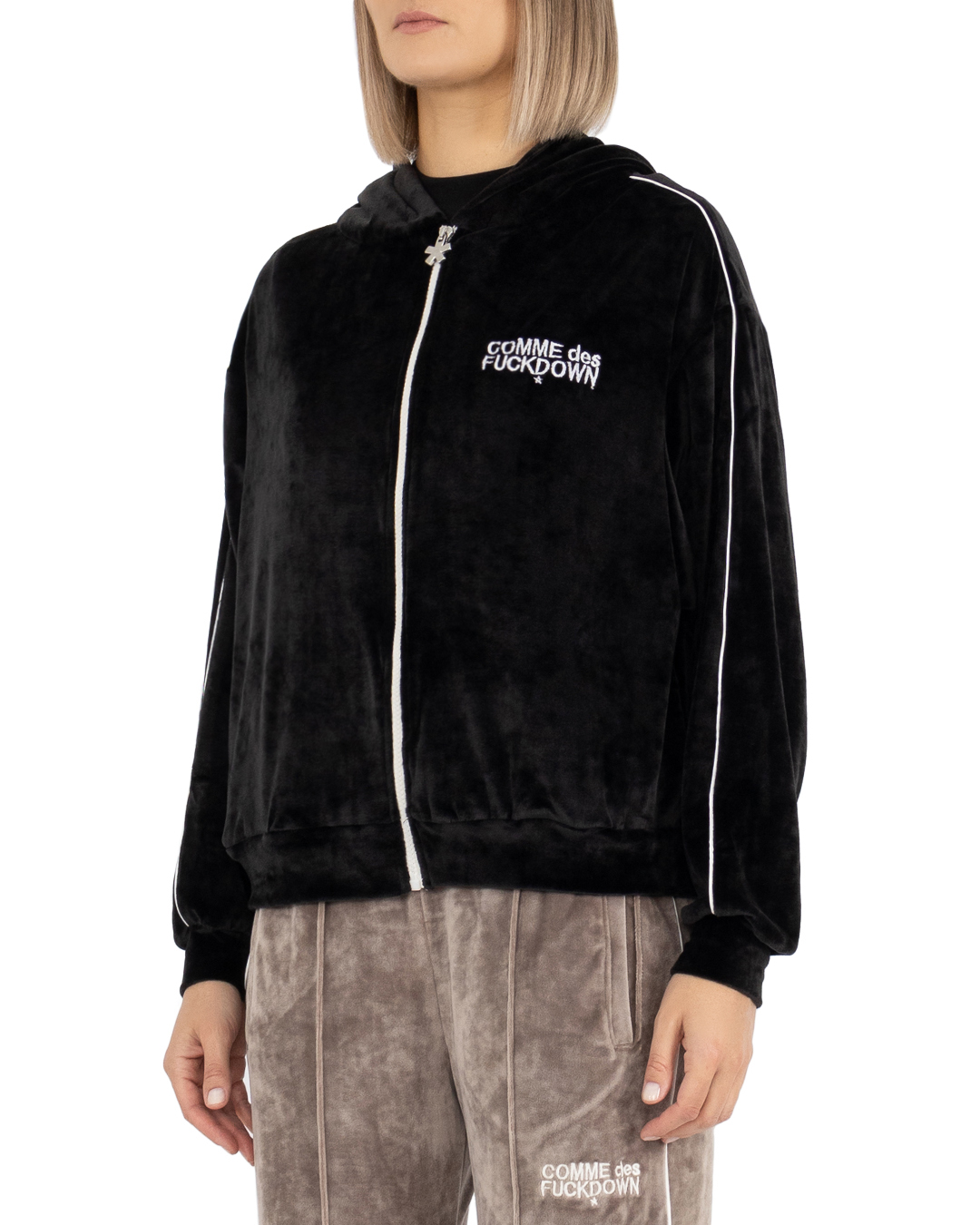 Олимпийка из велюра с капюшоном и вышитым логотипом на груди. Линию рукава украшает тонкая лампаса. Модель свободного кроя с застежкой на молнию дополнена резинкой по линии низа и на манжете