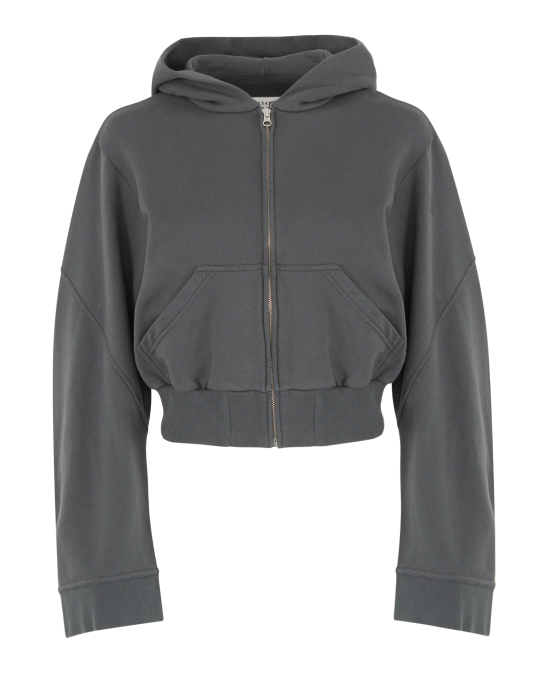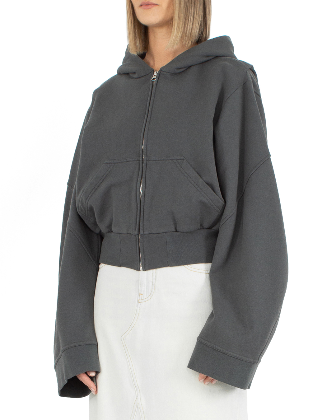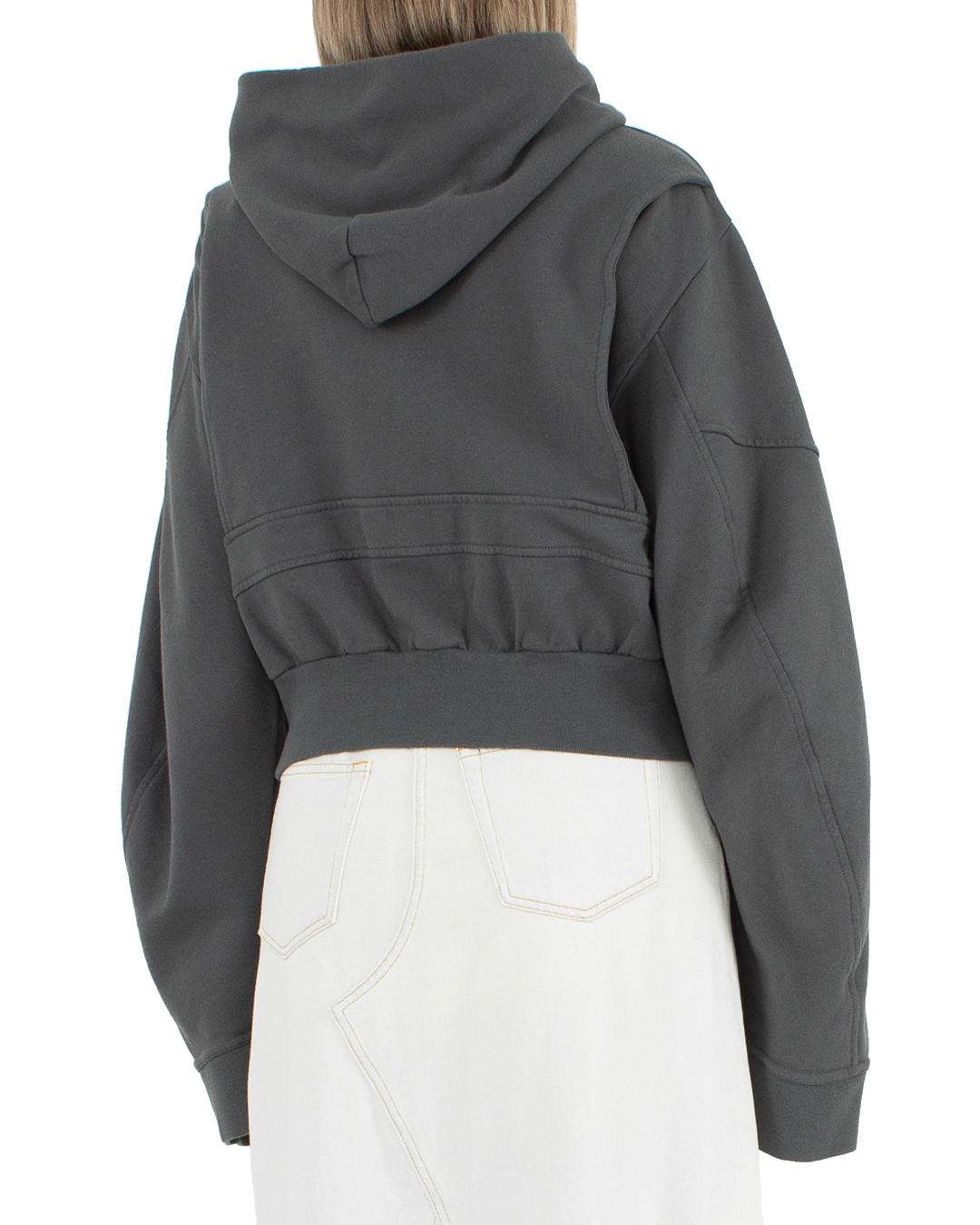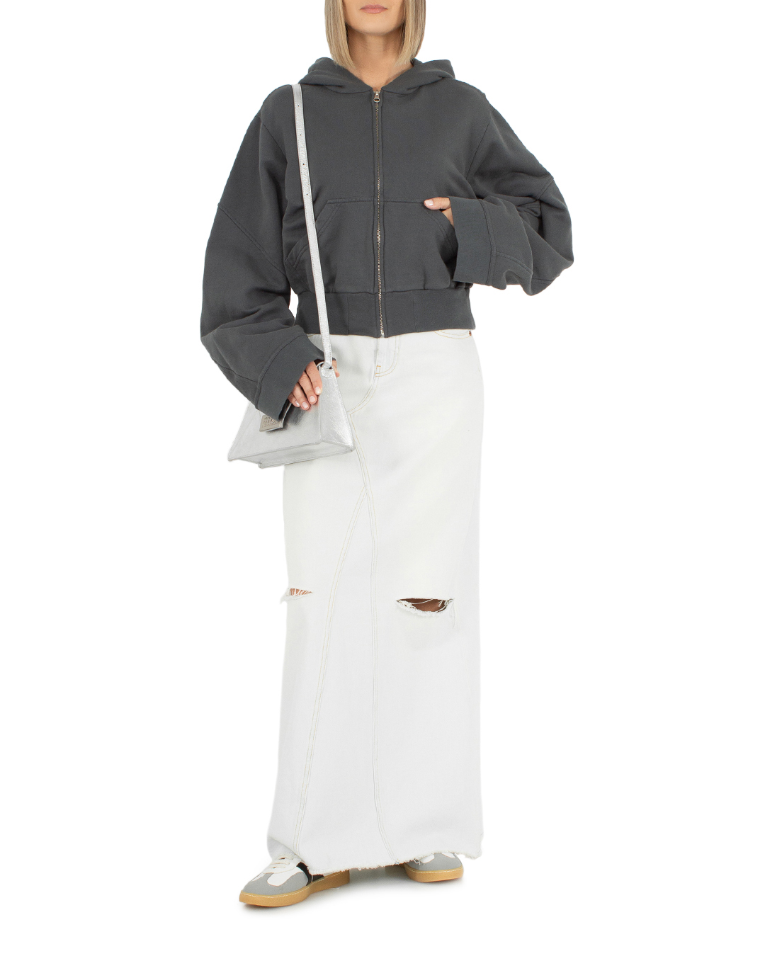 Худи MM6 Maison Margiela из трикотажного хлопка серого оттенка. Модель в спортивном стиле с застежкой на молнию дополнено капюшоном и широкими длинными рукавами.