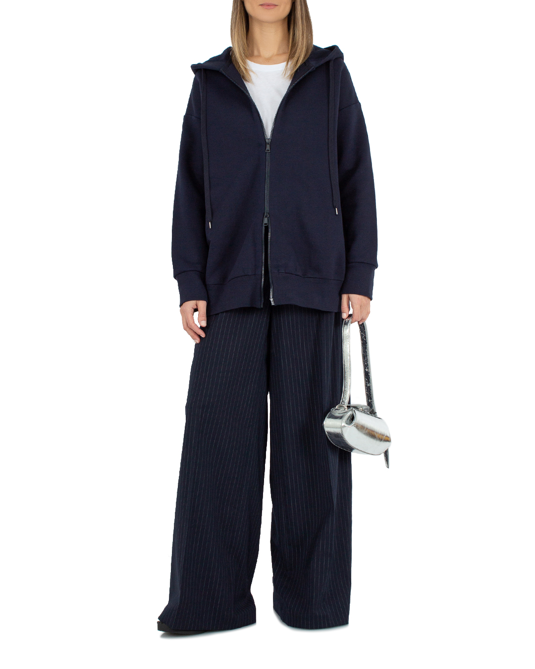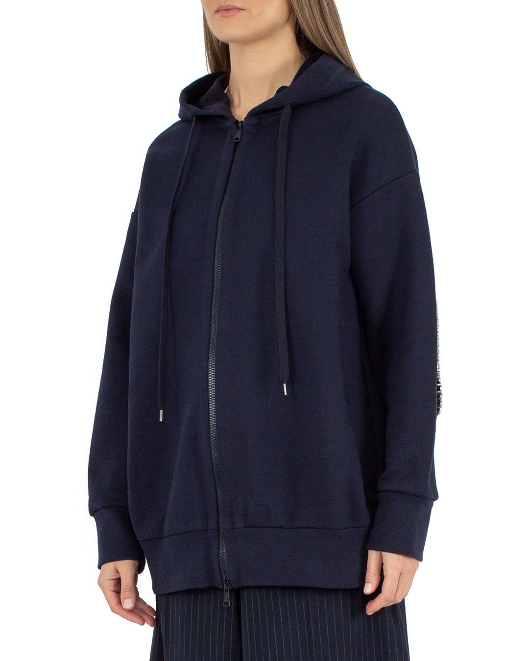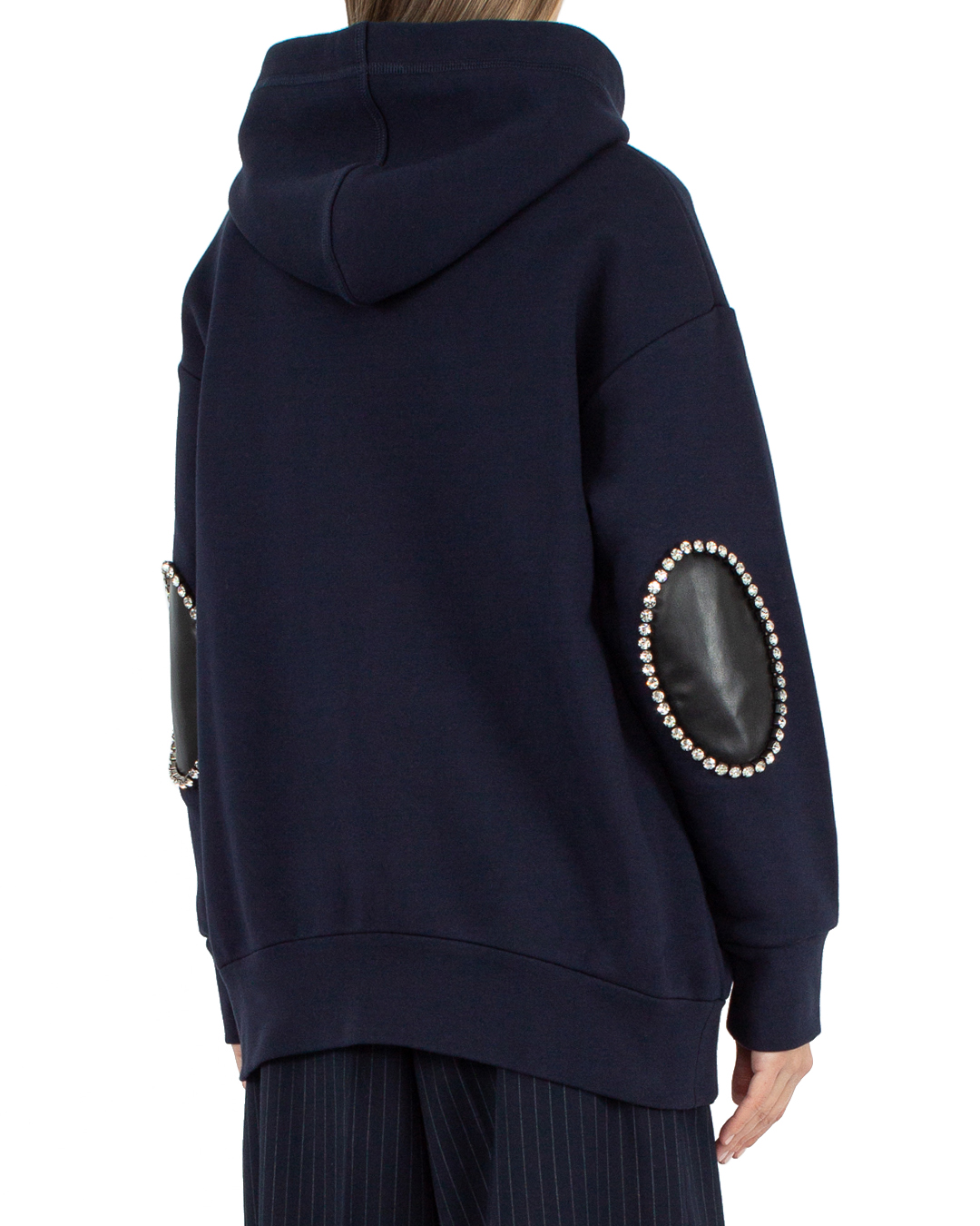 Худи на молнии № 21 сшили из трикотажного хлопка. Модель прямого силуэта oversize с капюшоном с завязками. Изделие с уплотненной отделкой в рубчик и декоративными заплатами на локтях с отделкой кристаллами.
