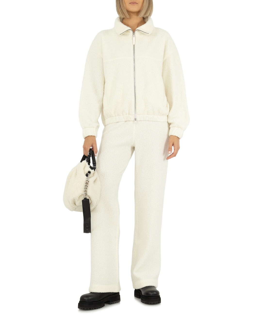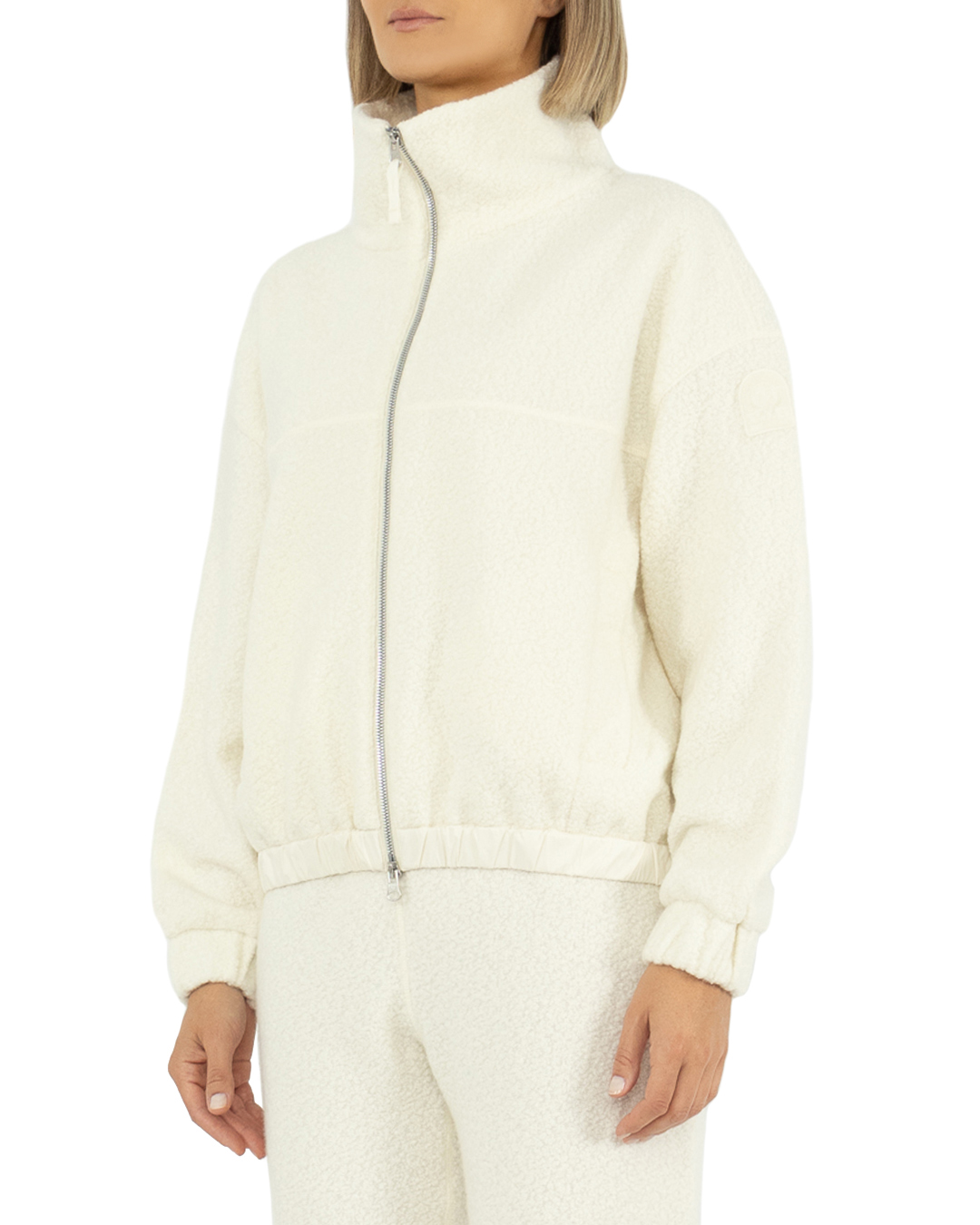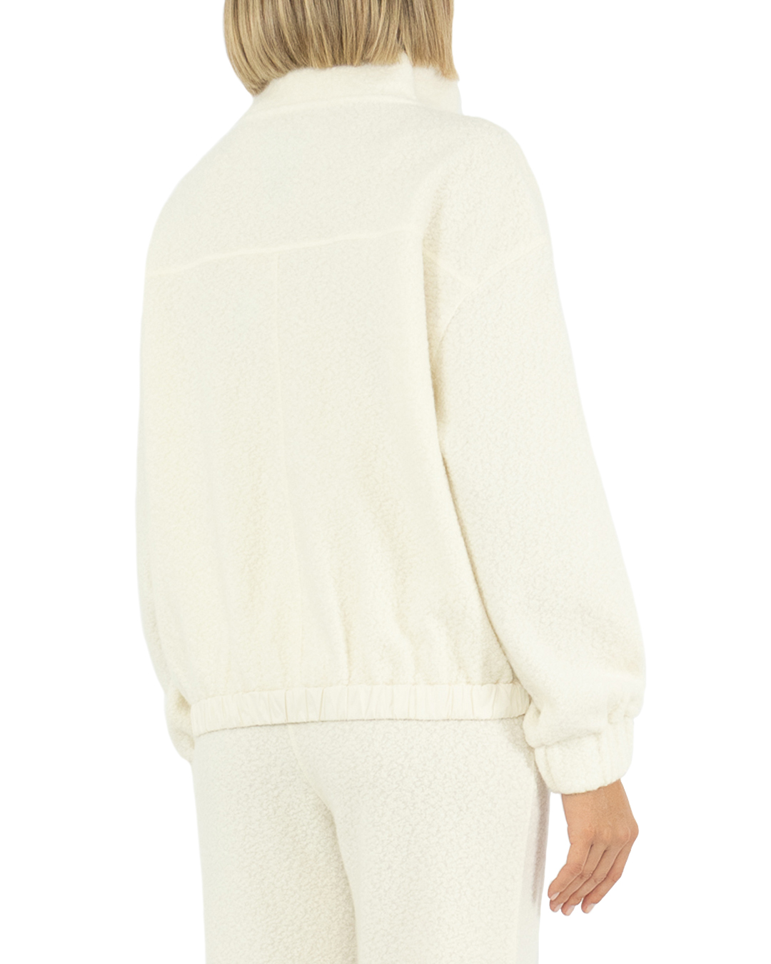 Модель из смеси натуральной шерсти из серии Cloud Sweatshirt и вискозы. Конструкция джерси с нерегулярной пряжей придает изделию эффект букле, который в сочетании со свободным кроем делает его чрезвычайно мягким и комфортным.