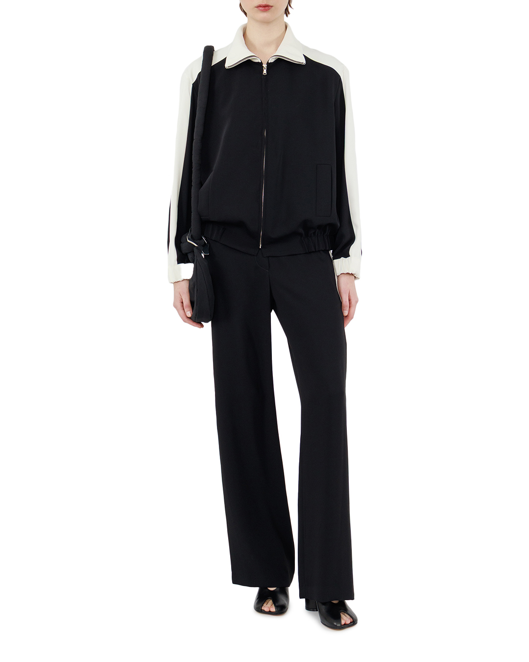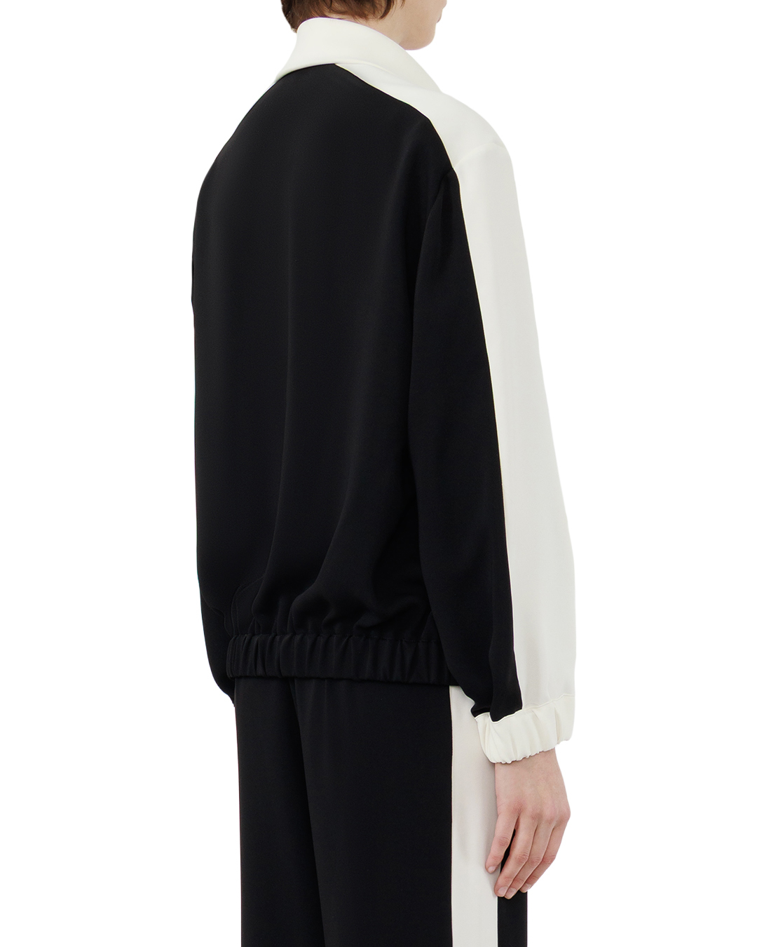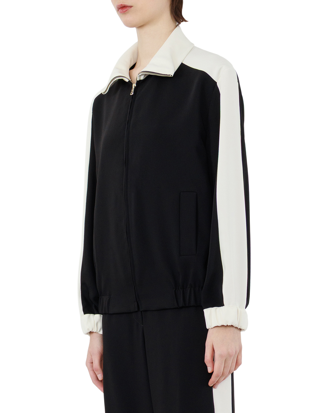 Эта олимпийка — воплощение лаконичной спортивной эстетики с ноткой элегантности. Контрастное сочетание глубокого чёрного корпуса и белоснежных вставок на рукавах и воротнике создаёт выразительный визуальный ритм, придавая вещи динамичность и свежесть. Свободный, но собранный крой обеспечивает комфорт без потери изящества — силуэт получается расслабленным, но структурированным. Центральная застёжка-молния не просто функциональна, а служит выразительным графическим акцентом, подчёркивающим вертикаль образа и визуально вытягивающим фигуру. Воротник-стойка с аккуратной окантовкой добавляет лаконичности, мягко структурируя верхнюю часть композиции и придавая силуэту собранность. Контрастные вставки на рукавах плавно переходят в манжеты, формируя ритмичный узор и подчёркивая спортивный характер вещи. Линии переходов выполнены безупречно — без заломов и неровностей, что говорит о тщательной проработке каждой детали. Манжеты аккуратно собраны, создают лёгкую драпировку, добавляя образу непринуждённости. Нижний край олимпийки оформлен эластичной резинкой, которая мягко облегает линию талии, не создавая излишнего давления. Эта деталь придаёт вещи завершённость и подчёркивает её универсальность — олимпийка одинаково органично впишется и в спортивный, и в повседневный образ. Вещь воплощает идею гармонии между функциональностью и стилем: каждая деталь продумана до мелочей, поддерживает общий ритм и не перегружает образ. Контраст цветов, чёткость линий и продуманная конструкция делают эту олимпийку не просто спортивной одеждой, а выразительным элементом гардероба.