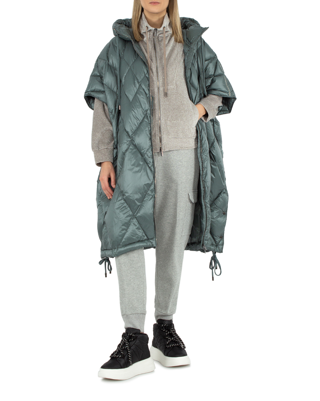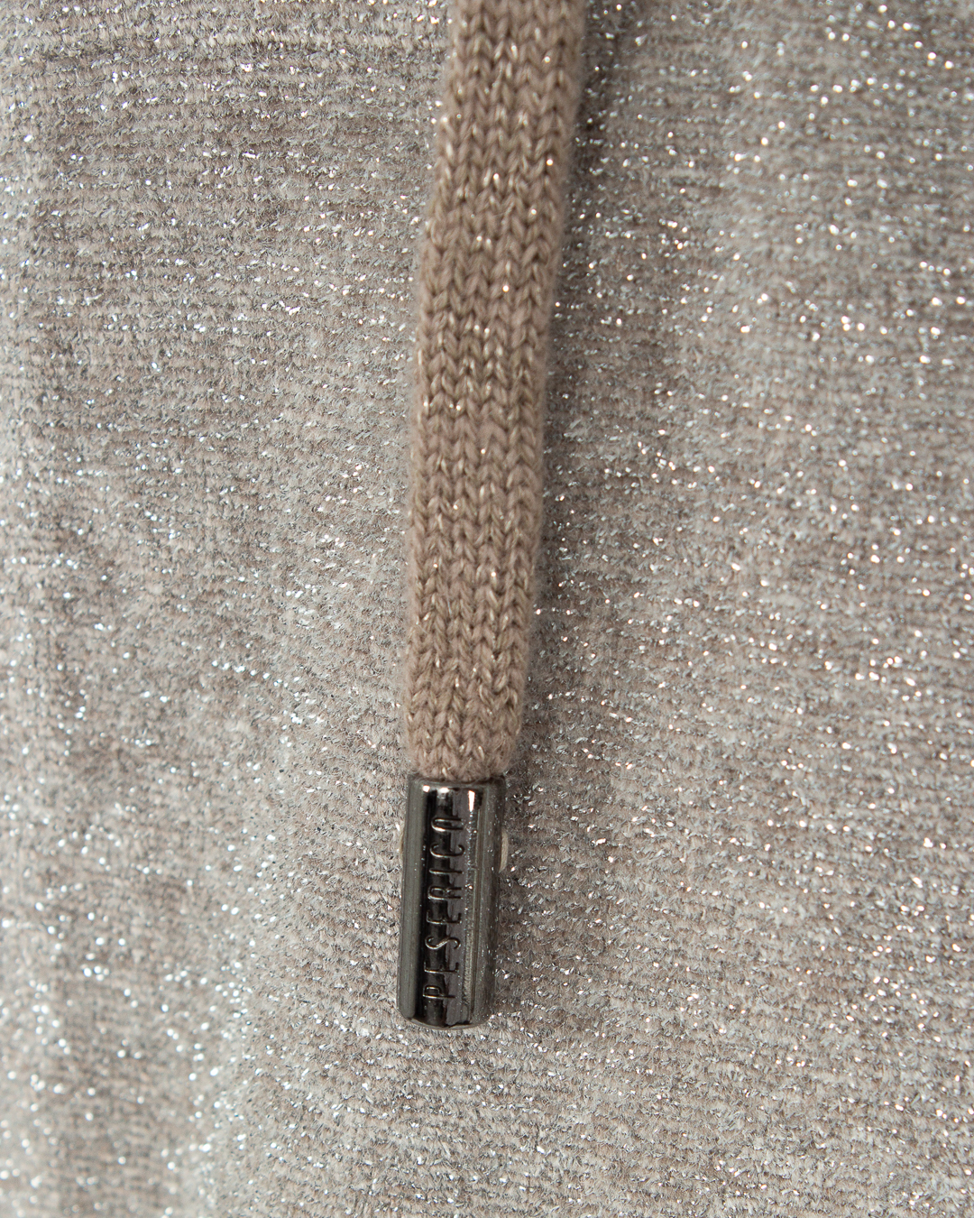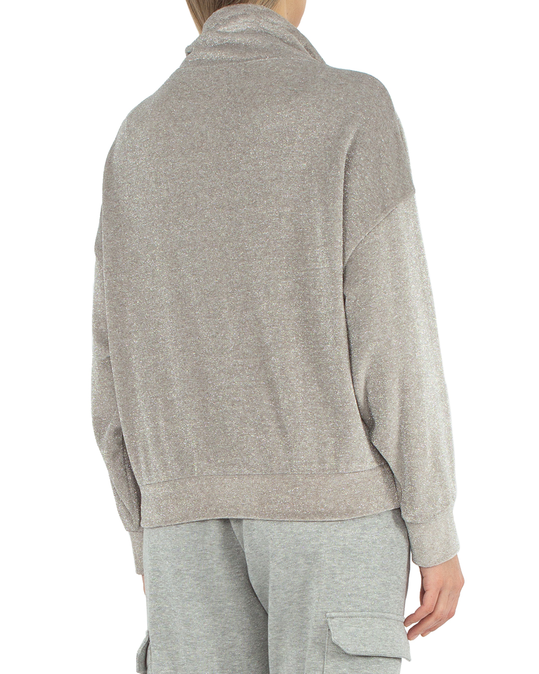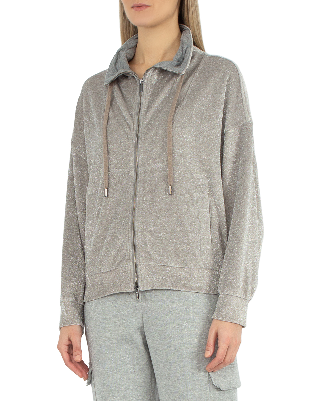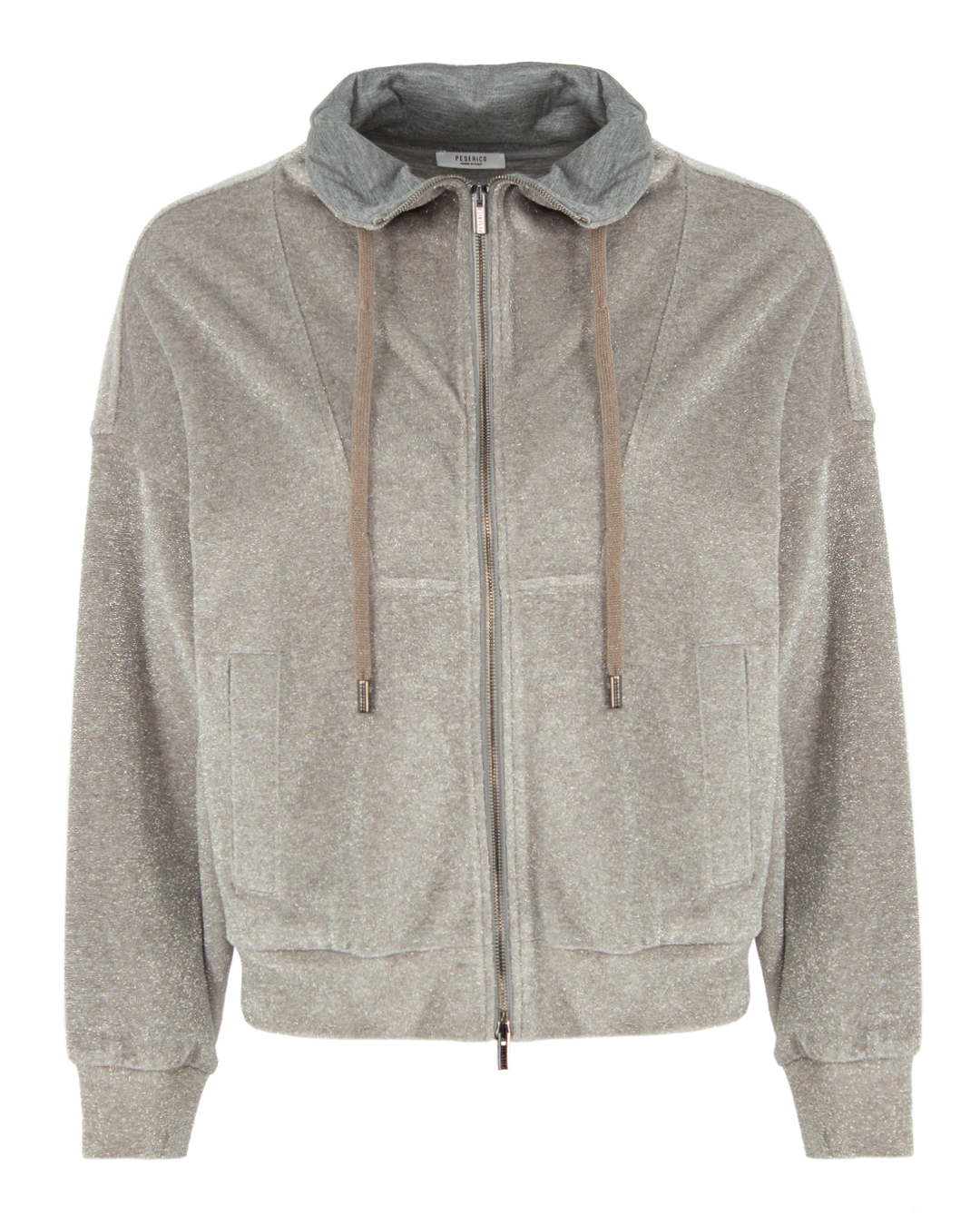 Олимпийка Peserico из трикотажной вискозы с добавлением блеска нитей люрекса. Модель прямого силуэта с застежкой на молнию дополнена завязками и двумя карманами по бокам.