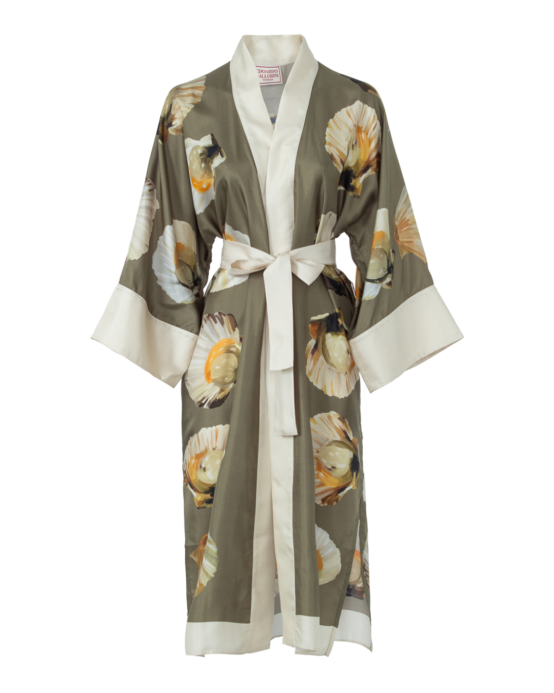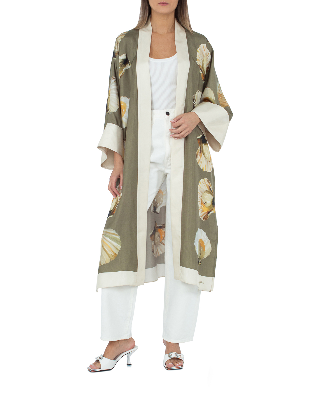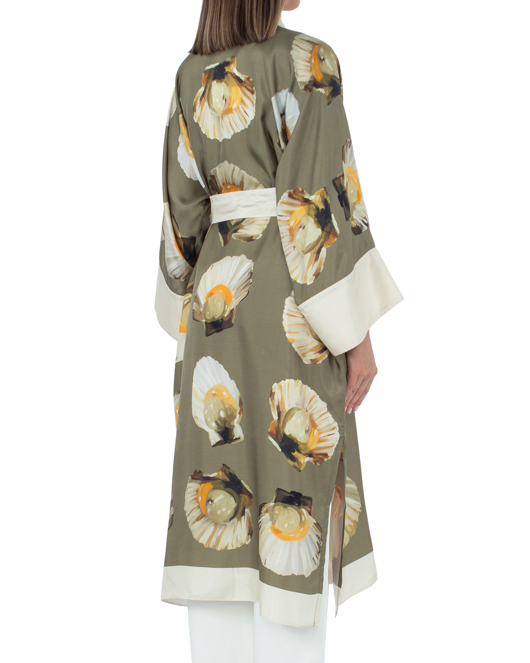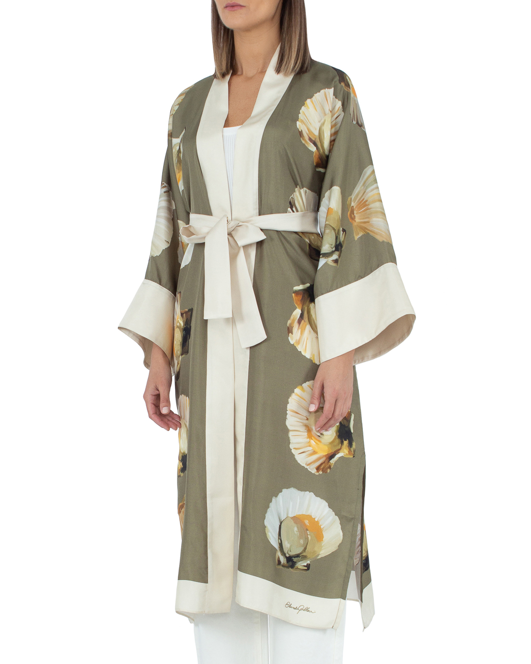 Кимоно из шелка с принтом. Модель длины макси со спущенной линией плеч и широкими длинными рукавами. Кимоно дополнено поясом из основного материала.