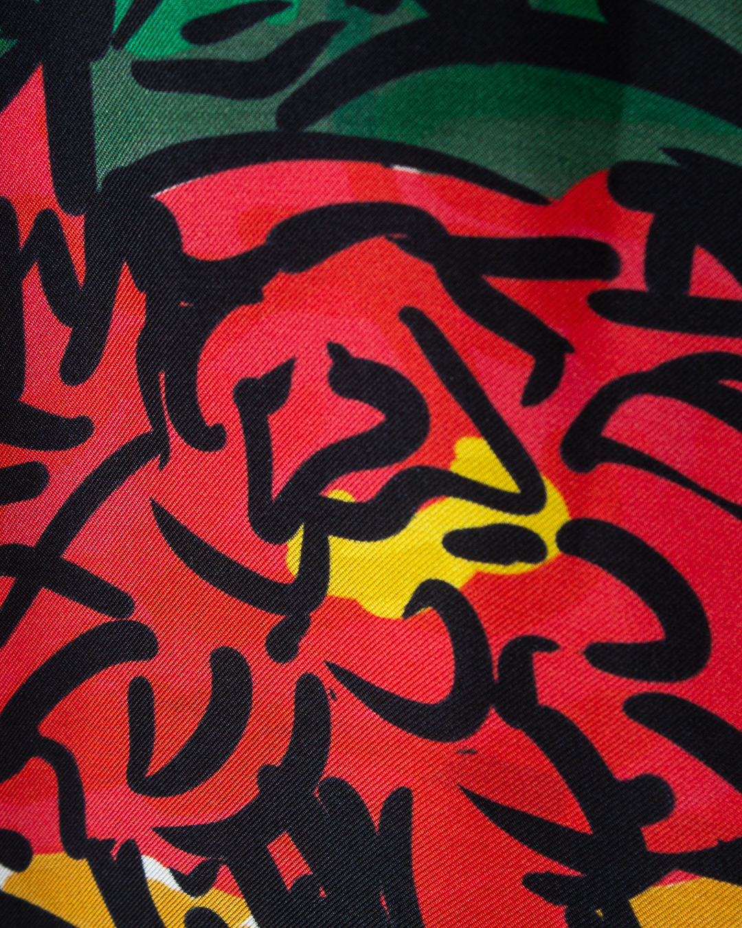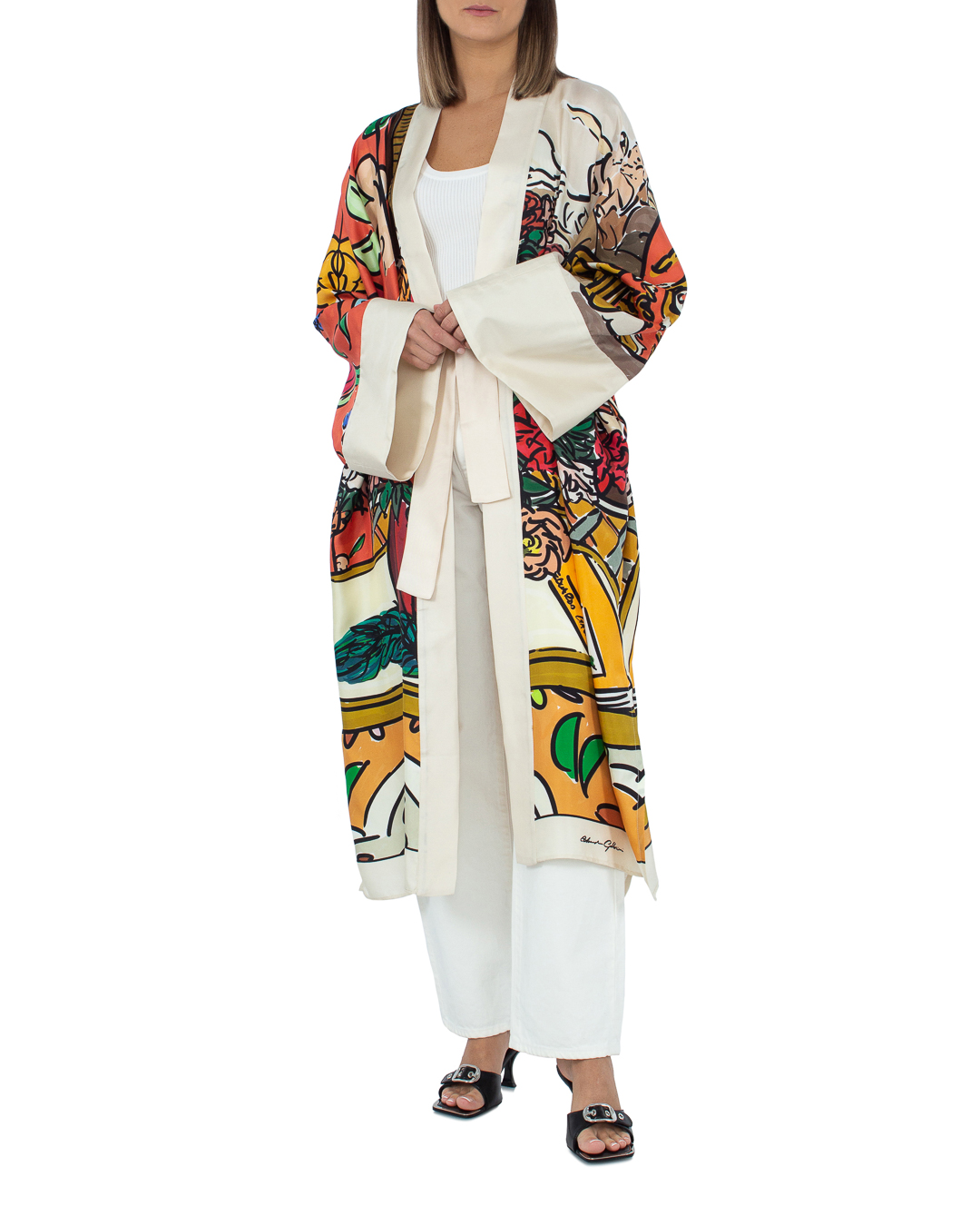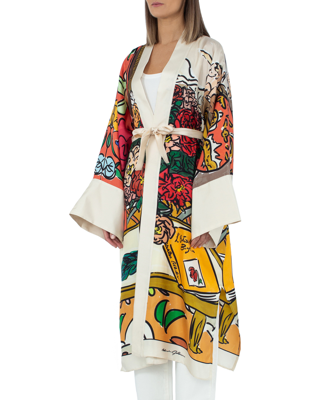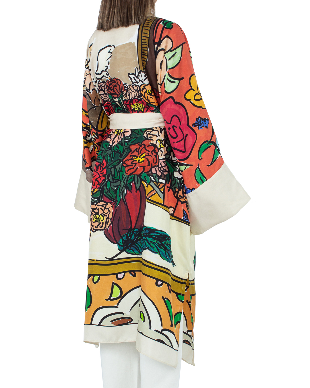 Кимоно из шелка с принтом. Модель длины макси со спущенной линией плеч и широкими длинными рукавами. Кимоно дополнено поясом из основного материала.