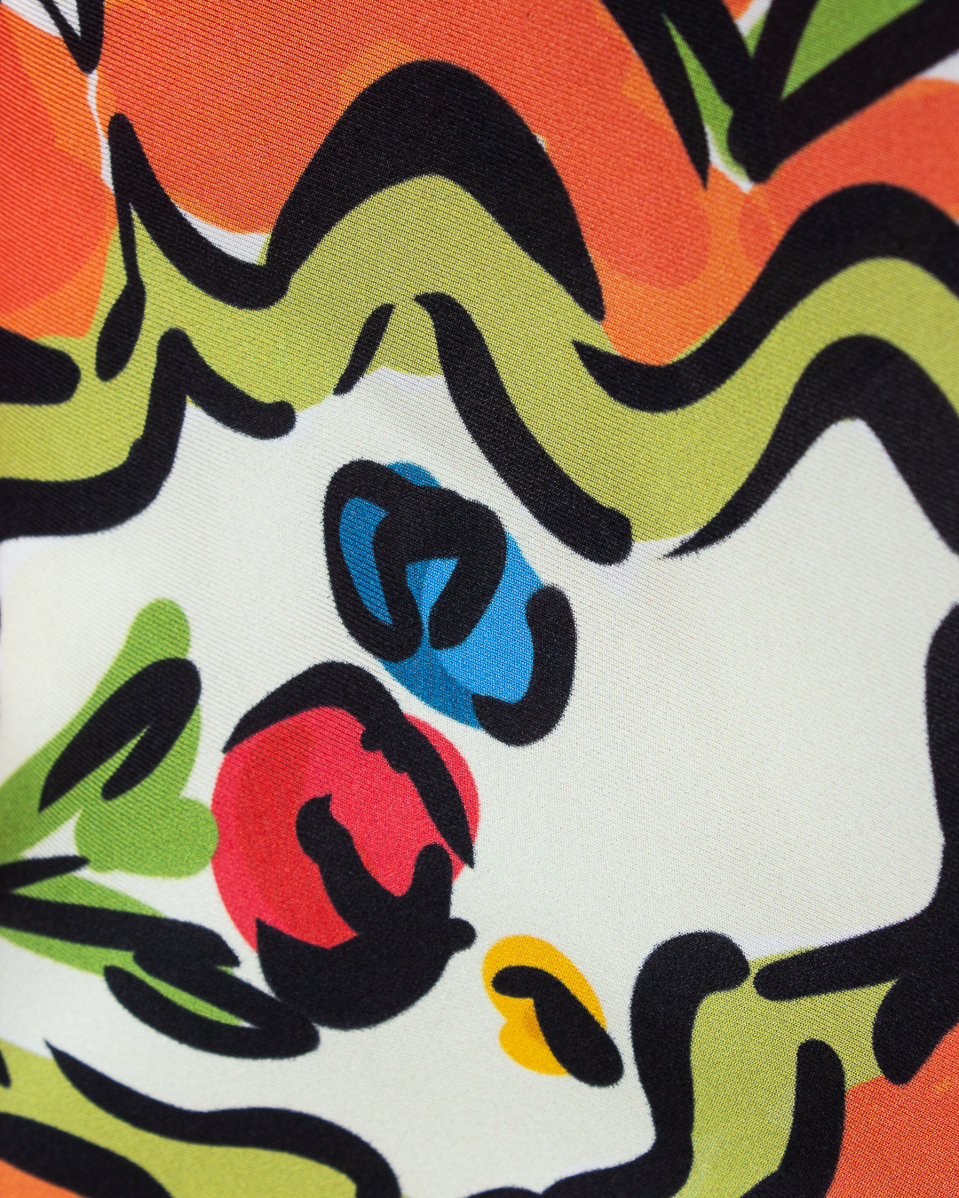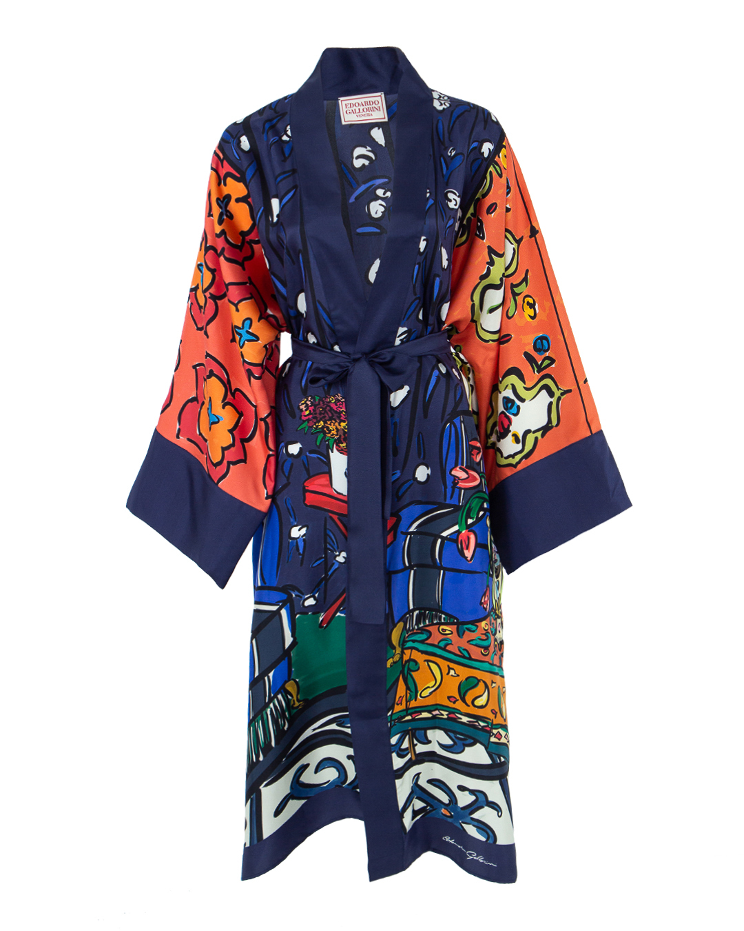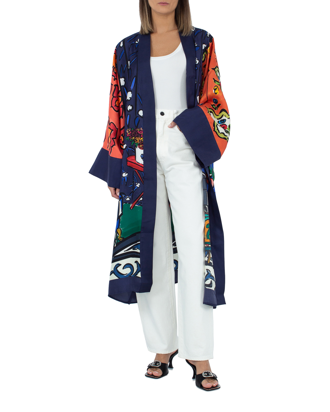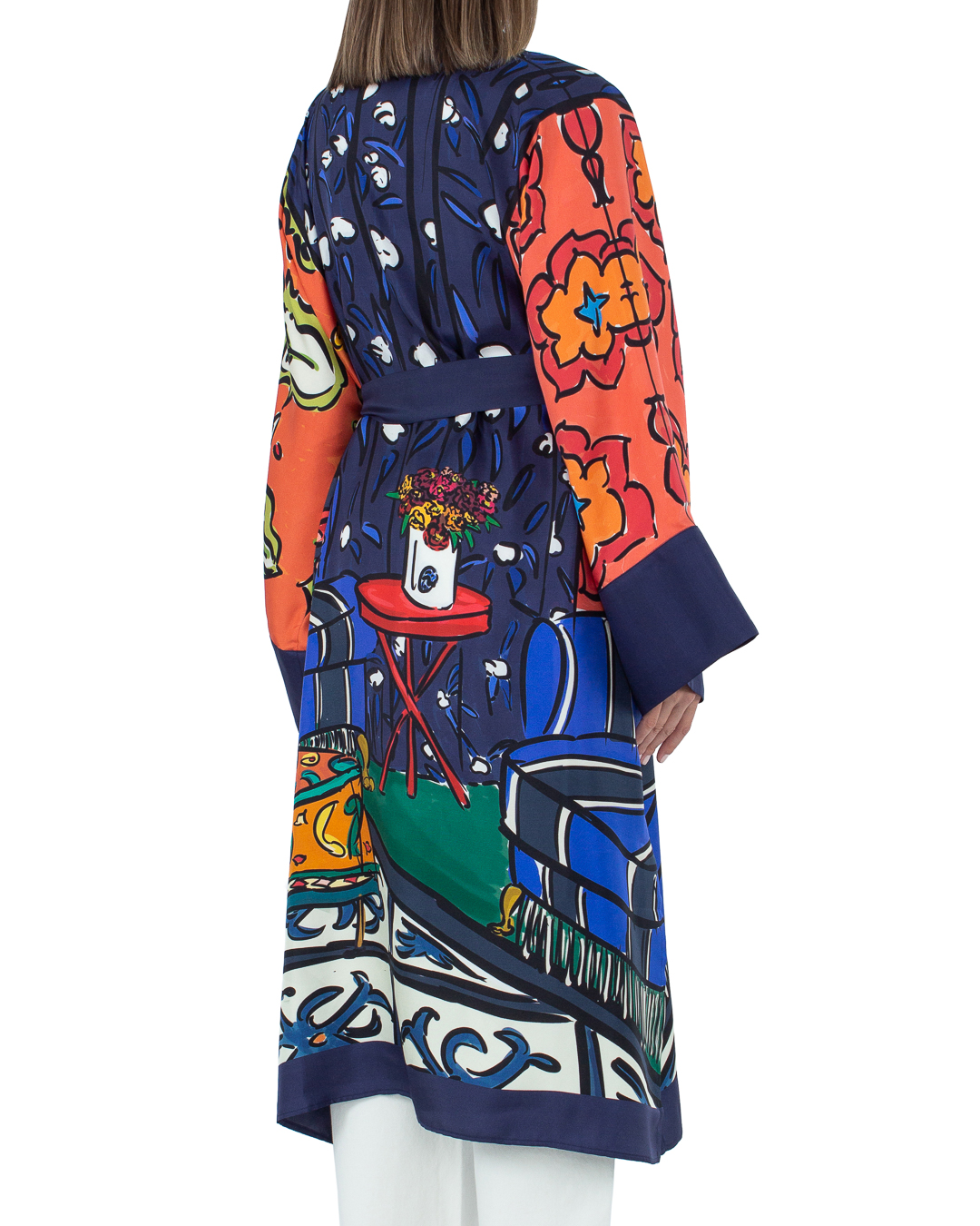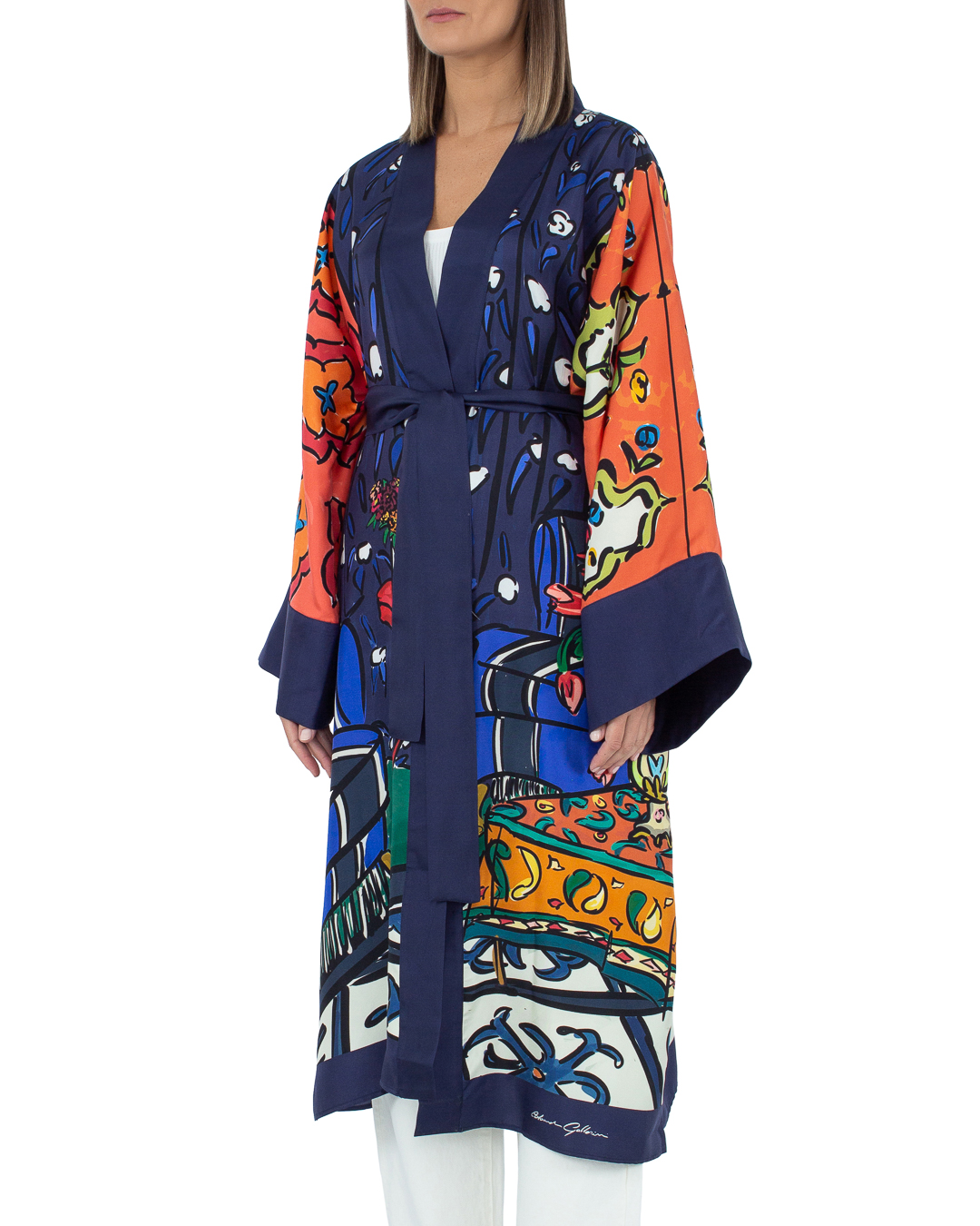 Кимоно из шелка с принтом. Модель длины макси со спущенной линией плеч и широкими длинными рукавами. Кимоно дополнено поясом из основного материала.