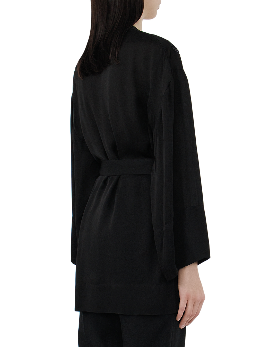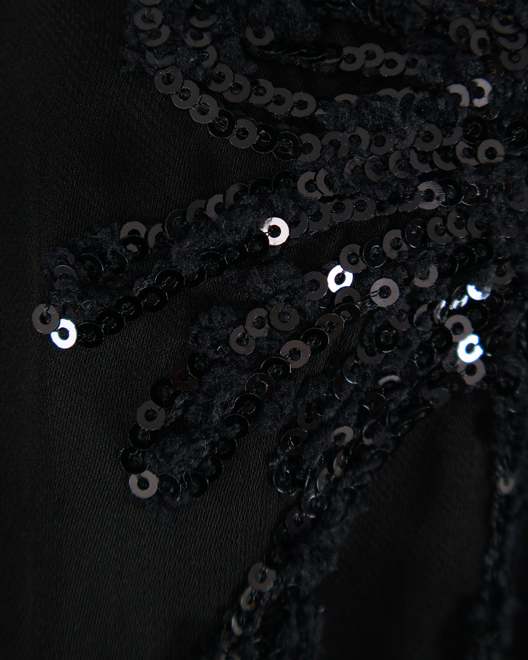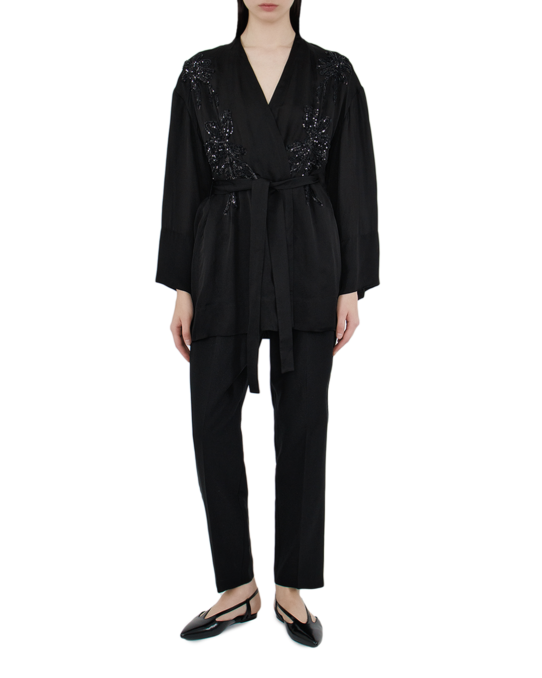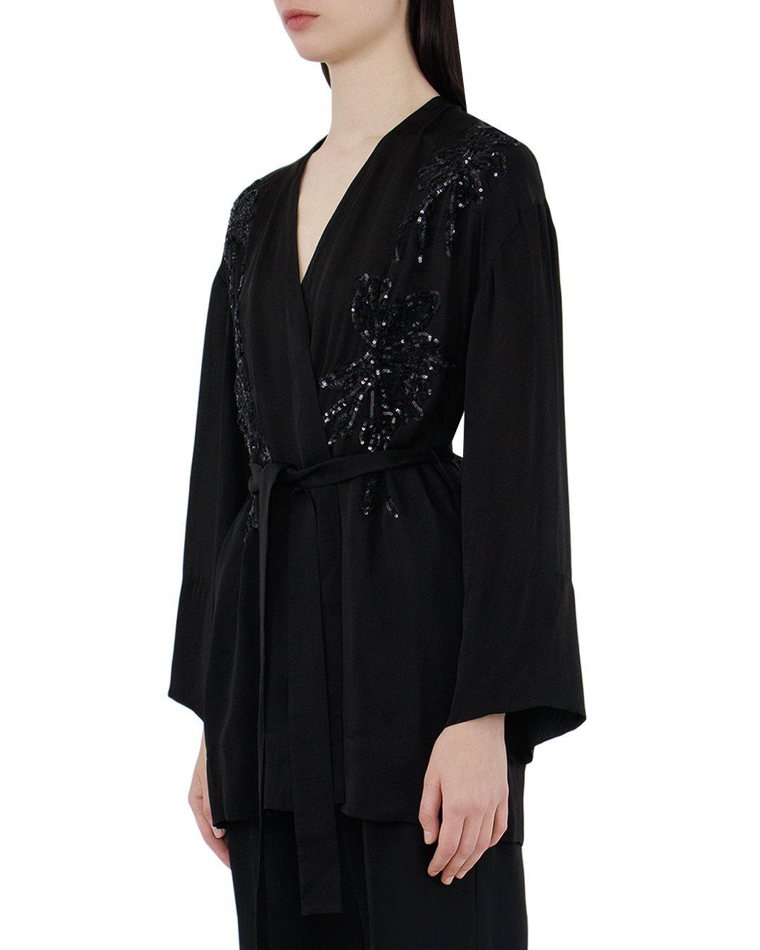 Этот кардиган — воплощение элегантной роскоши и изысканного стиля. Выполненный в глубоком чёрном цвете, он идеально подходит для создания утончённых вечерних образов. Лёгкая ткань и свободный крой обеспечивают комфорт и придают движениям грацию. Главным акцентом являются изысканные вышивка и пайетки на плечах, которые добавляют изделию гламурный блеск и привлекают внимание, превращая кардиган в ключевой элемент наряда. Широкий пояс на талии подчёркивает силуэт, создавая женственный и элегантный образ. Длинные рукава с расширенными манжетами придают модели нотку драматичности и стильный современный вид. Этот кардиган превосходно комбинируется с обтягивающими платьями или классическими брюками, добавляя вашему образу нотку холёной утончённости и неизменной привлекательности.